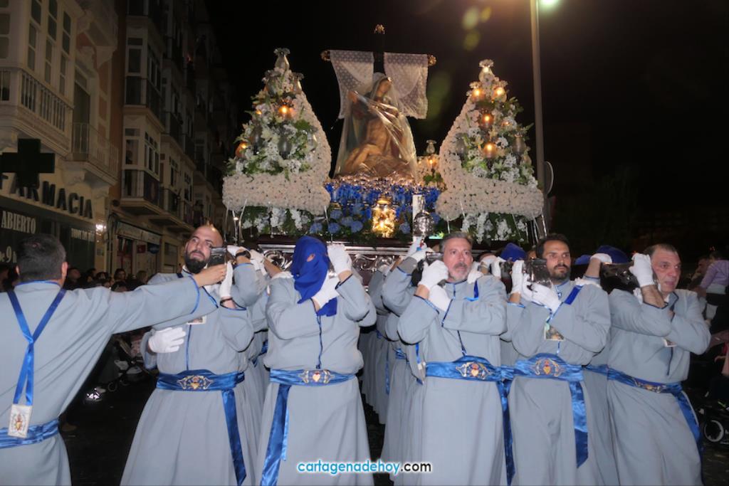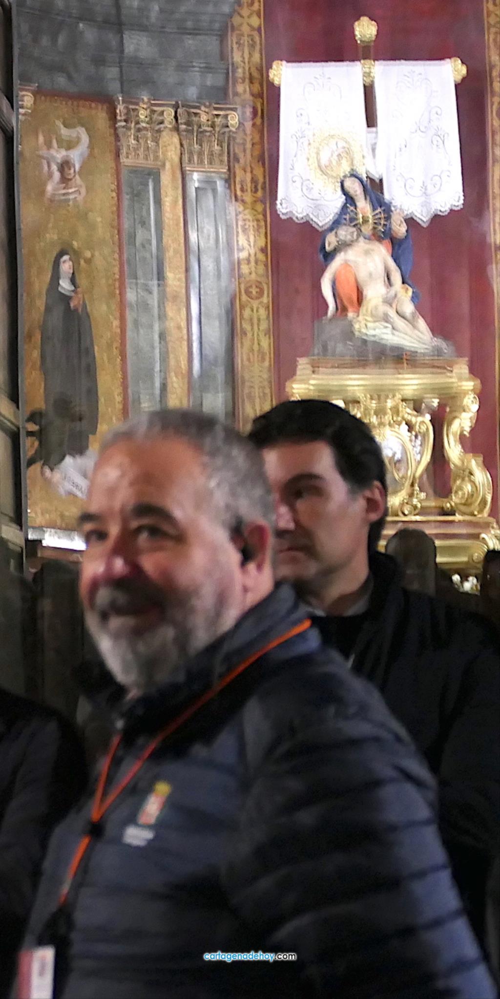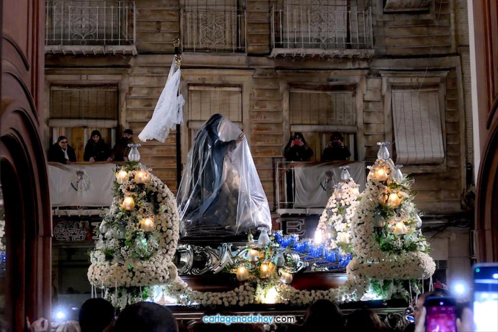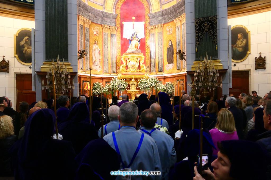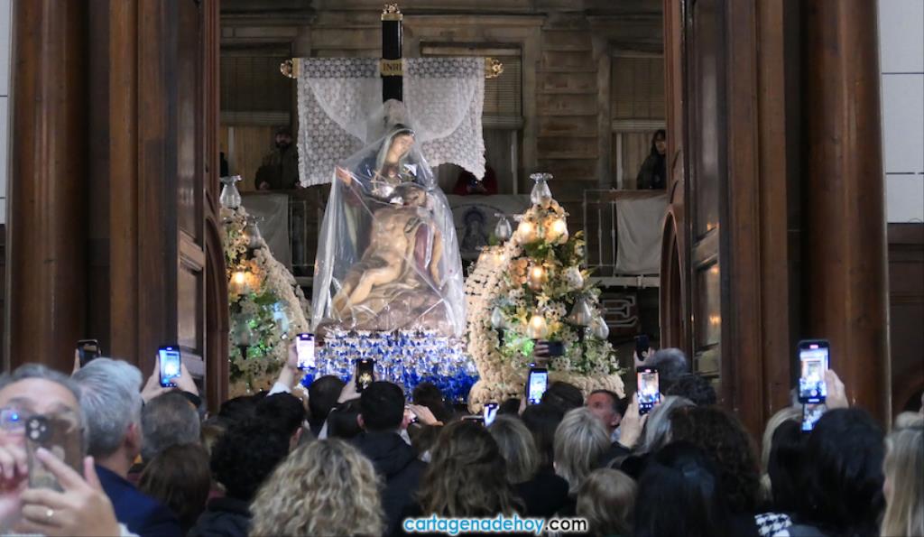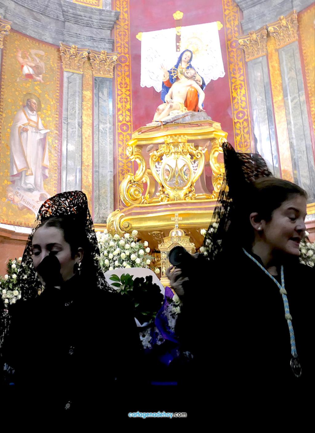 Como hemos indicado, momento muy especial fue cuando el trono llegó a la Real Basílica Menor de la Virgen de la Caridad y sus 160 portapasos lo giraron hasta poner a la Virgen de la Piedad frente a la patrona, la imagen que la motivó. Recordemos que la 'Caridad Chica' se creó para salvaguardar a la 'madre de los cartageneros' y que la representara en las salidas, pero que luego fue tal la devoción hacia ella que adquirió entidad propia como Virgen de la Piedad con 6 puñales en el corazón en lugar de 7, como lleva la Caridad.
