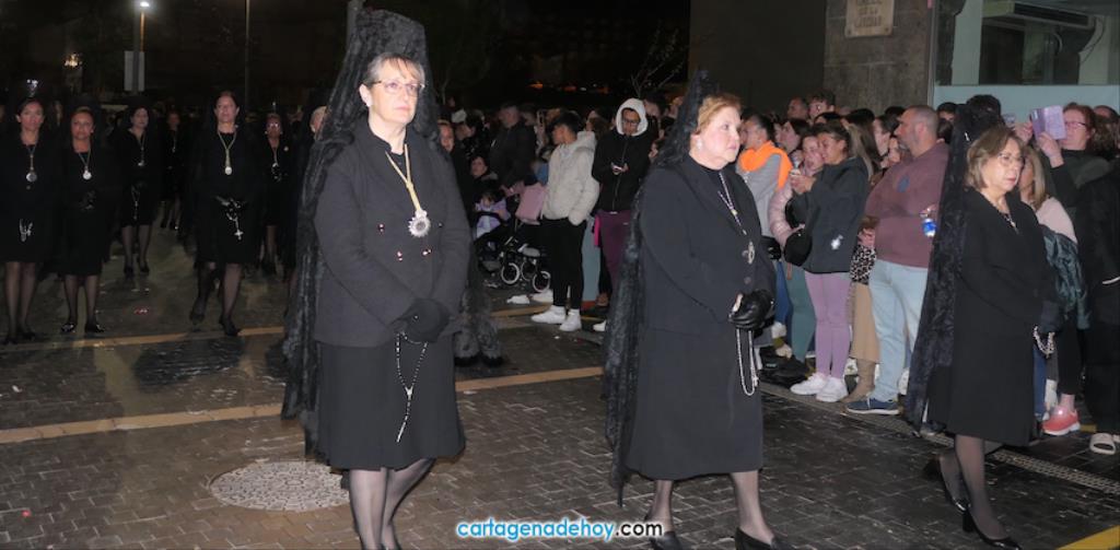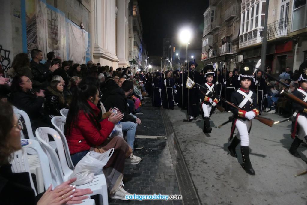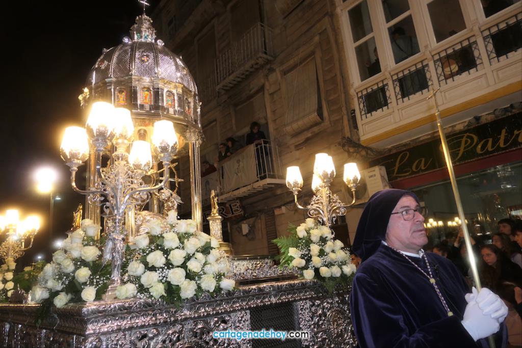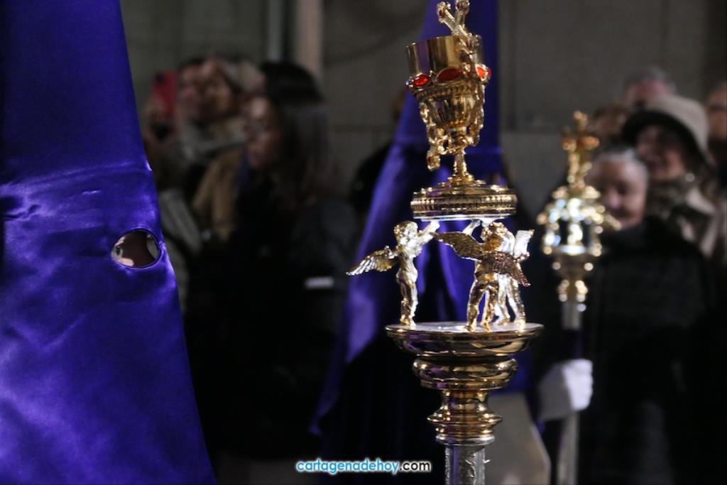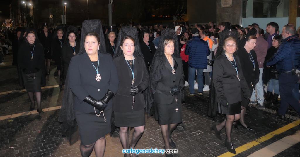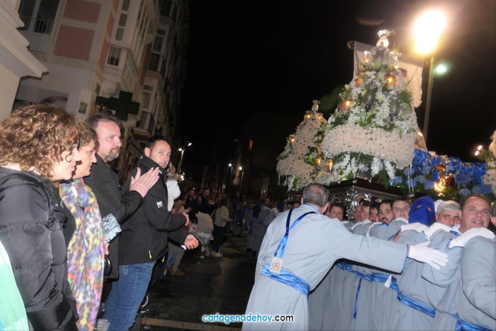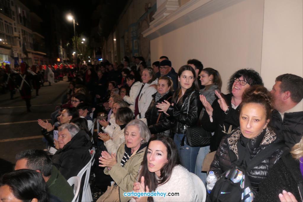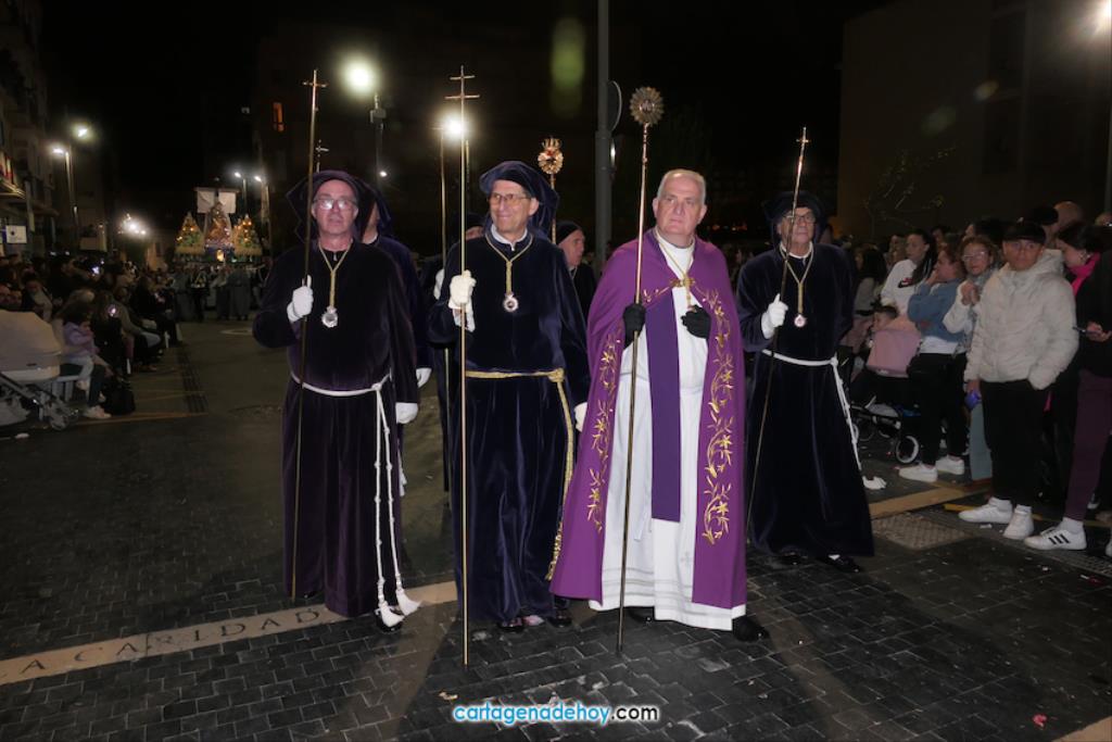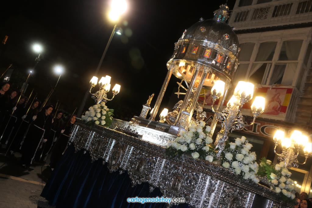 Como hemos indicado, momento muy especial fue cuando el trono llegó a la Real Basílica Menor de la Virgen de la Caridad y sus 160 portapasos lo giraron hasta poner a la Virgen de la Piedad frente a la patrona, la imagen que la motivó. Recordemos que la 'Caridad Chica' se creó para salvaguardar a la 'madre de los cartageneros' y que la representara en las salidas, pero que luego fue tal la devoción hacia ella que adquirió entidad propia como Virgen de la Piedad con 6 puñales en el corazón en lugar de 7, como lleva la Caridad.