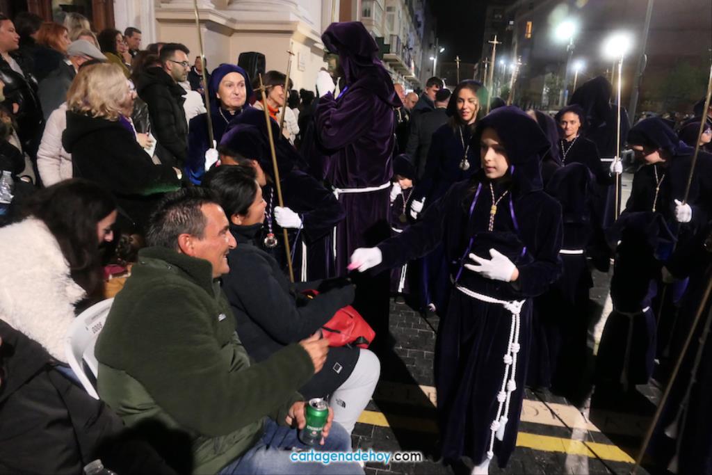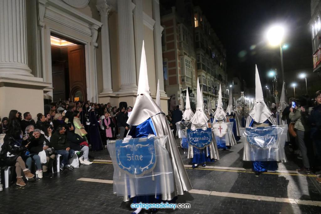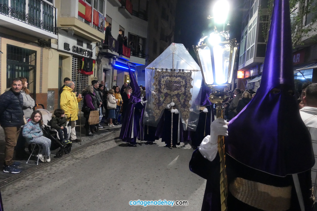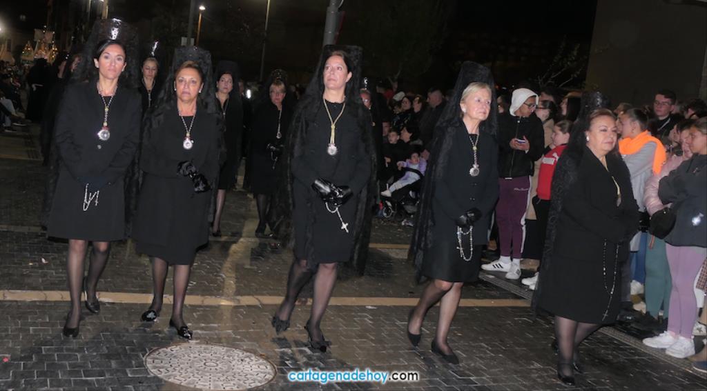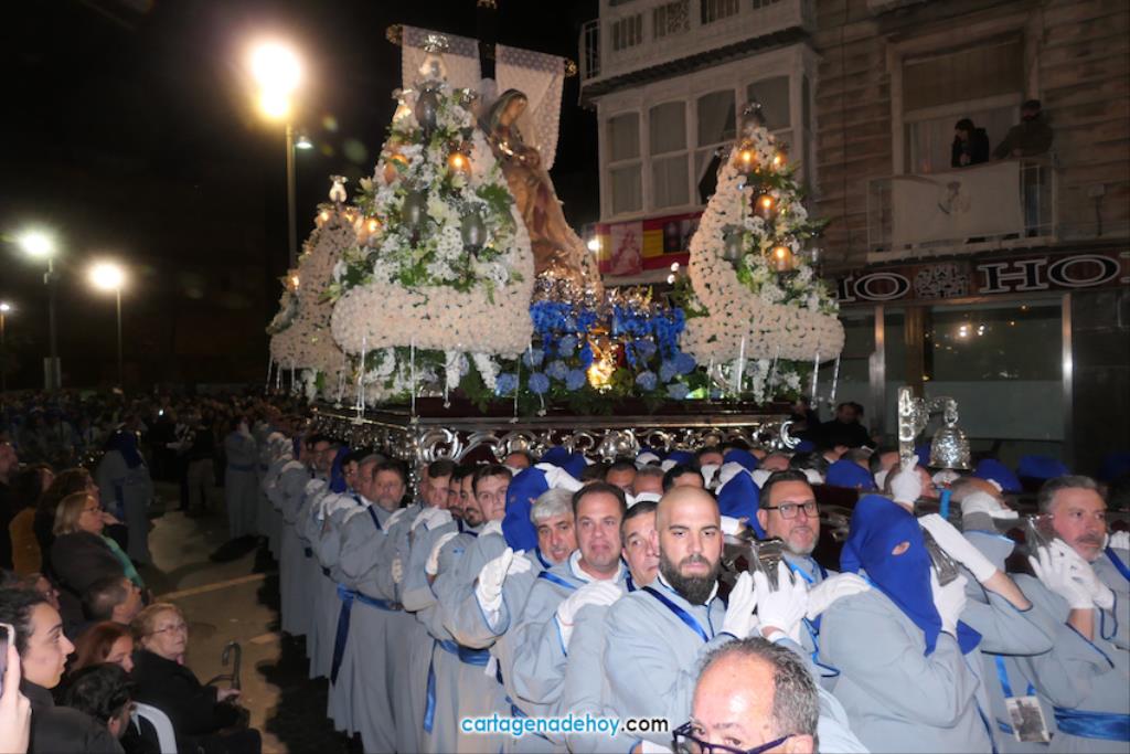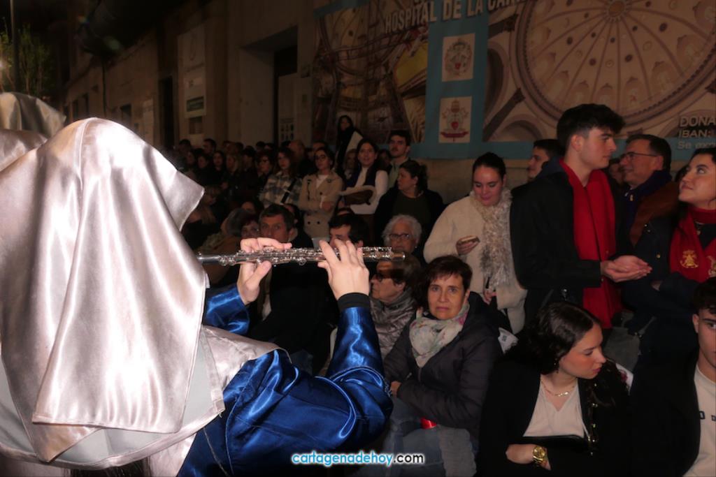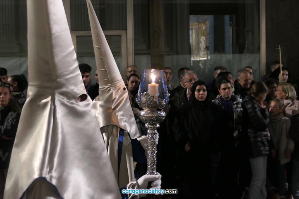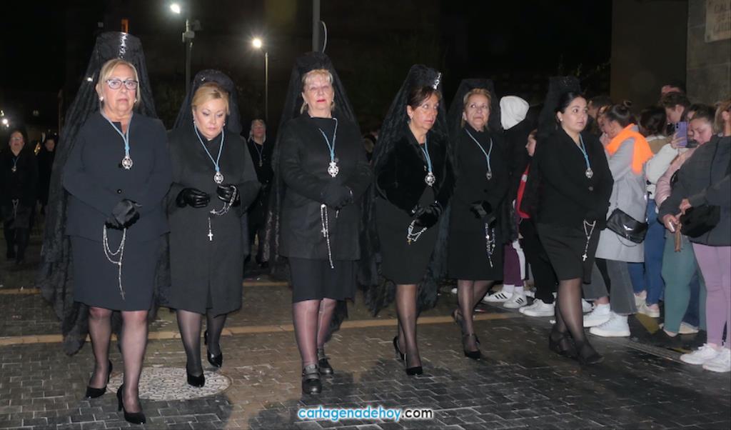 Como hemos indicado, momento muy especial fue cuando el trono llegó a la Real Basílica Menor de la Virgen de la Caridad y sus 160 portapasos lo giraron hasta poner a la Virgen de la Piedad frente a la patrona, la imagen que la motivó. Recordemos que la 'Caridad Chica' se creó para salvaguardar a la 'madre de los cartageneros' y que la representara en las salidas, pero que luego fue tal la devoción hacia ella que adquirió entidad propia como Virgen de la Piedad con 6 puñales en el corazón en lugar de 7, como lleva la Caridad.