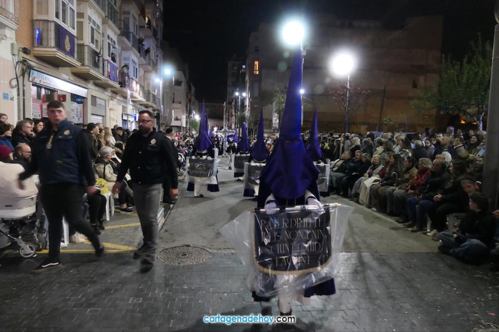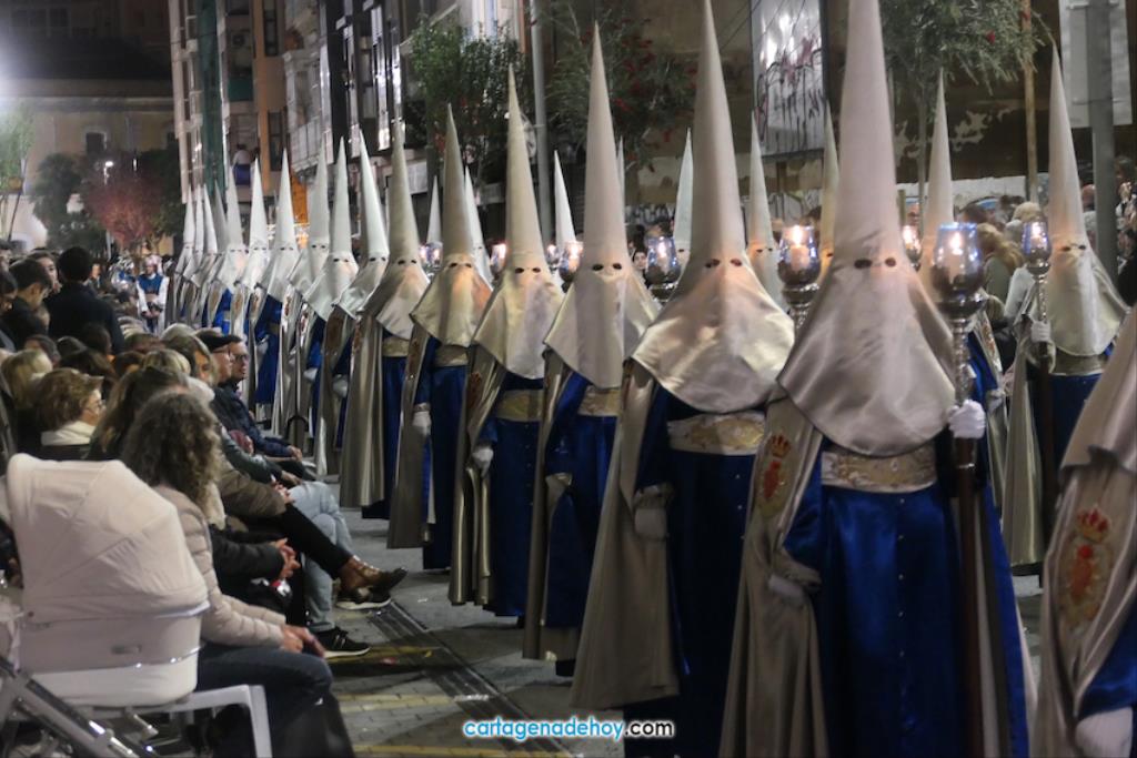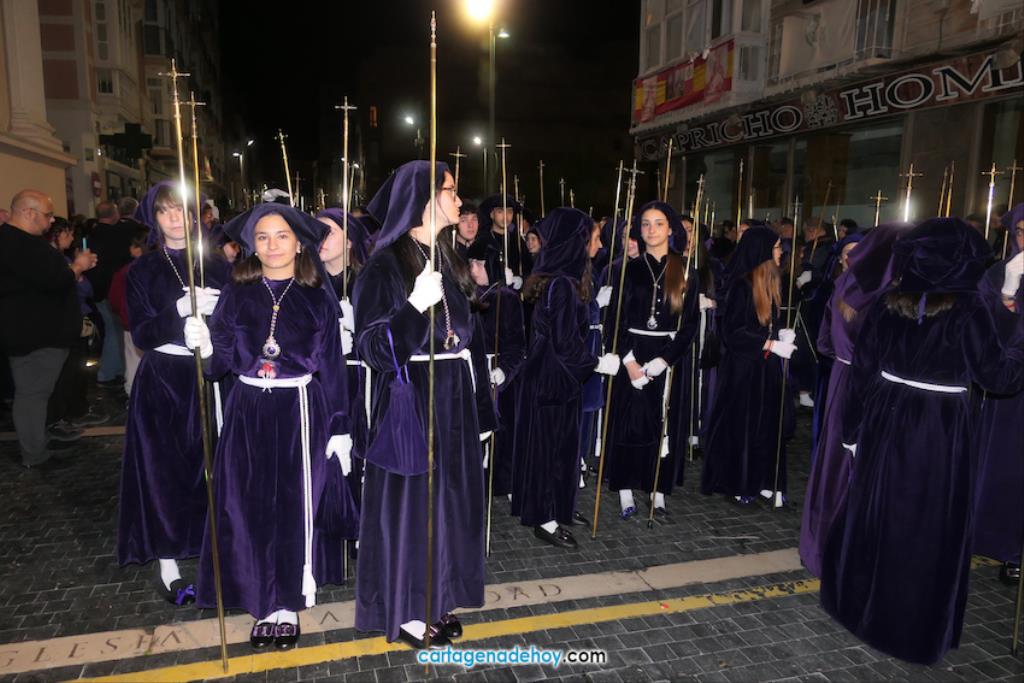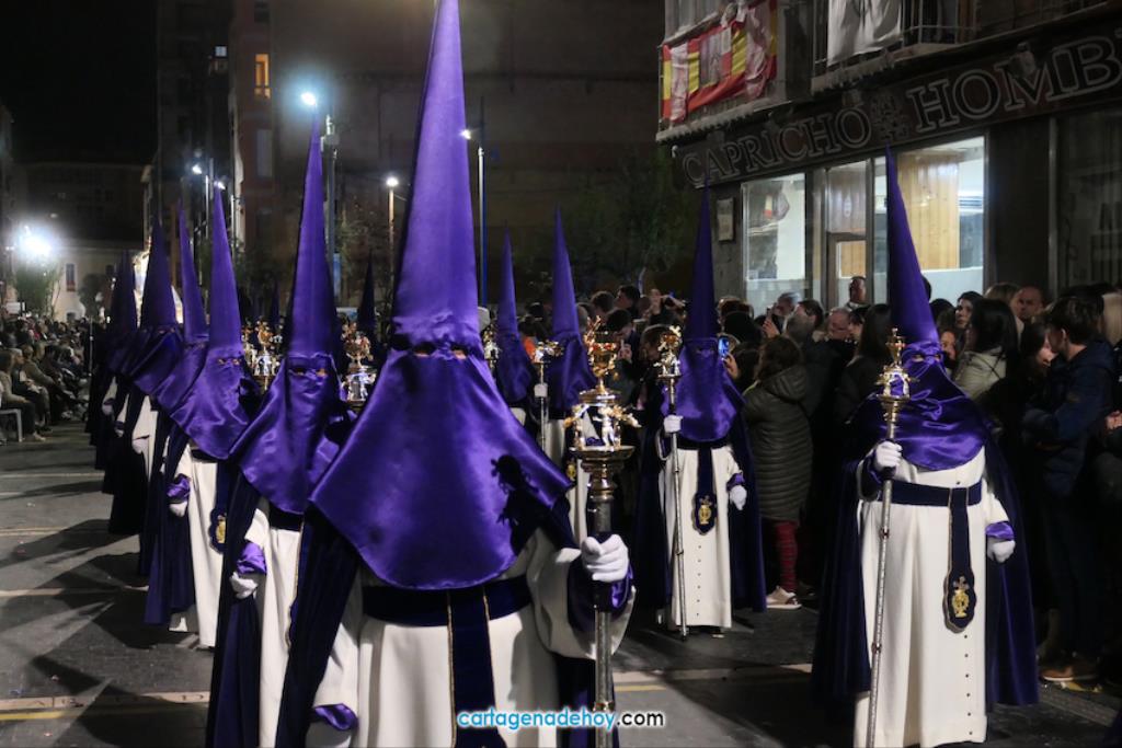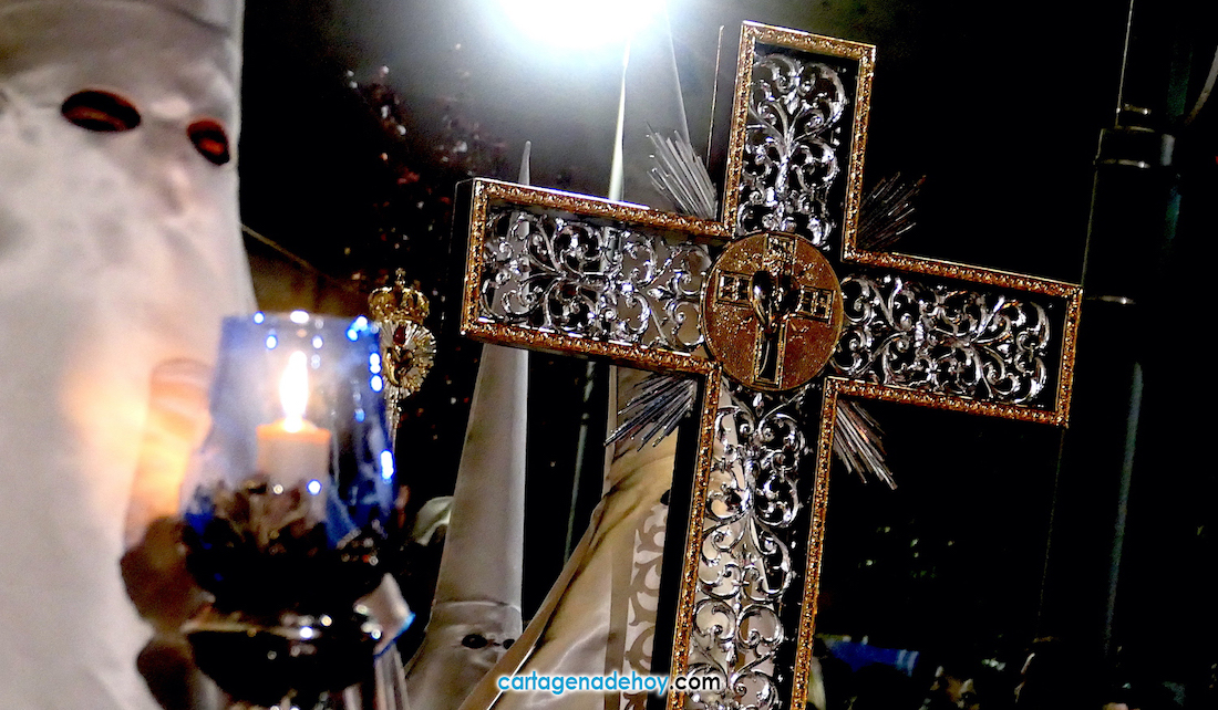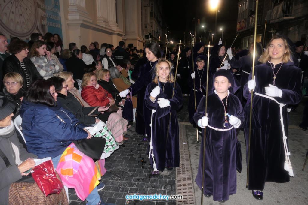 Vamos a la puesta en escena de esta procesión surgida de la fusión de un traslado del grupo escultórico que creó Capuz y el encaje de miles de sus promesas que alargaban el Entierro de Viernes Santo. Ahora es una procesión corta, pues sólo lleva tres tronos (Cáliz, cúpula de la Caridad y La Piedad), pero cargada de alicientes, pues, además de los antes mentados, están las doscientas manolas (muy llamativo ver tantas avanzar tan bien) y el buenhacer de todos los integrantes, desde granaderos a penitentes, sin olvidar a los pequeñines que van con banderines y otros enseres procesionistas. Sigue siendo excesiva la presencia de nazarenos, pero es cierto que son necesarios para crear cantera marraja.