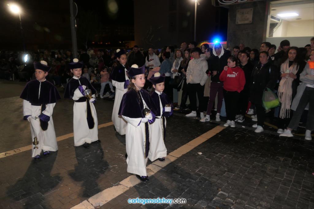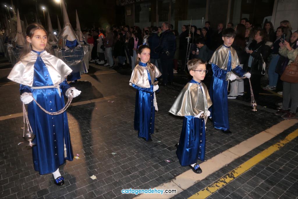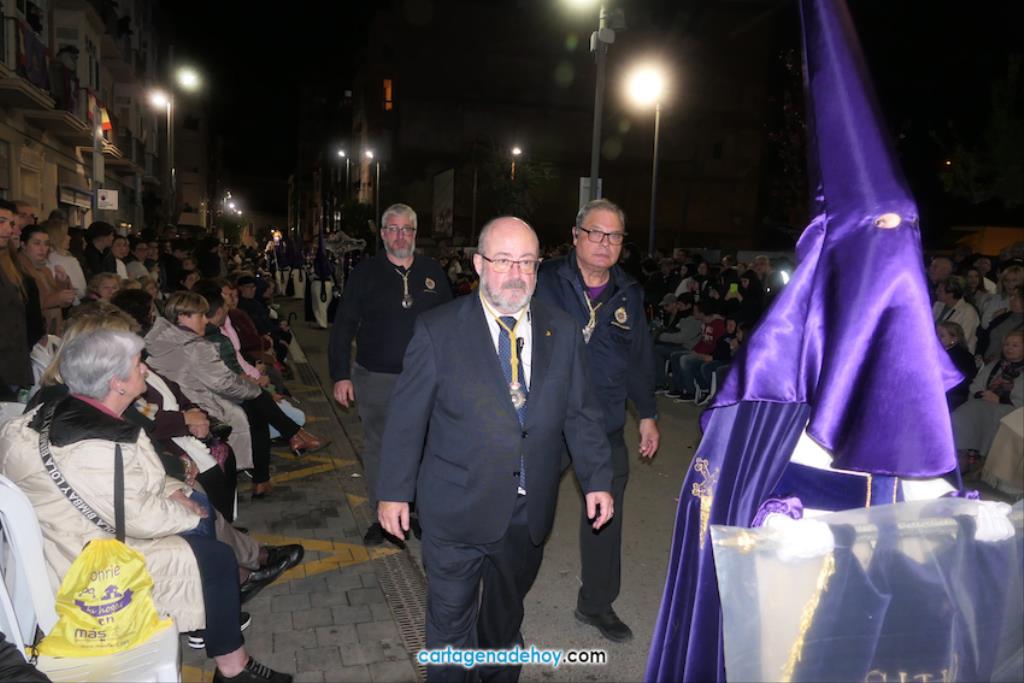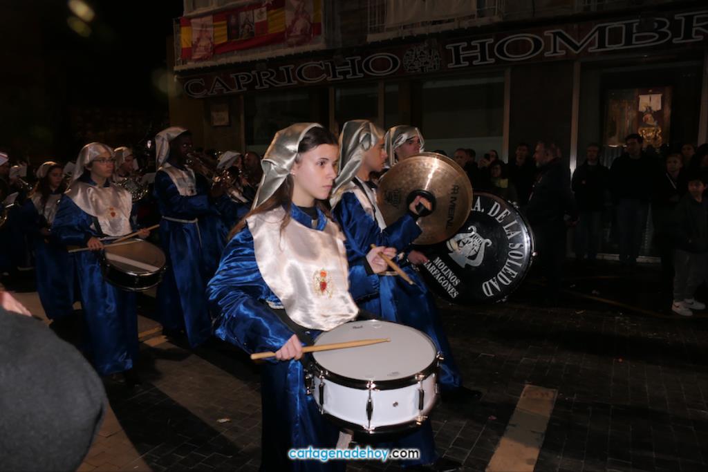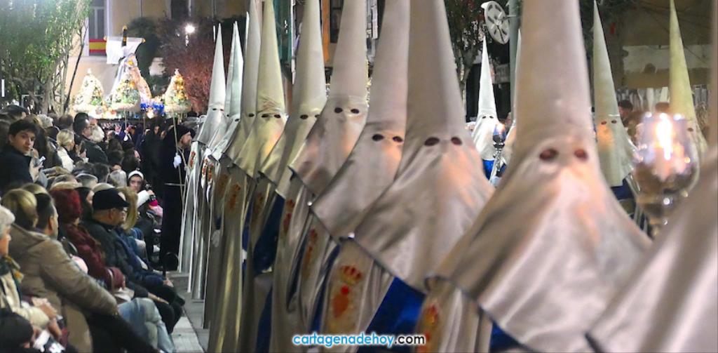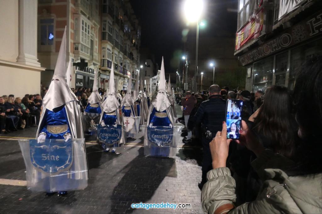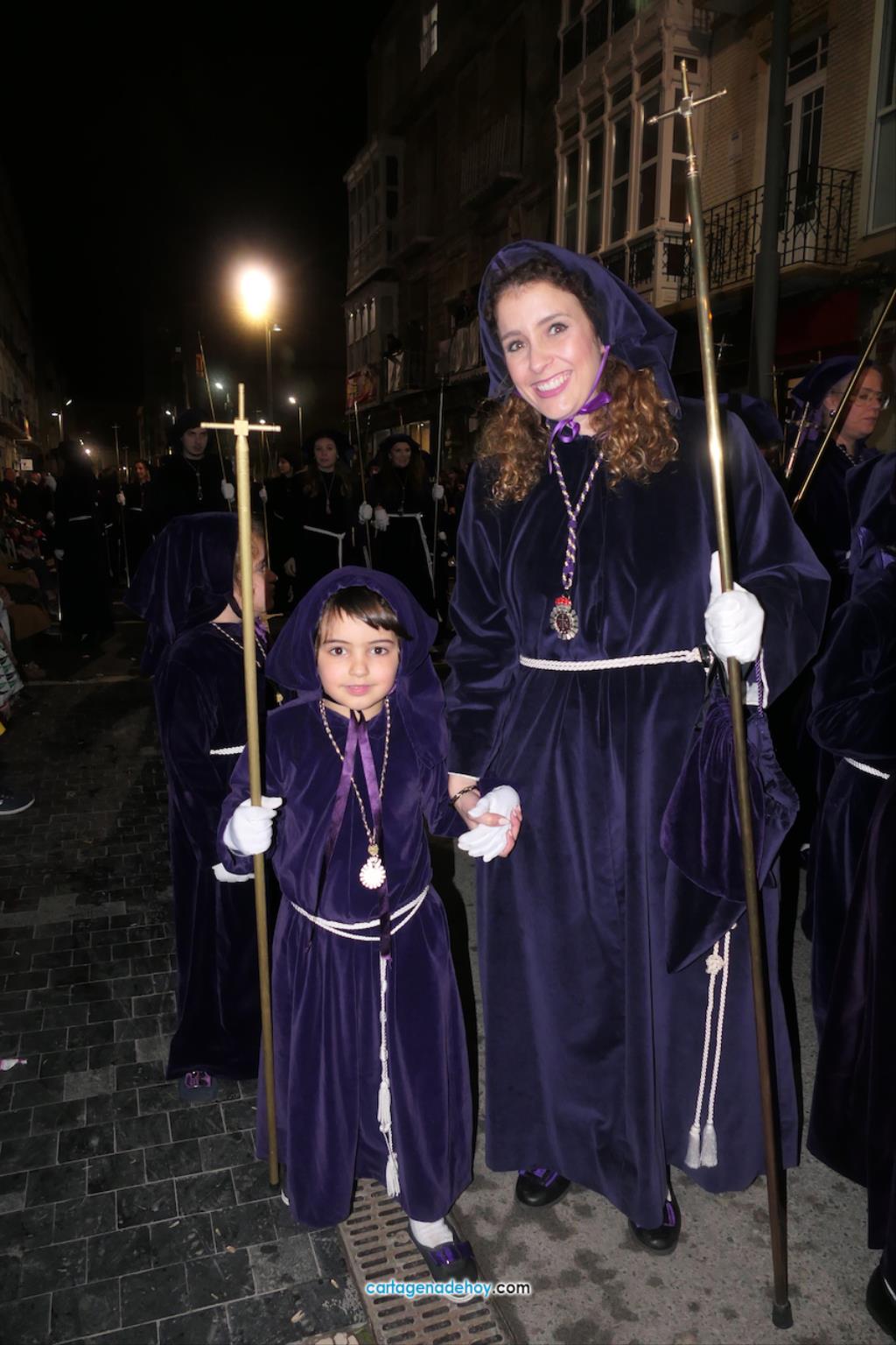 Vamos a la puesta en escena de esta procesión surgida de la fusión de un traslado del grupo escultórico que creó Capuz y el encaje de miles de sus promesas que alargaban el Entierro de Viernes Santo. Ahora es una procesión corta, pues sólo lleva tres tronos (Cáliz, cúpula de la Caridad y La Piedad), pero cargada de alicientes, pues, además de los antes mentados, están las doscientas manolas (muy llamativo ver tantas avanzar tan bien) y el buenhacer de todos los integrantes, desde granaderos a penitentes, sin olvidar a los pequeñines que van con banderines y otros enseres procesionistas. Sigue siendo excesiva la presencia de nazarenos, pero es cierto que son necesarios para crear cantera marraja.