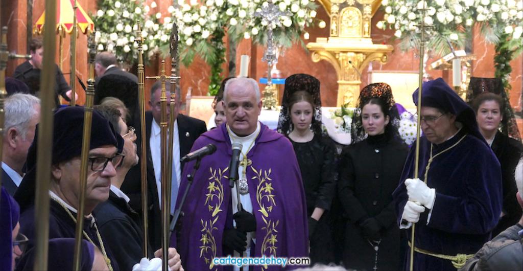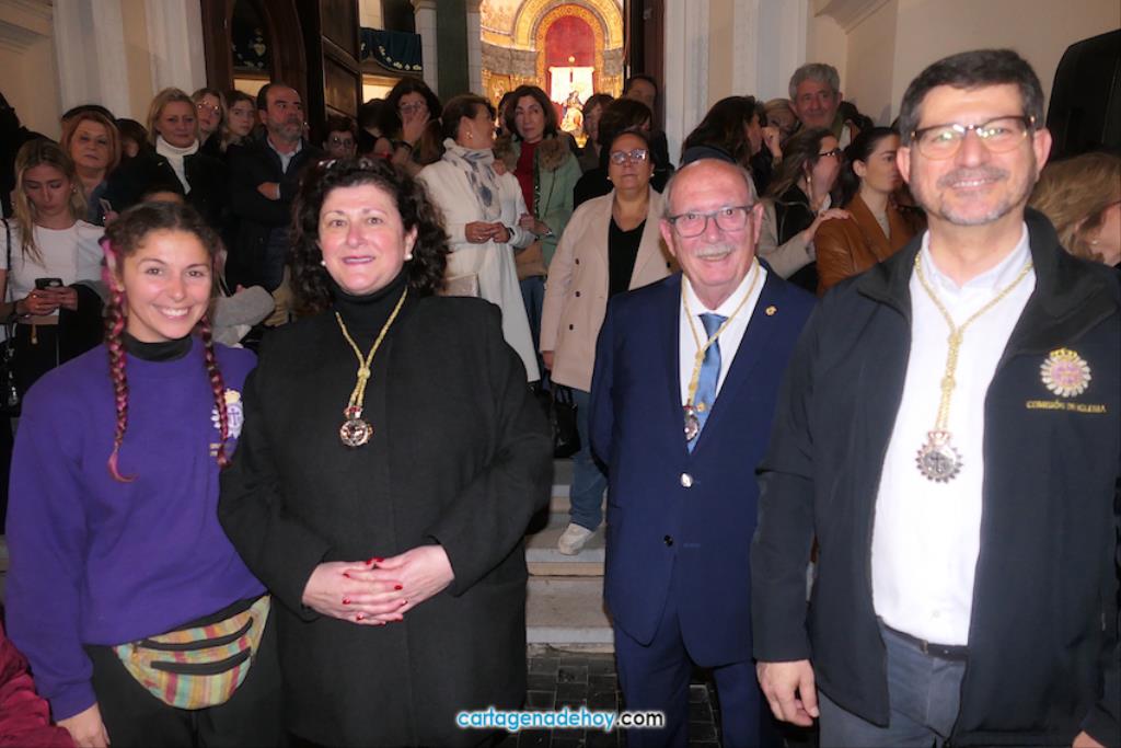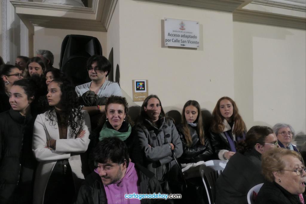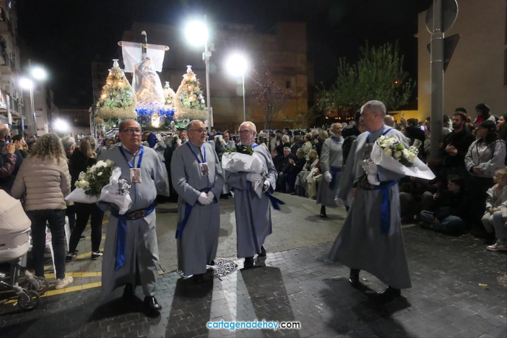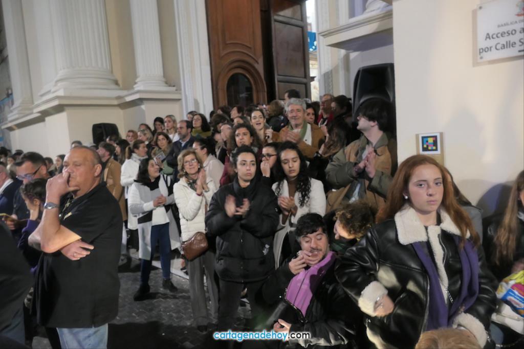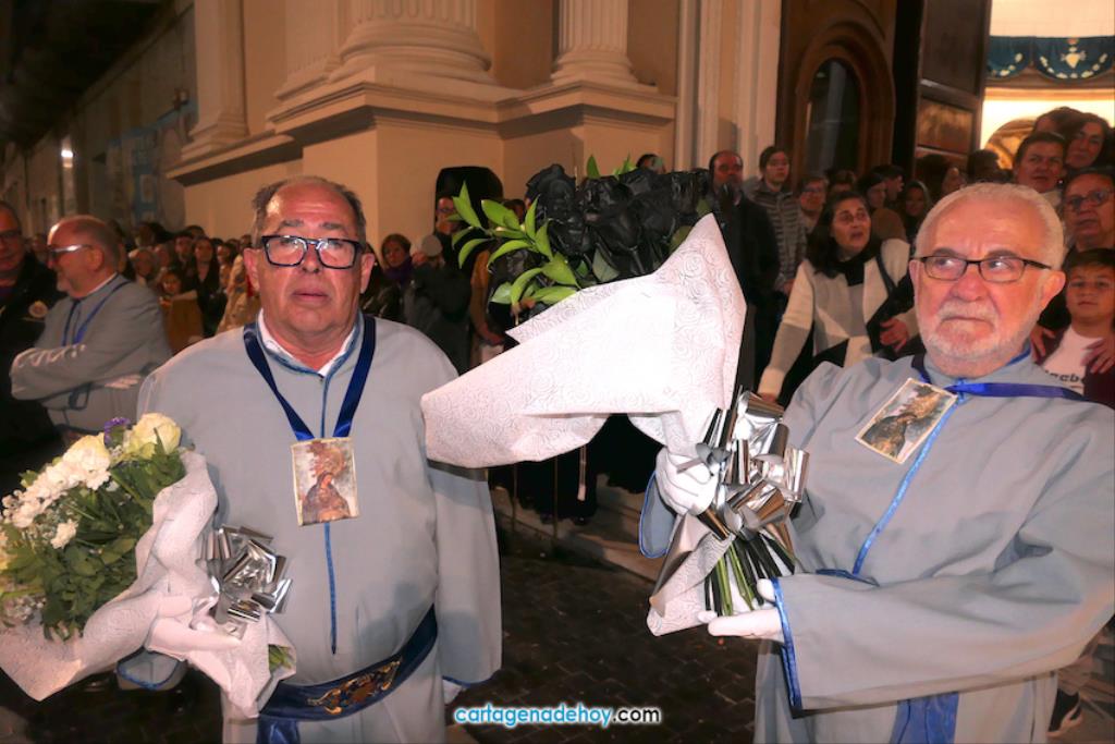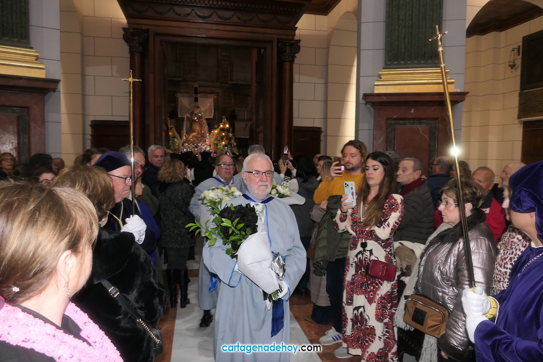 El grupo de portapasos entregó varios ramos de flores, siendo llamativo el de rosas negras que llevaba Vicente Mendoza, director general de la UCAM. Esas singulares flores azabachadas que vienen cada año desde Holanda fueron entregadas a la Caridad, tras unas palabras del capellán marrajo y pregonero de la Semana Santa'24, Fernando Gutiérrez Reche, y el emotivo canto de la Salve entre todos los que estaban en el exterior y los que abarrotaban el interior de la basílica. Después se depositó el ramo en la parte superior de una montaña de flores blancas, teniendo cada ramo su sentido.