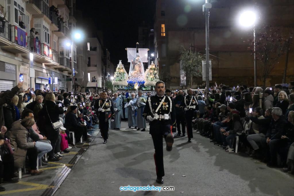 Después, y tras escuchar una saeta, la comitiva marchó hacia el tramo final de la recogida, donde otra Salve envolvió a La Piedad, esta vez en la emotiva y espectacular recogida con himno de España, honores, repique de campanas, cohetes, etc.