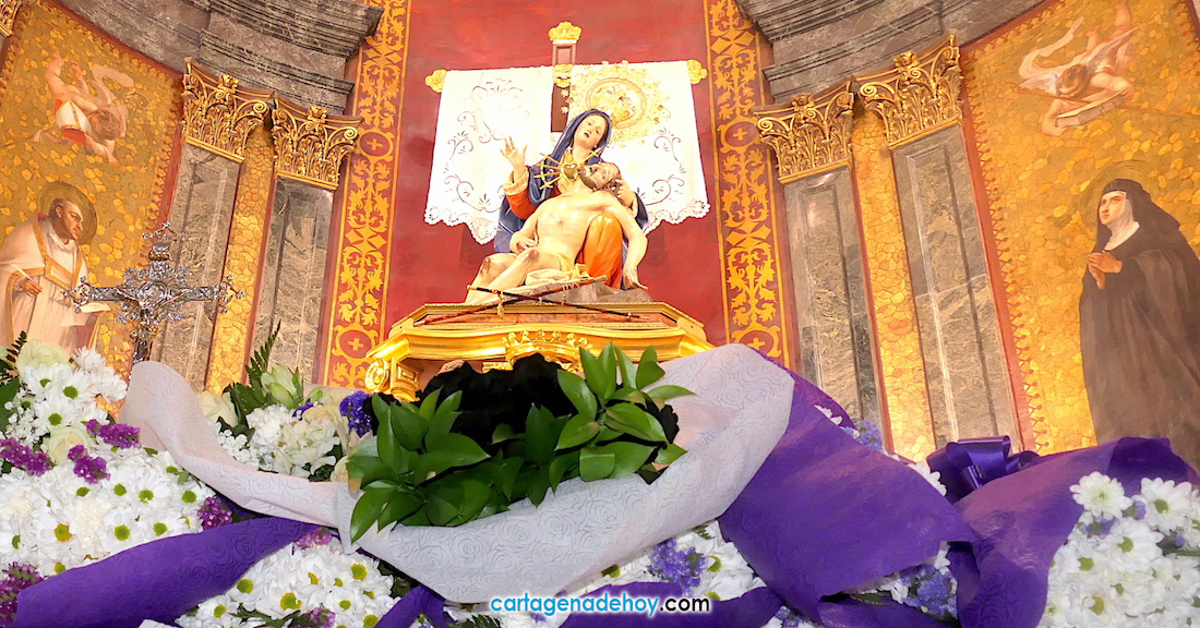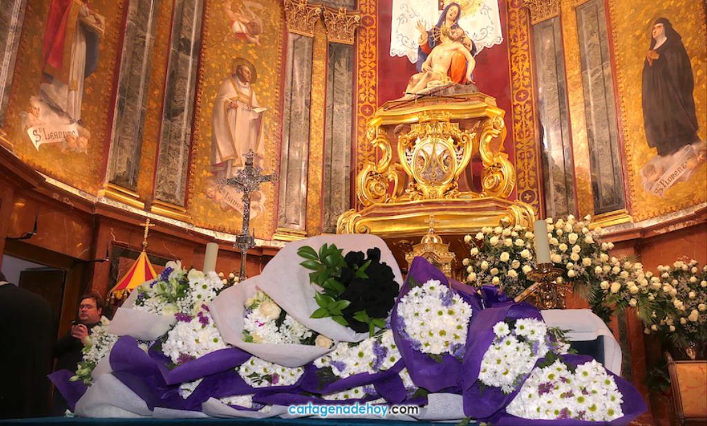 ¿Qué significan las flores negras? La respuesta es que recuerdan el día en que se evitó que la Virgen de la Caridad fuese quemada por cartageneros. Sucedió nada más comenzar la triste Guerra Civil española, un 25 de julio de 1936, cuando un numeroso grupo de ciudadanos se presentó en la iglesia para saquearlo y quemar las imágenes, como habían hecho en otros templos. Sin embargo, en este caso no lo consiguieron gracias a la acción de prostitutas y de un concejal del ayuntamiento, el comunista Miguel Céspedes. 'Caridad al Negra' fue quien condujo al grupo de mujeres ante la puerta de la basílica, donde formaron una barrera junto al edil. Finalmente, el gentío se marchó. Tras el conflicto bélico, se apunta que desde 1947, Caridad tuvo la costumbre de depositar cada Viernes de Dolores una ramo de rosas negras a la patrona. Al parecer, se trataba de flores de color rojo muy oscuro que en aquella época estaban en los jardines de Cartagena. Caridad falleció en 1960 y a principios de este siglo XXI la tradición fue recuperada por la agrupación de portapasos promesas de la Virgen de la Piedad.