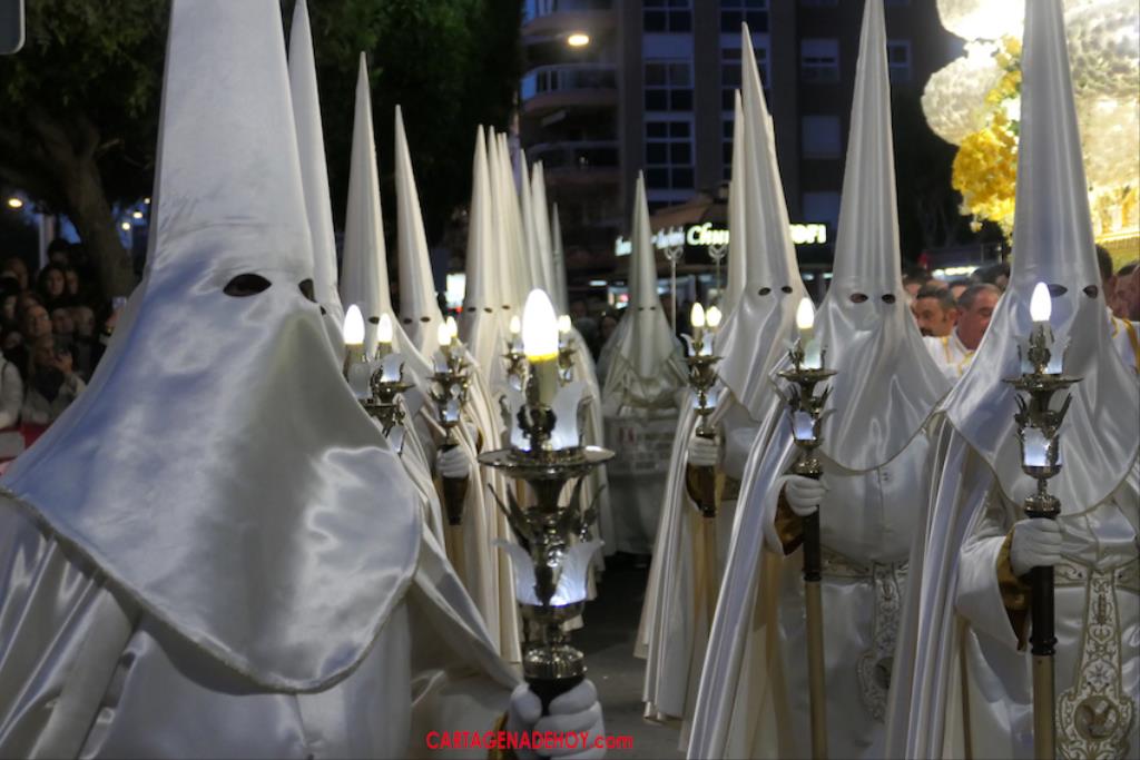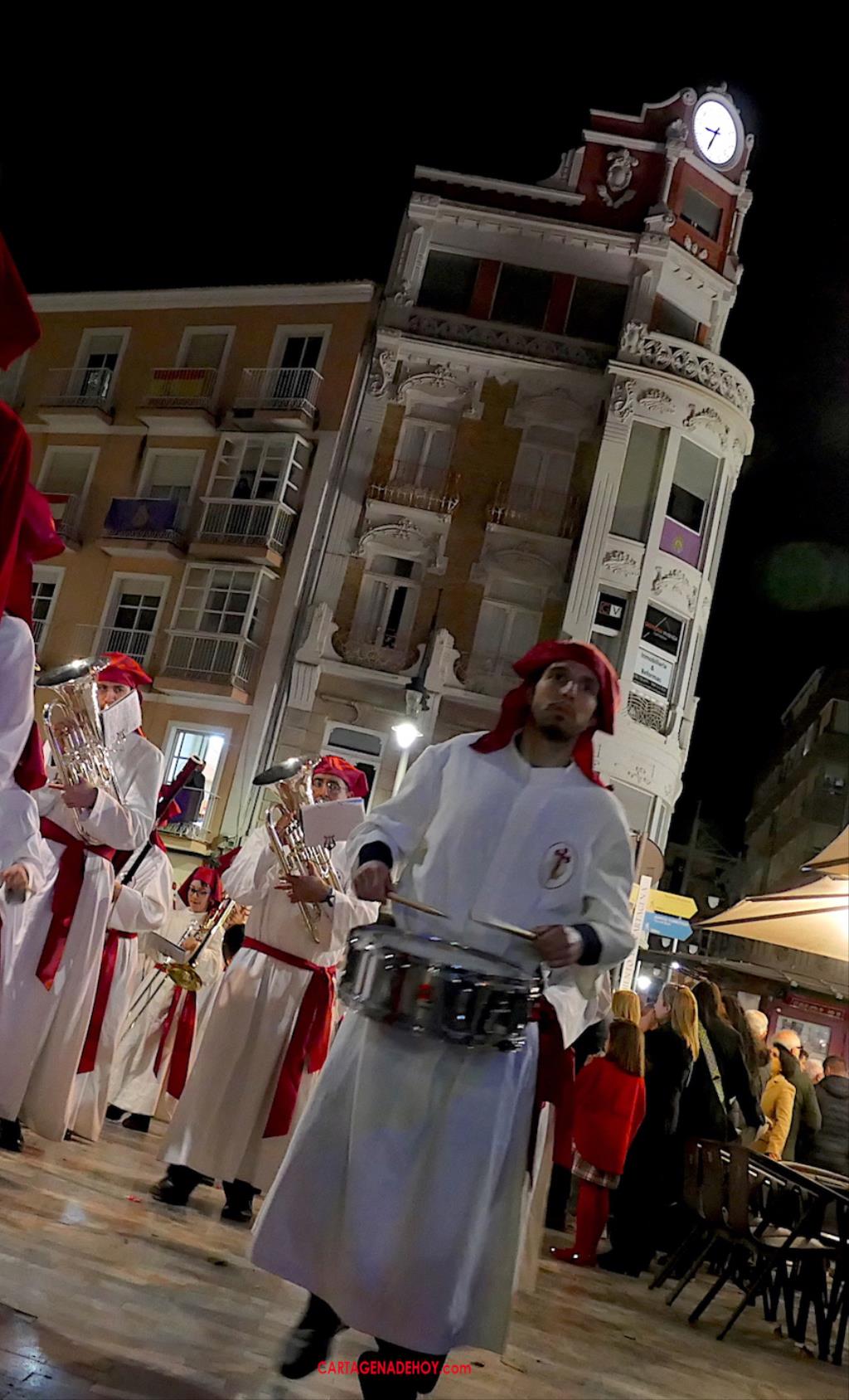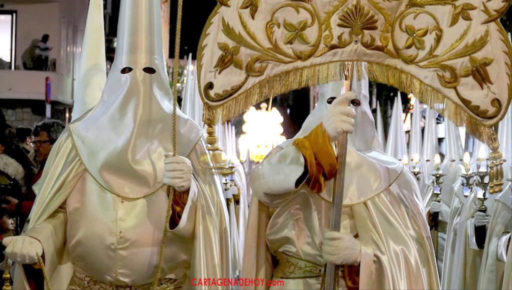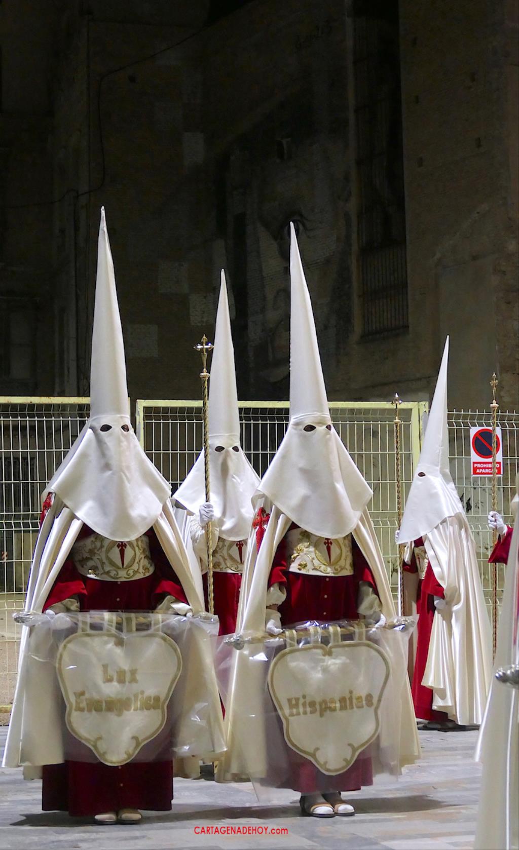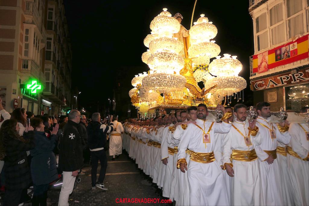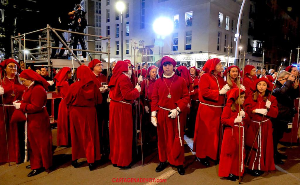 Las procesiones de este Martes Santo han salido más temprano de lo habitual debido a que este año ha tenido lugar antes del cambio horario. Así, dos de los desfiles (Juan y Santiago) estaban en la calle cuando los comercios todavía estaban abiertos en el casco antiguo. Después, poco antes de las nueve, se incorporó a las calles San Pedro en una noche estrellado y con una hermosa luna que desterraba cualquier riesgo de lluvia, nuevamente, el gran temor de la jornada y más después de conocer que en algunos puntos de la Región de Murcia se habían suspendido procesiones por las previsiones de que iba a llover esta noche. Sin embargo, además de los cuestionables pronósticos, en esta zona parece que tenemos un clima diferente, que unos justifican a lo que envía al cielo Escombreras, entre otras causas. No lo sabemos, pero sí que se ha convertido en otra singularidad de esta tierra.