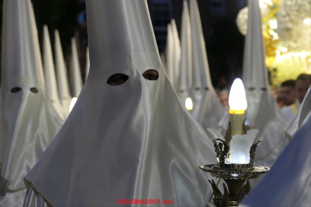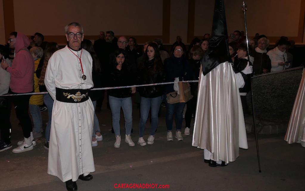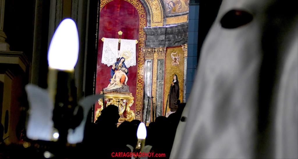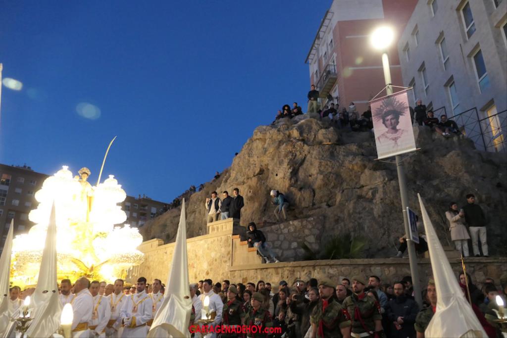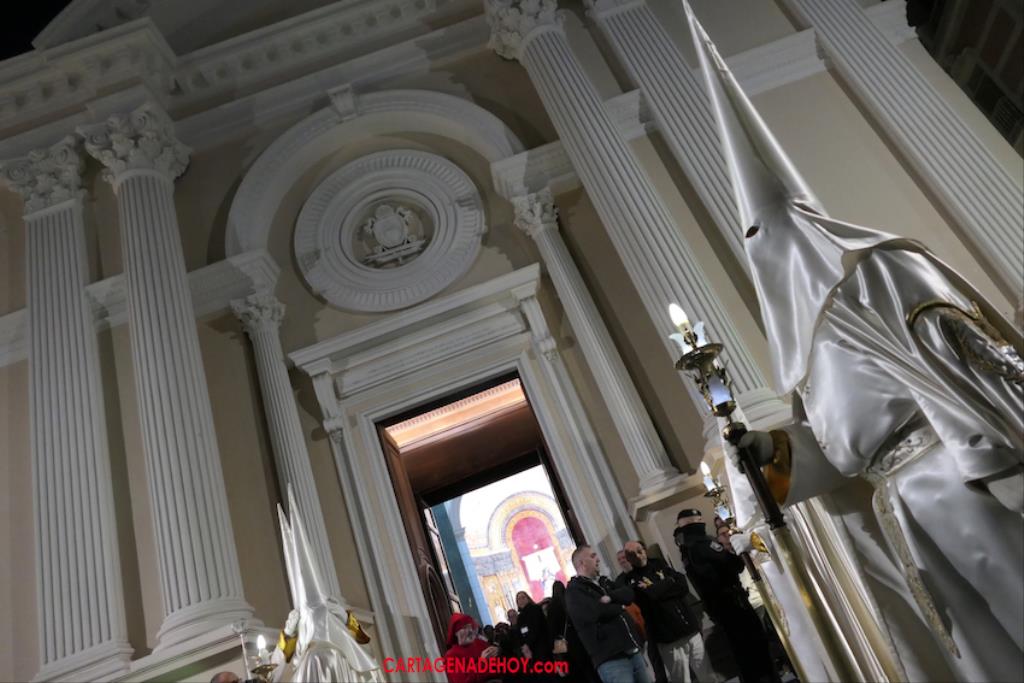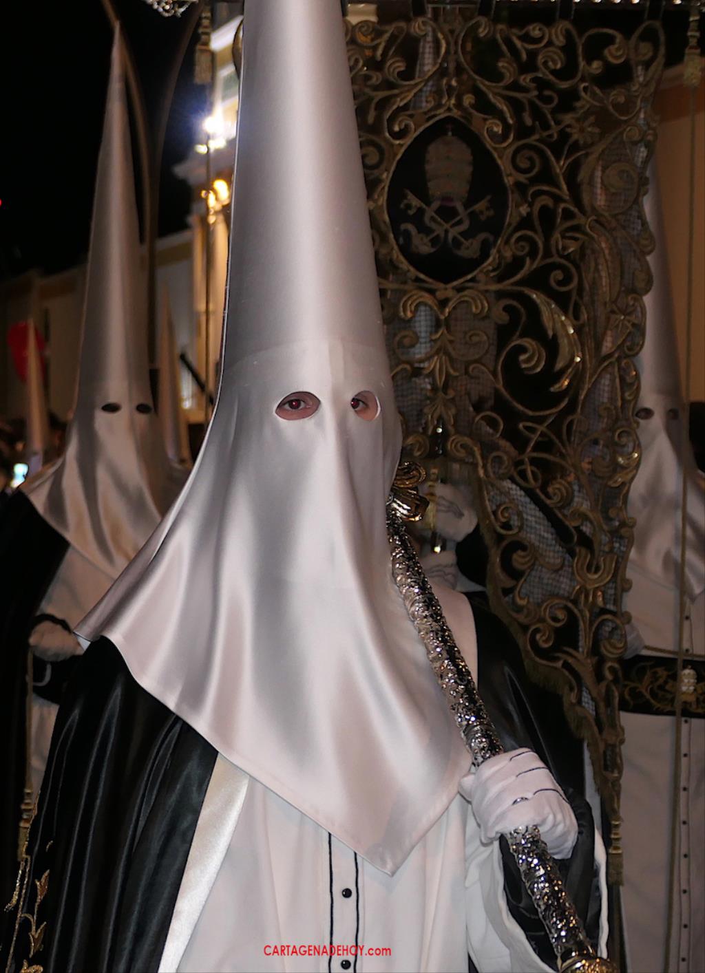 Las procesiones de este Martes Santo han salido más temprano de lo habitual debido a que este año ha tenido lugar antes del cambio horario. Así, dos de los desfiles (Juan y Santiago) estaban en la calle cuando los comercios todavía estaban abiertos en el casco antiguo. Después, poco antes de las nueve, se incorporó a las calles San Pedro en una noche estrellado y con una hermosa luna que desterraba cualquier riesgo de lluvia, nuevamente, el gran temor de la jornada y más después de conocer que en algunos puntos de la Región de Murcia se habían suspendido procesiones por las previsiones de que iba a llover esta noche. Sin embargo, además de los cuestionables pronósticos, en esta zona parece que tenemos un clima diferente, que unos justifican a lo que envía al cielo Escombreras, entre otras causas. No lo sabemos, pero sí que se ha convertido en otra singularidad de esta tierra.