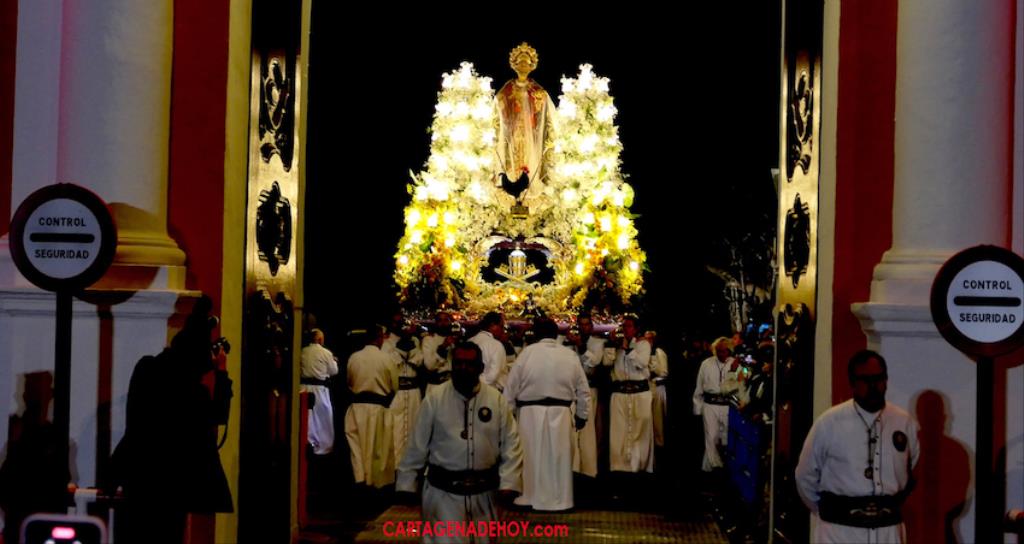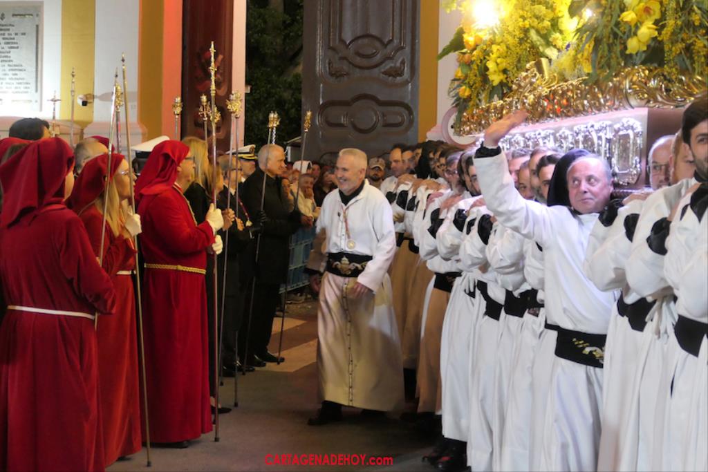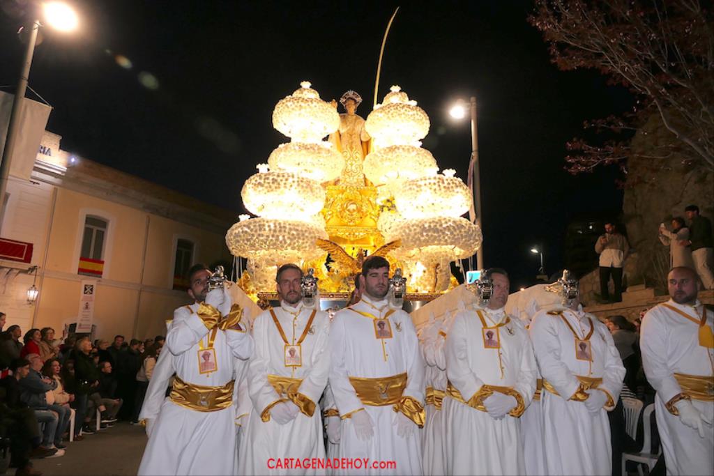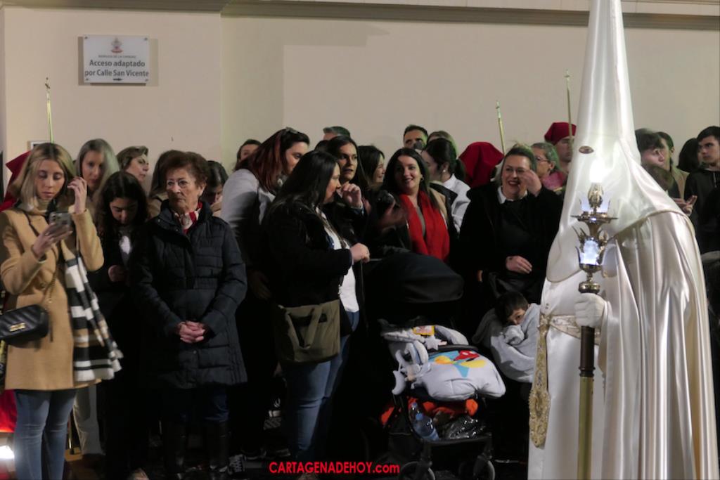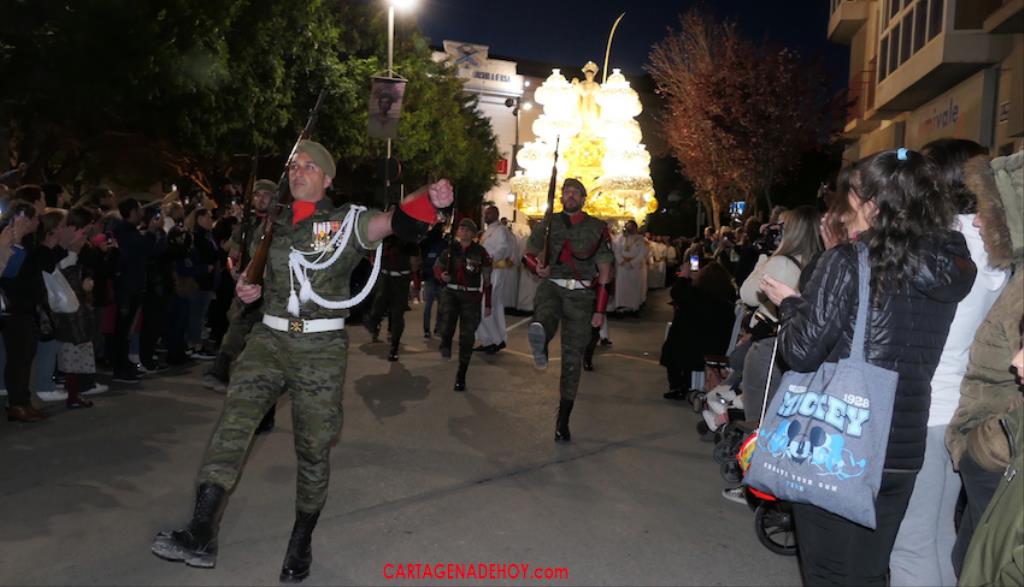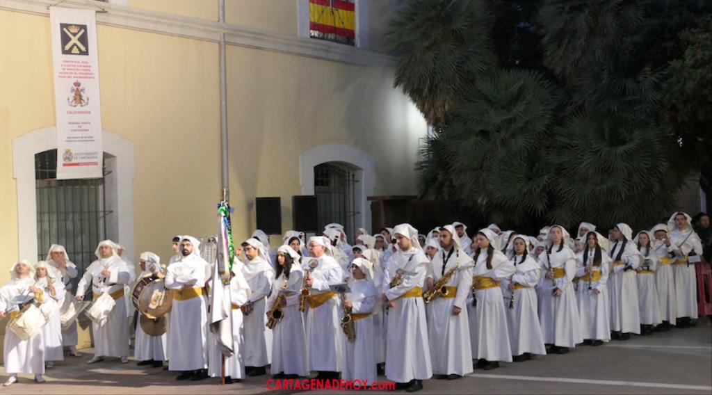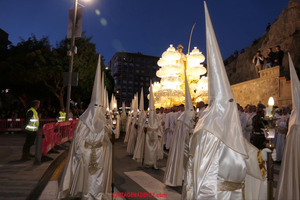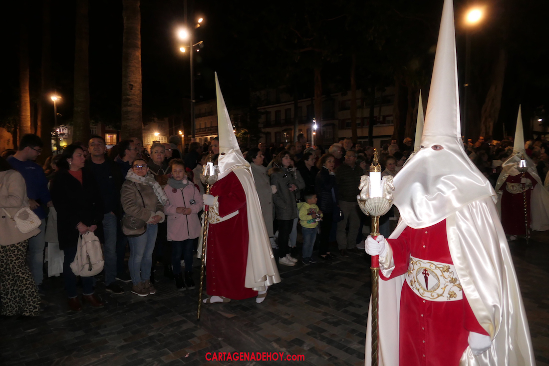 Las procesiones de este Martes Santo han salido más temprano de lo habitual debido a que este año ha tenido lugar antes del cambio horario. Así, dos de los desfiles (Juan y Santiago) estaban en la calle cuando los comercios todavía estaban abiertos en el casco antiguo. Después, poco antes de las nueve, se incorporó a las calles San Pedro en una noche estrellado y con una hermosa luna que desterraba cualquier riesgo de lluvia, nuevamente, el gran temor de la jornada y más después de conocer que en algunos puntos de la Región de Murcia se habían suspendido procesiones por las previsiones de que iba a llover esta noche. Sin embargo, además de los cuestionables pronósticos, en esta zona parece que tenemos un clima diferente, que unos justifican a lo que envía al cielo Escombreras, entre otras causas. No lo sabemos, pero sí que se ha convertido en otra singularidad de esta tierra.