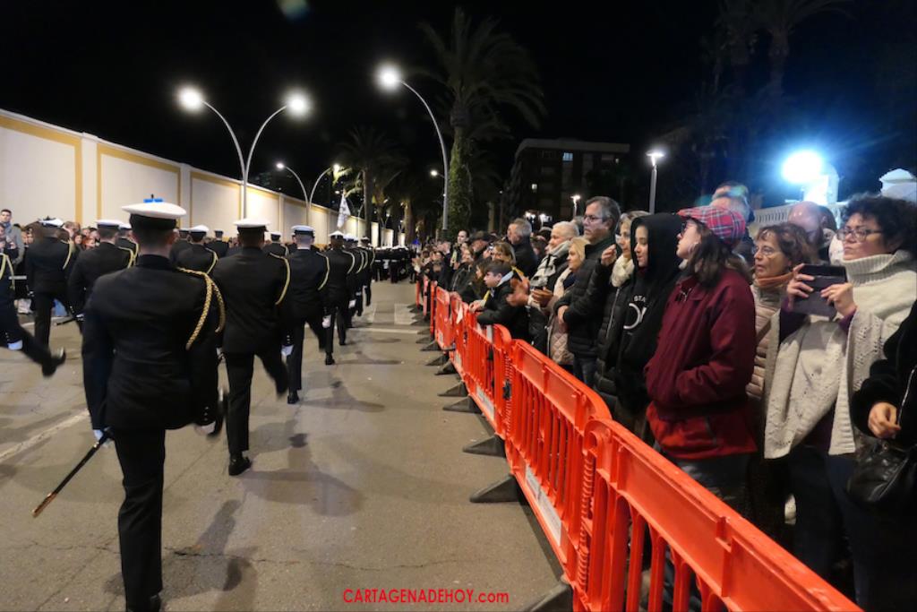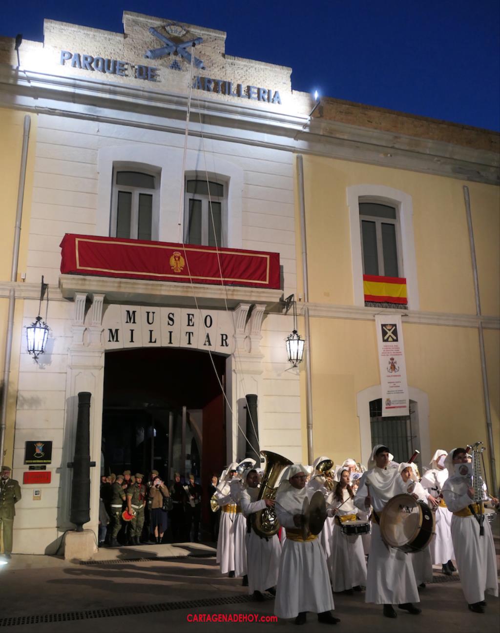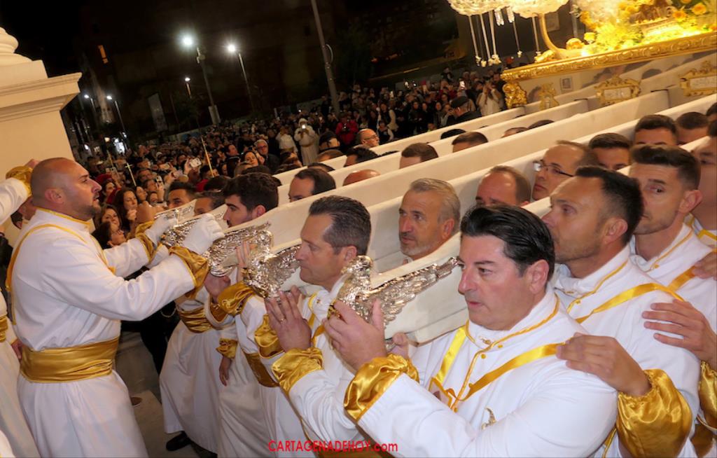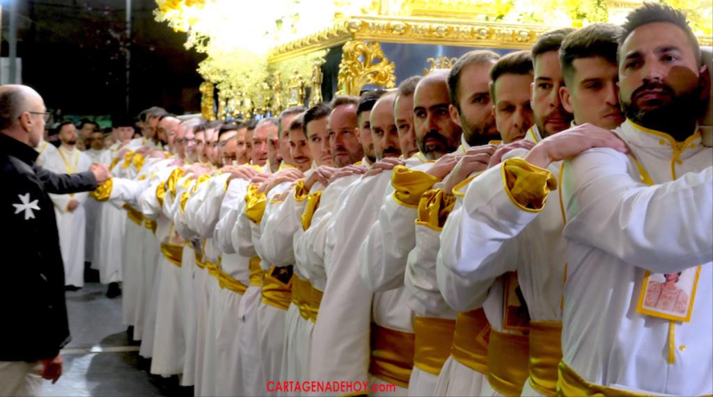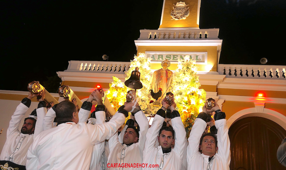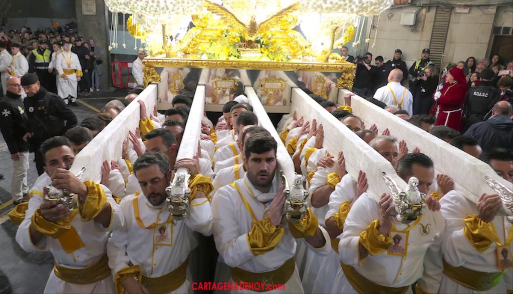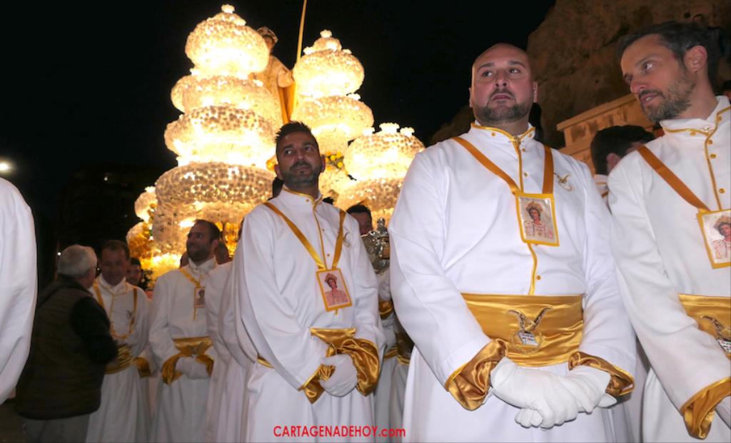 A las 7.22 horas comenzaban los actos de los santos vinculados a militares del Ejército de Tierra, Juan y Santiago, a quien llamó Jesús como ‘Boanerges’ (‘Hijos del trueno’), que según unos es por el apodo que tenía su padre y otros, por el carácter fuerte e impetuoso de ambos. El Discípulo Amado es el que más gente reúne, pues su acto de despedida es abierto, frente al Parque de Artillería, a diferencia de los otros dos apóstoles, pues en el Gobierno Militar y en el Arsenal Militar hay restricciones de acceso. El teniente-coronel Ernesto Terry, director del Museo Histórico Militar de Cartagena, es el encargado de dirigir las palabras al santo, que luce sobre el resplandeciente trono. Después se pone en marcha hacia la basílica de la Virgen de la Caridad, donde sus portapasos meterán la punta de las varas con un extraordinario esfuerzo, mientras que la directiva de la agrupación entrega un ramo de flores a la patrona. Reseñar también que en este cortejo iba un grupo de estudiantes de la UCAM de Cartagena.
