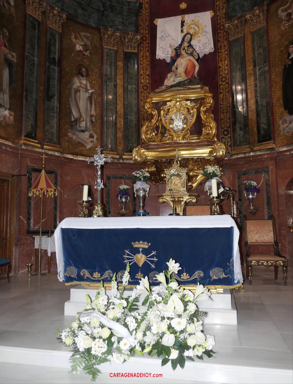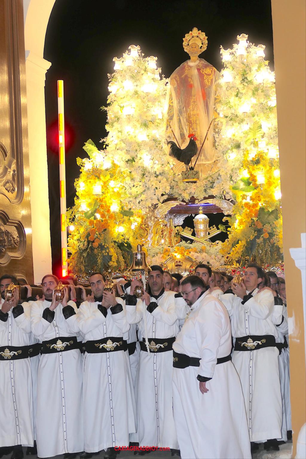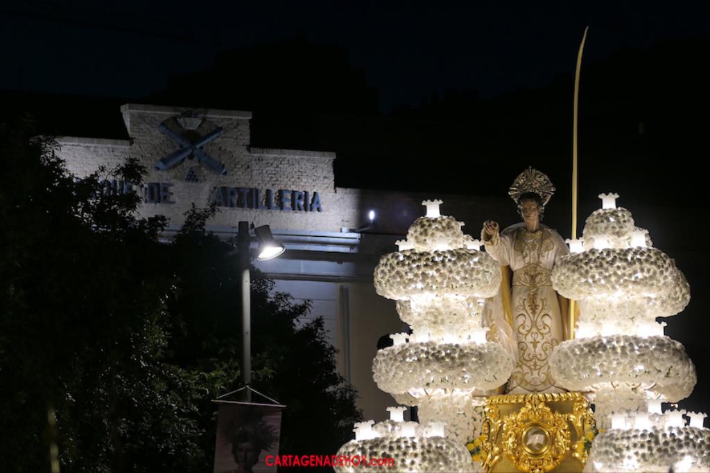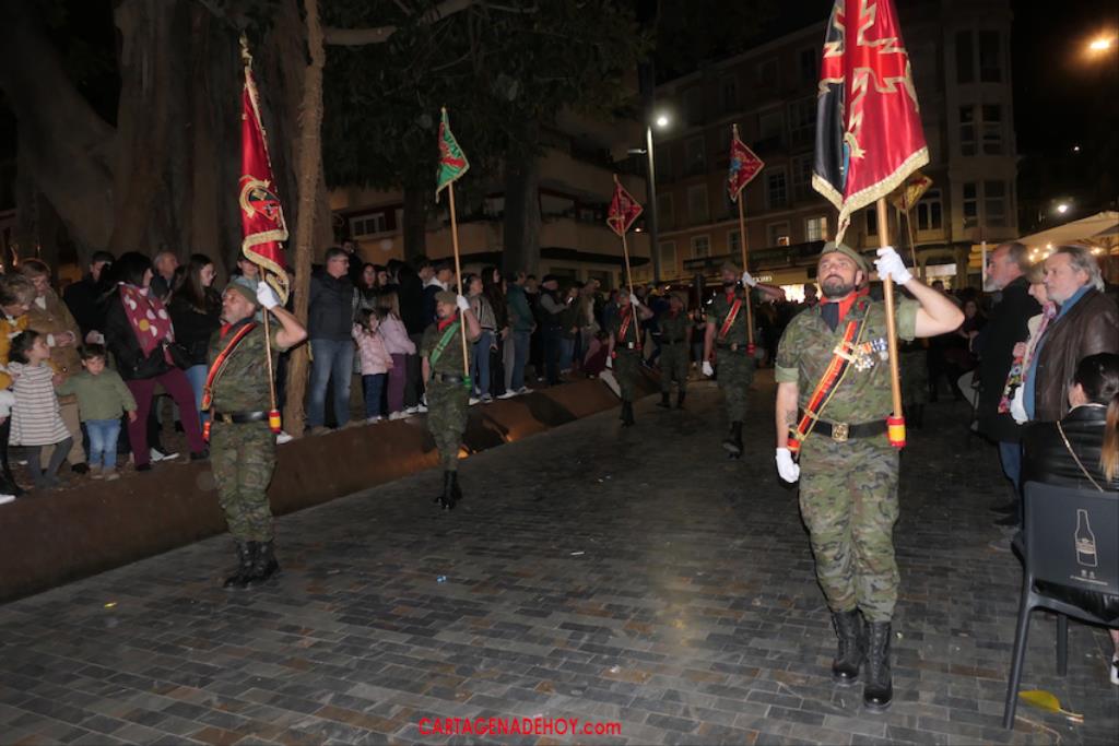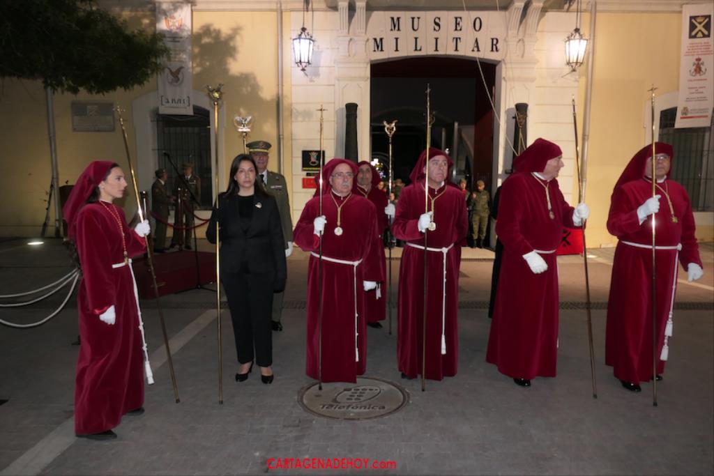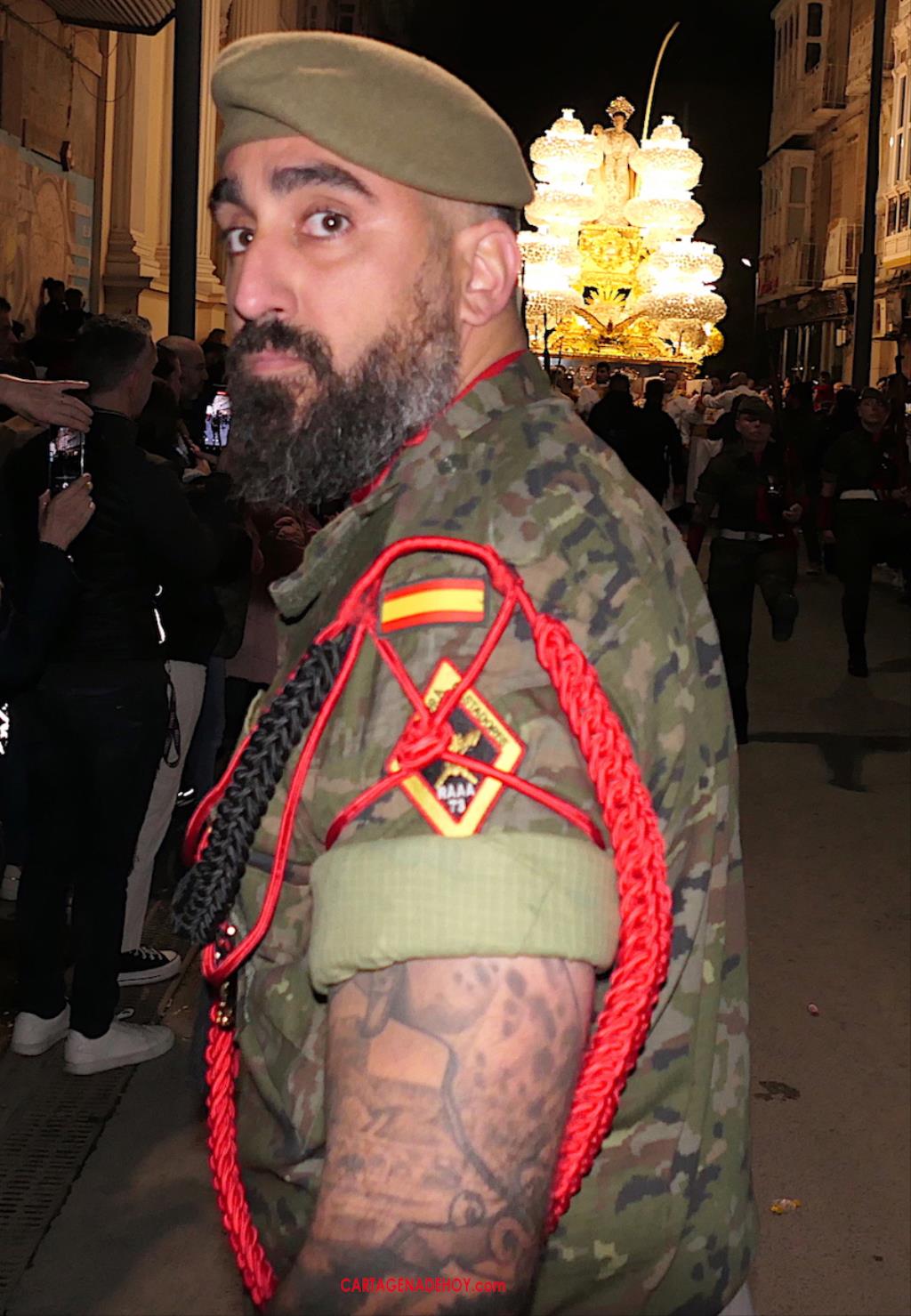 A las 7.22 horas comenzaban los actos de los santos vinculados a militares del Ejército de Tierra, Juan y Santiago, a quien llamó Jesús como ‘Boanerges’ (‘Hijos del trueno’), que según unos es por el apodo que tenía su padre y otros, por el carácter fuerte e impetuoso de ambos. El Discípulo Amado es el que más gente reúne, pues su acto de despedida es abierto, frente al Parque de Artillería, a diferencia de los otros dos apóstoles, pues en el Gobierno Militar y en el Arsenal Militar hay restricciones de acceso. El teniente-coronel Ernesto Terry, director del Museo Histórico Militar de Cartagena, es el encargado de dirigir las palabras al santo, que luce sobre el resplandeciente trono. Después se pone en marcha hacia la basílica de la Virgen de la Caridad, donde sus portapasos meterán la punta de las varas con un extraordinario esfuerzo, mientras que la directiva de la agrupación entrega un ramo de flores a la patrona. Reseñar también que en este cortejo iba un grupo de estudiantes de la UCAM de Cartagena.