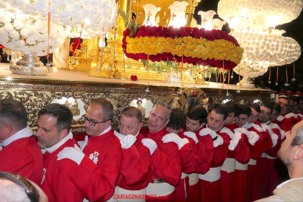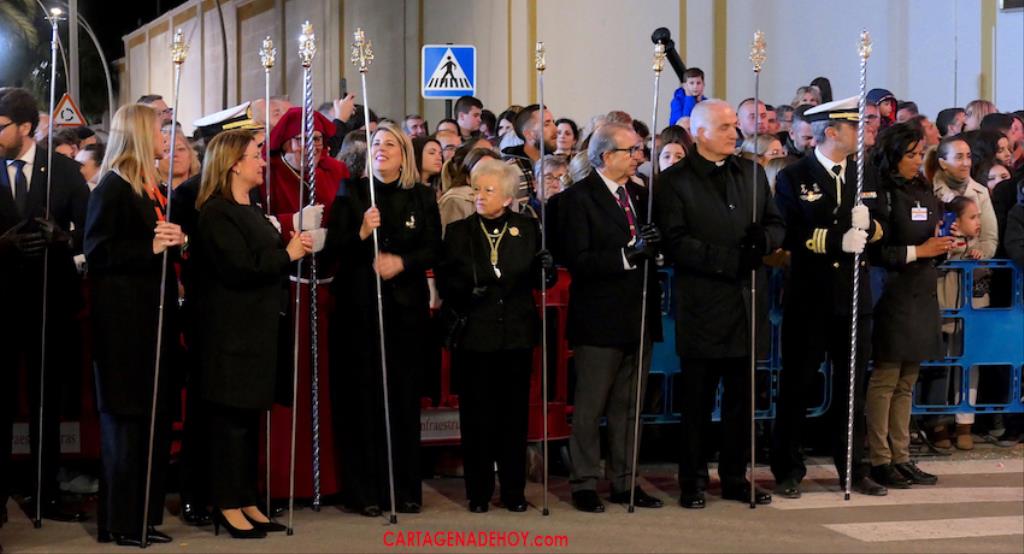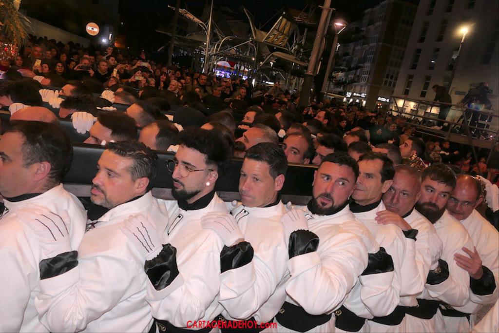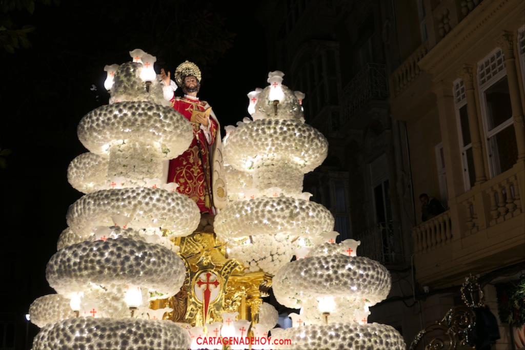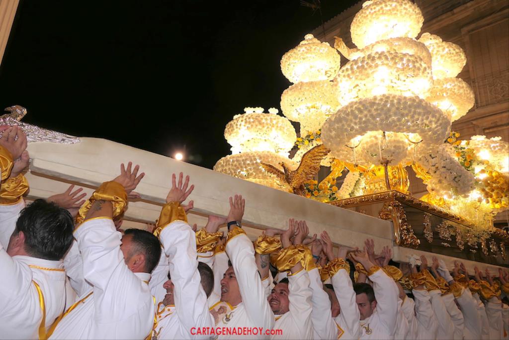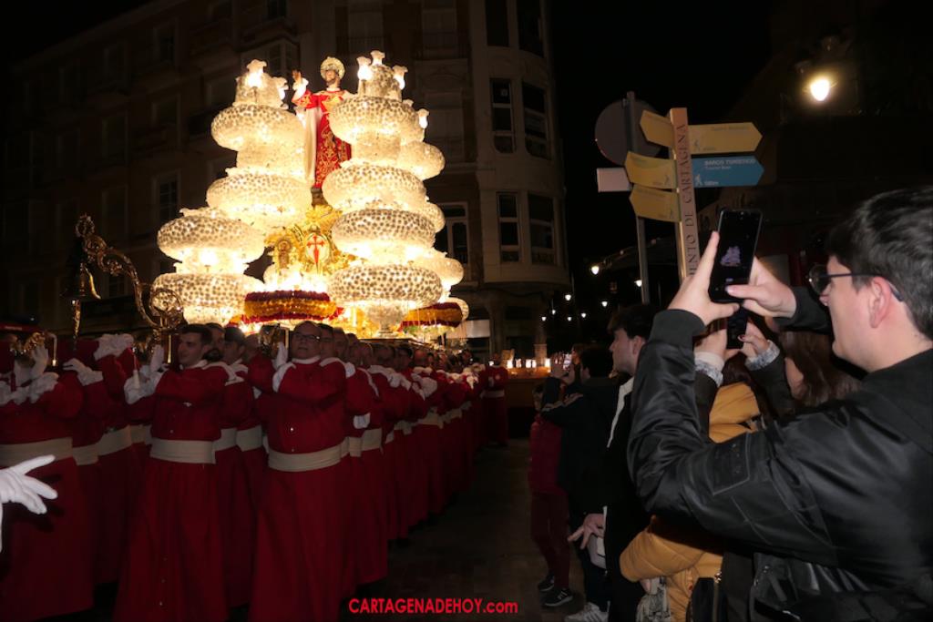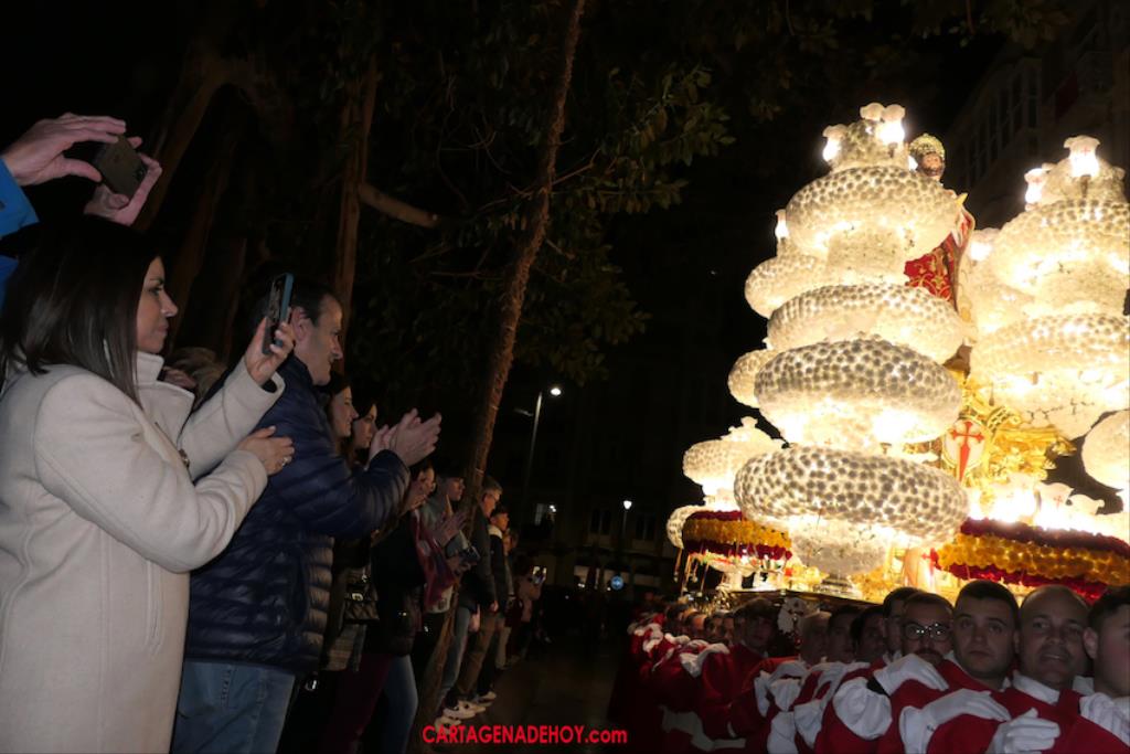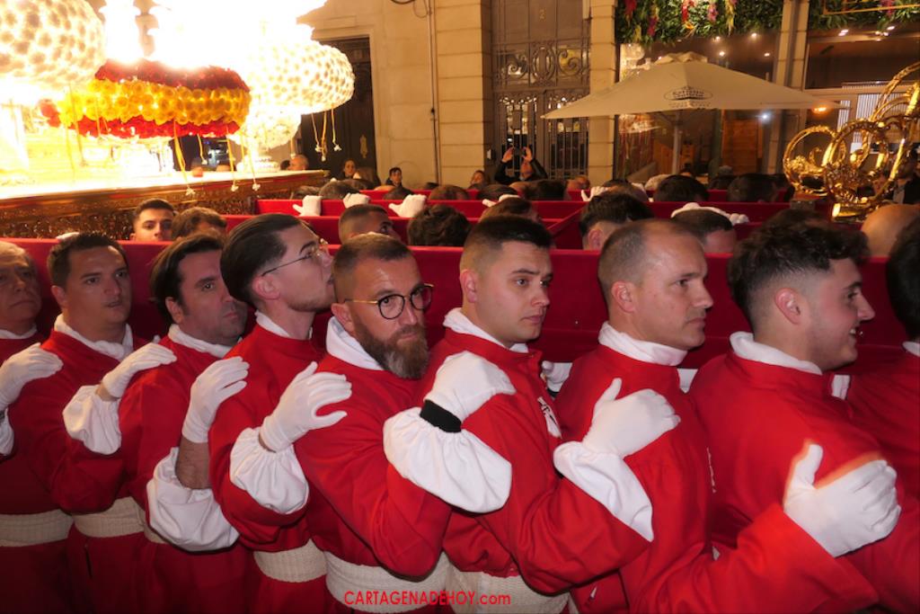 Otro apunte. Santiago y San Juan repitieron adorno floral y San Pedro llevó a cabo una total renovación con flores llegadas, incluso, de varios países. Sin embargo, en este terreno queremos apuntar que para muchos espectadores es abusiva tanta flor en la actualidad, cuando numerosas personas sacan sus móviles para fotografiar a los santos y es muy complicado hacerlo, pues están muy tapados por las torres florales que los rodean. Realmente, sólo se les puede ver bien de forma frontal, lo que no es fácil para los que, como publico, están en los laterales del recorrido. "No hay manera de hacerle una foto", escuchamos, con distintas palabras, en varios puntos de esta noche. La flor es también es una seña de identidad de la Semana Santa de Cartagena, pero el debate está en la cantidad en determinados tronos.