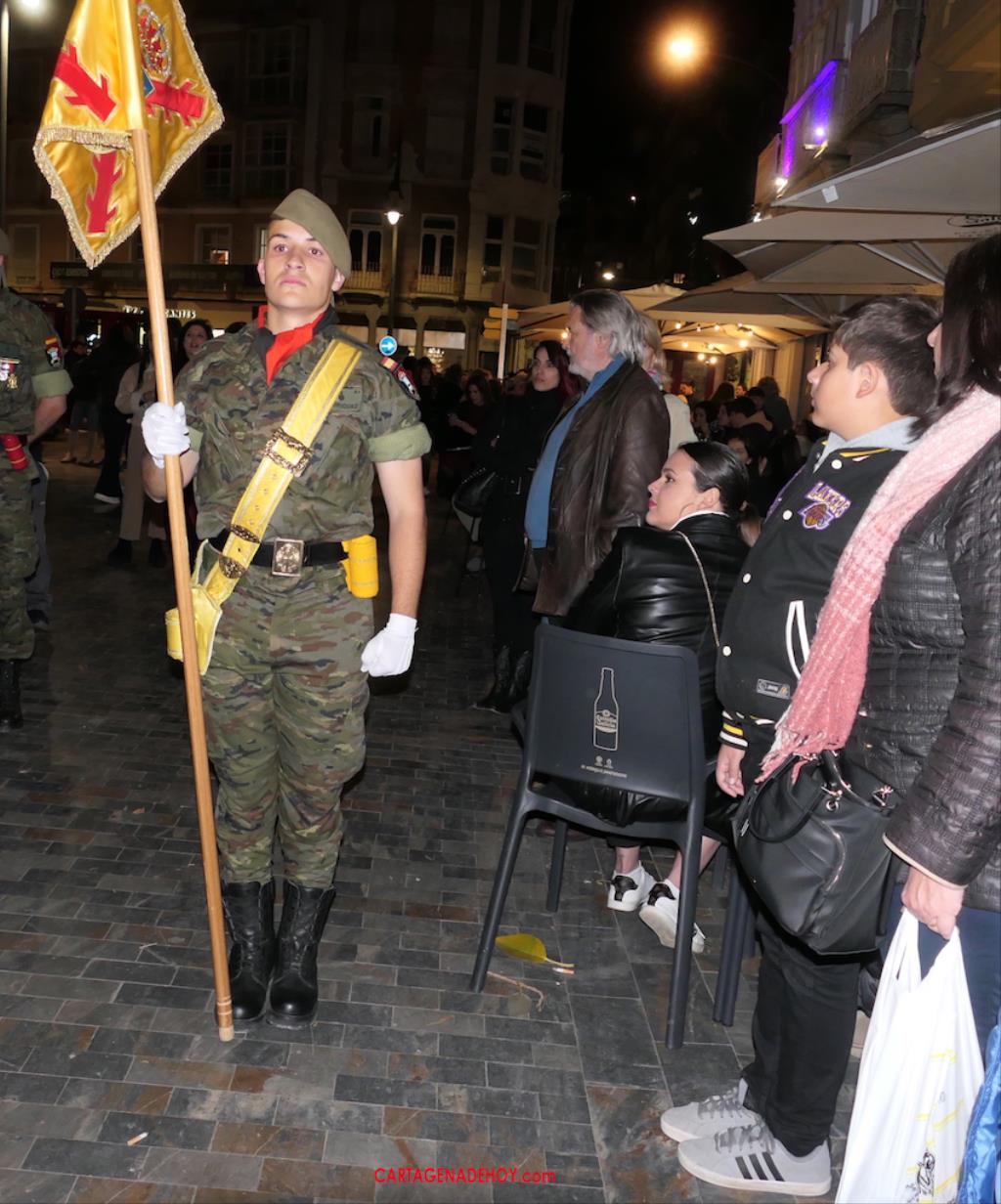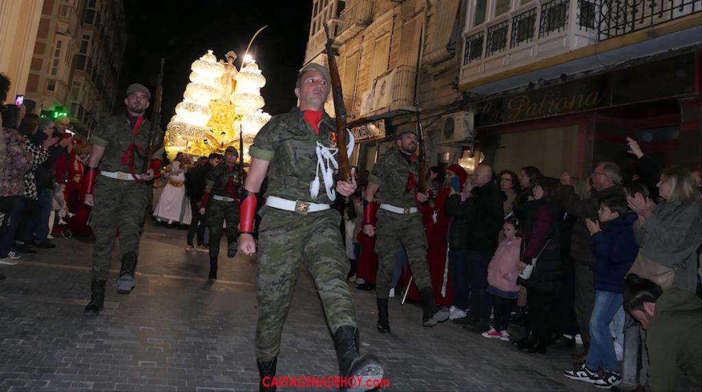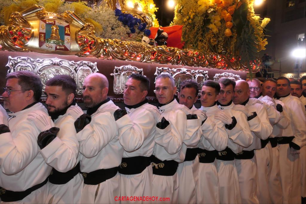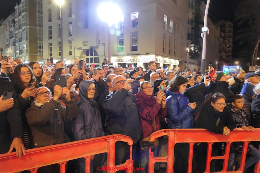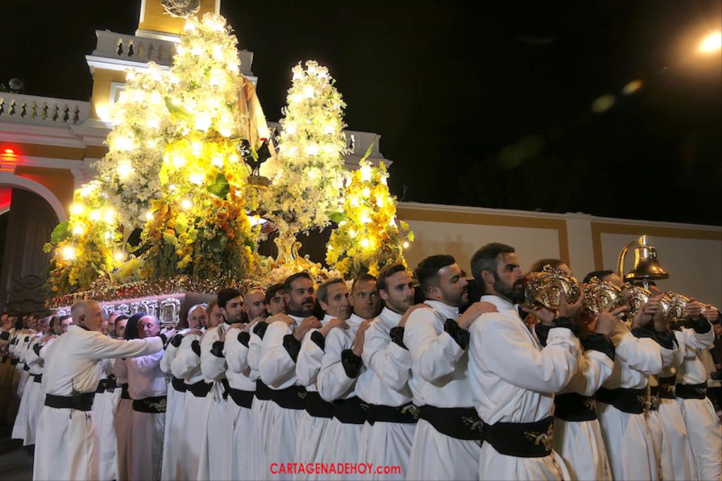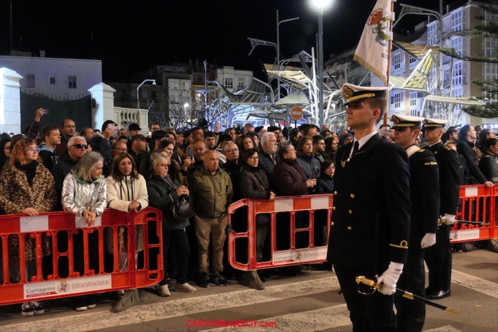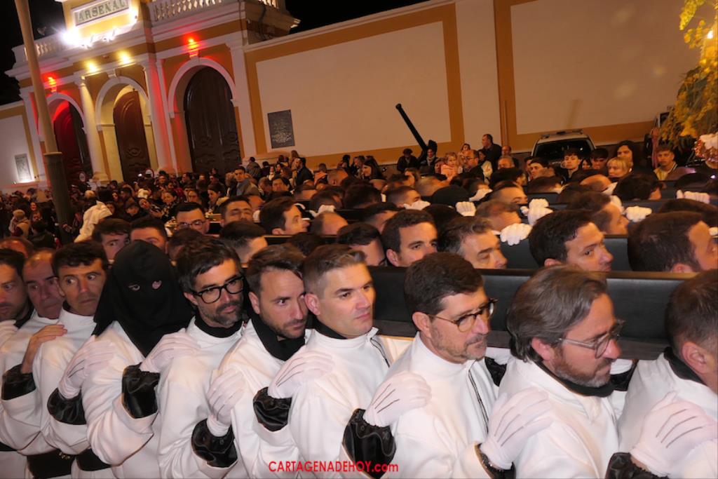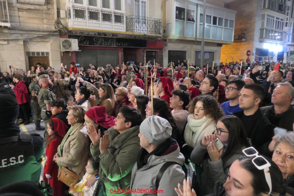 Otro apunte. Santiago y San Juan repitieron adorno floral y San Pedro llevó a cabo una total renovación con flores llegadas, incluso, de varios países. Sin embargo, en este terreno queremos apuntar que para muchos espectadores es abusiva tanta flor en la actualidad, cuando numerosas personas sacan sus móviles para fotografiar a los santos y es muy complicado hacerlo, pues están muy tapados por las torres florales que los rodean. Realmente, sólo se les puede ver bien de forma frontal, lo que no es fácil para los que, como publico, están en los laterales del recorrido. "No hay manera de hacerle una foto", escuchamos, con distintas palabras, en varios puntos de esta noche. La flor es también es una seña de identidad de la Semana Santa de Cartagena, pero el debate está en la cantidad en determinados tronos.