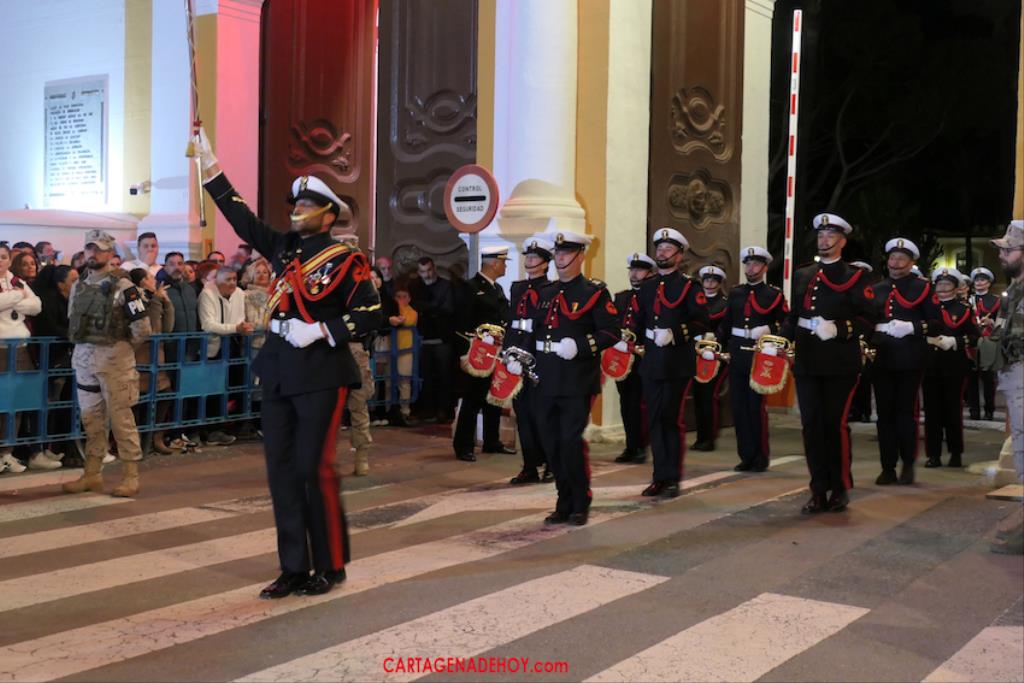 Desde el Gobierno de España ha salido, sobre 102 hombros, el patrón de España, también con acto de despedida y recuerdo a los difuntos. Para facilitar la visión de lo que sucede en el interior, una gran pantalla luce en la parte superior de la calle Príncipe de Vergara. Más largo es el acto en el Arsenal, con un primer capítulo en la zona del muelle y otro junto a la casa del nuevo almirante (Plaza de Armas), recién llegado hace escasas fechas, quien ofrece un simpático discurso ("te crees que porque soy nuevo...") para explicar porqué autoriza al santo a acabar con su arresto y salir, pero con el compromiso de regresar antes de la medianoche del Miércoles Santo. Fuera del Arsenal, la cientos de personas esperan la salida del tercio y del trono a hombros, como va desde 1970, siendo elevado el mismo tras cruzar el pórtico central. San Pedro, sobre la cúpula del Vaticano con 140 portapasos, va esta vez cubierto del plástico colocado esta noche a las tallas por si aparecía el agua.