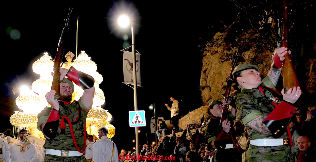 Destacar también la singularidad que da a esta procesión la presencia de los militares como piquetes junto a los santos. Infantería de Marina del Tercio de Levante, encabezados por guardamarinas de la Escuela Naval, es el que va con San Pedro (es el más numeroso y lleva banda de música) y dos escuadras de Tierra acompañan a los hermanos 'Hijos del trueno'. Los primeros reciben la mayoría de aplausos cuando los soldados cambian los fusiles de hombros, mientras que los acompañantes de Santiago lucen banderines y los más espectaculares con las armas son los del Regimiento de Artillería Antiaérea número 73 que van con San Juan.