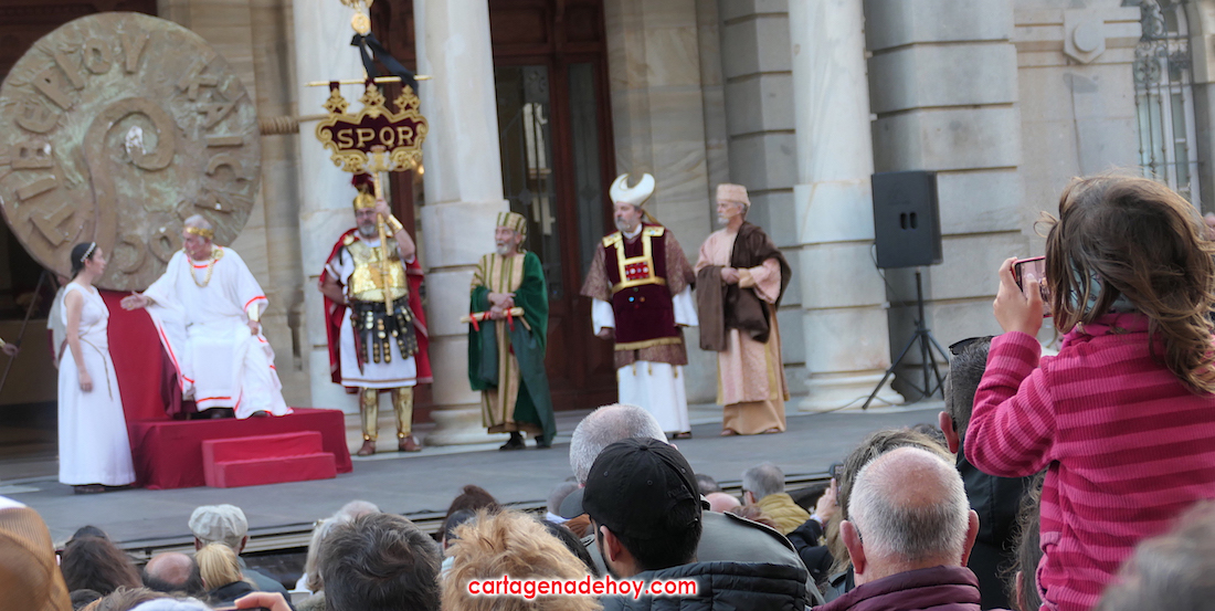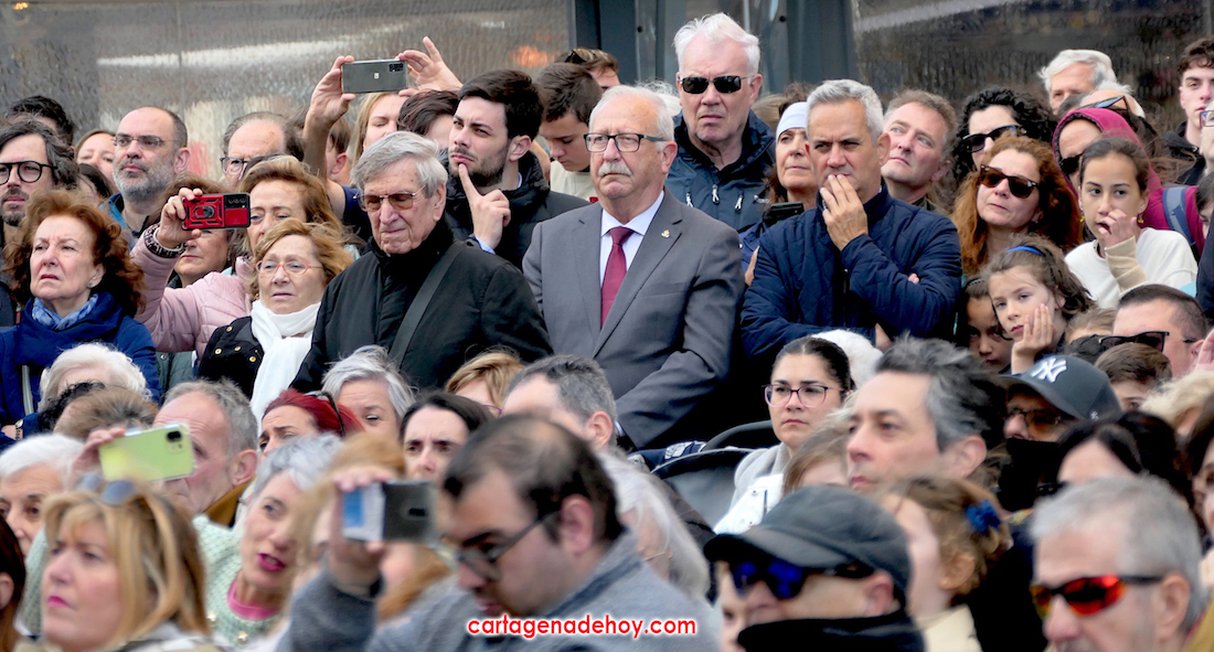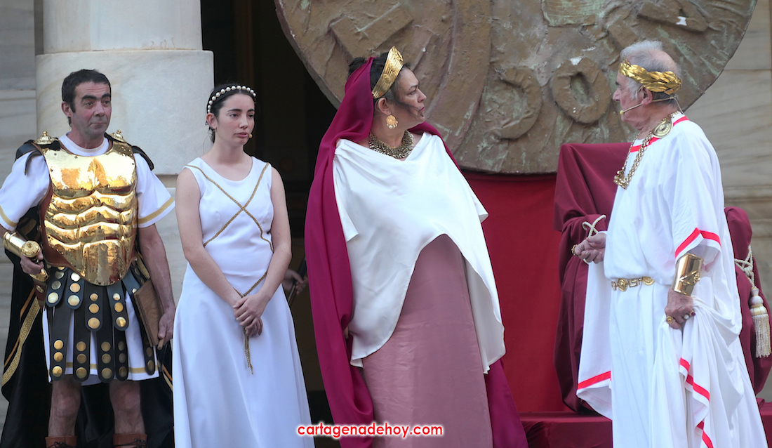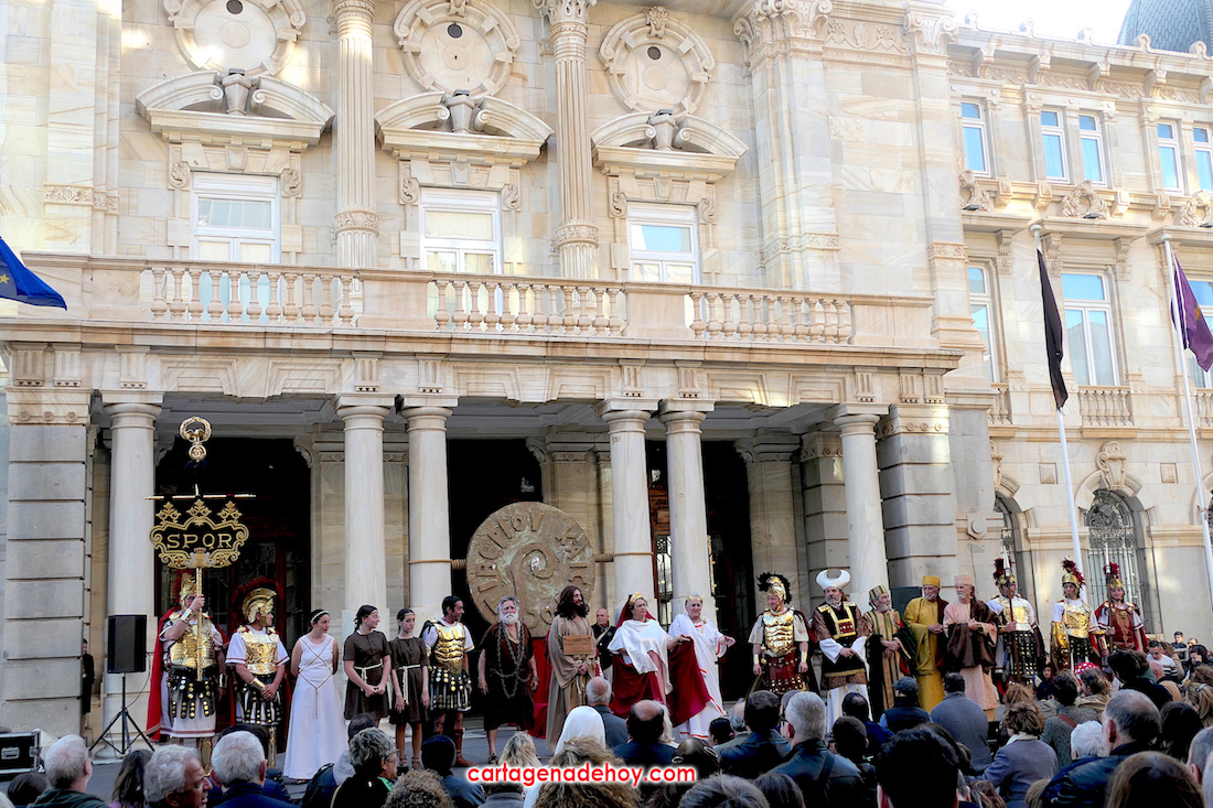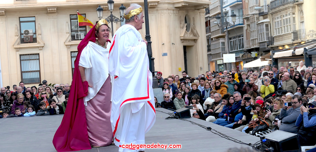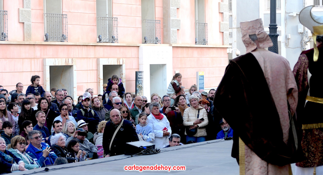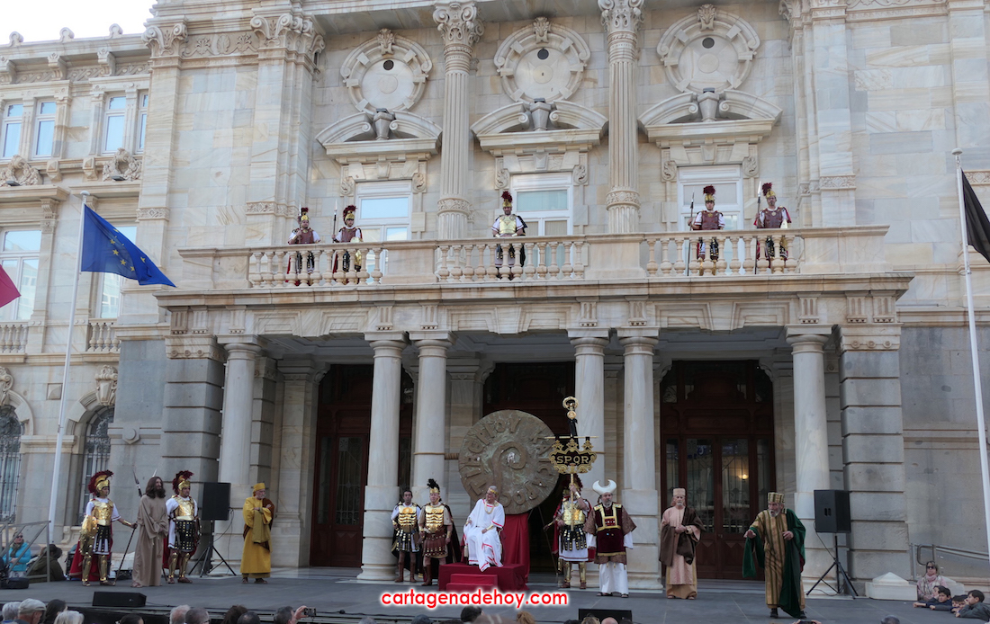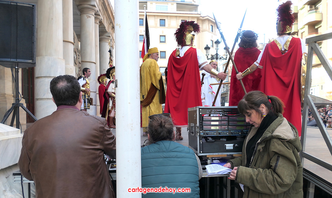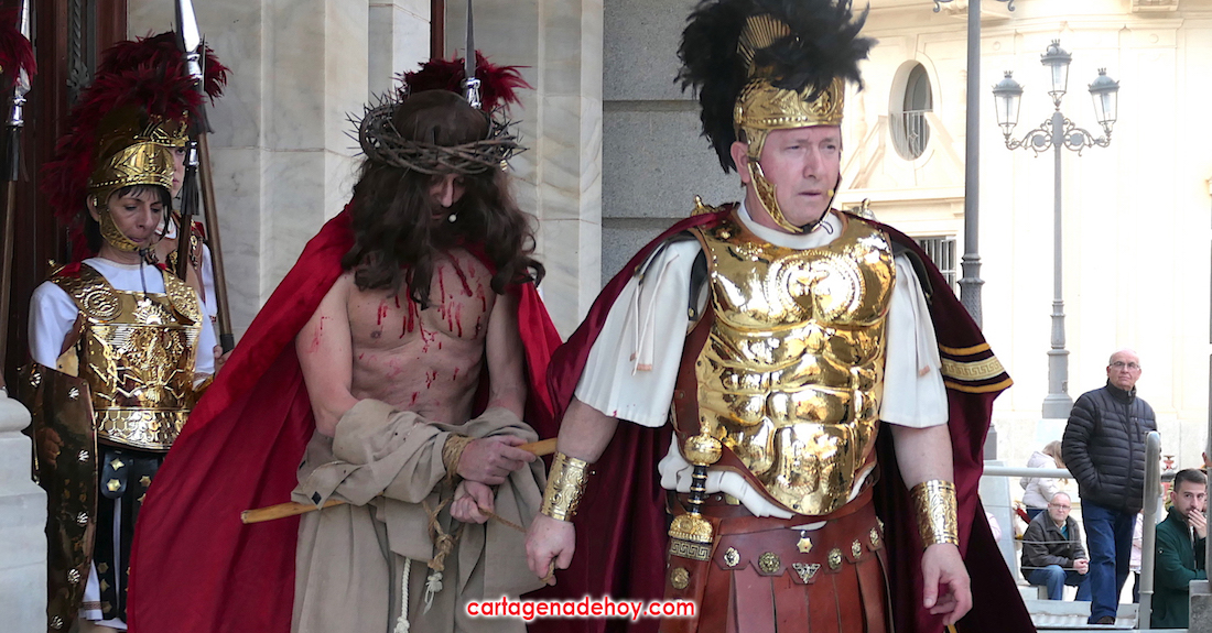 El 'Drama del pretorio' o, como se le conoce de forma popular, 'el lavatorio de Pilatos' es un acto más que centenario que desde hace décadas tiene lugar en la tarde del Miércoles Santo, aunque haga viento y frío como esta tarde, lo que no ha impedido la presencia de una multitud de espectadores (bien abrigados) para contemplar, durante poco más de media hora, una brillante puesta en escena a cargo de actores no profesionales con el apoyo de los procesionistas de la agrupación de Soldados Romanos californios, siendo Ángel Joaquín García Bravo el autor de este auto sacramental.