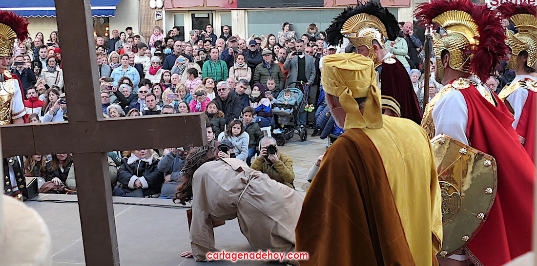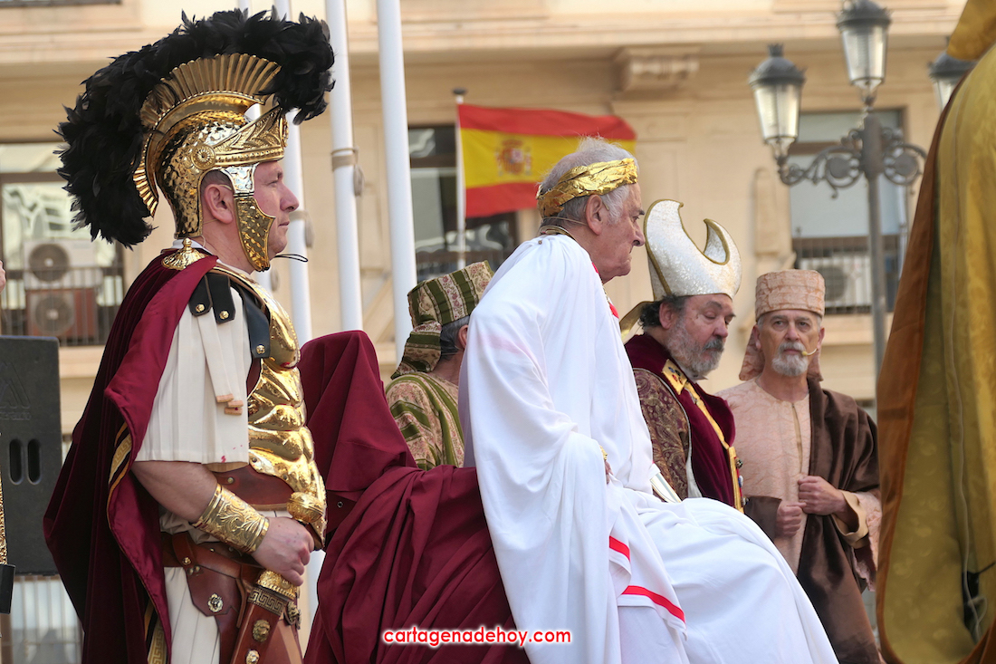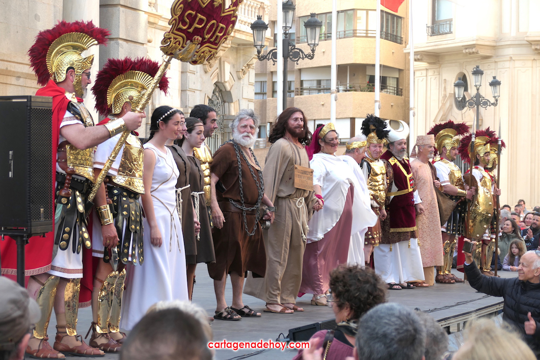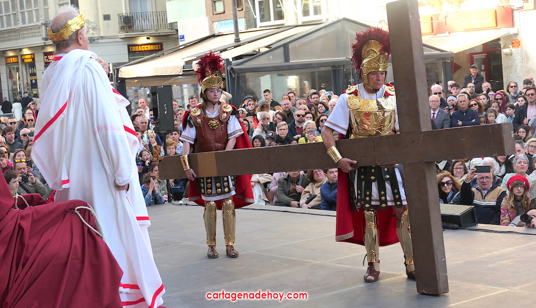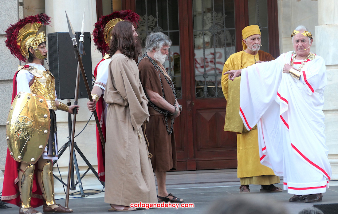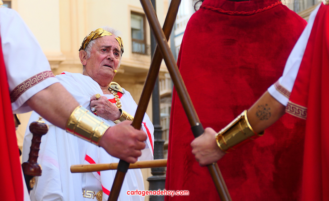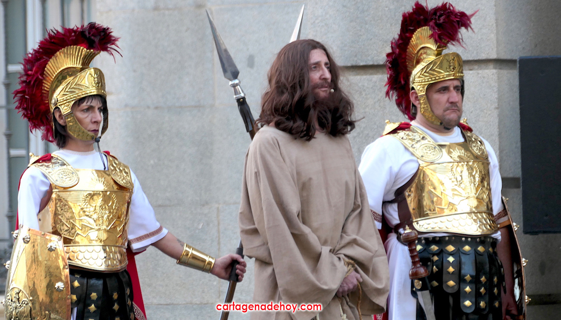 El acto principal, Ángel García Carrasco, quien lleva 39 años interpretando al prefecto romano, es el epicentro del juicio a Jesús (este año con barba), durante el que se debate entre liberar a una persona a la que no ve motivos para tan trágico destino, pero que al final se deja llevar por la presión popular. "¡Crucificarle!", le pedían desde el populacho. Incluso, dio a elegir entre liberar a Jesús o a Barrabás, eligiendo el pueblo al segundo pese a tener más historial delictivo. Hay debate con su dona: "¡No puedo!", repite Pilatos. "¡No quieres"!", insiste la mujer. Finalmente, y tras ser flagelado, Jesús cogerá la cruz. "Ponerle: Jesús Rey de los judíos", ordena Pilatos mientras se marcha.