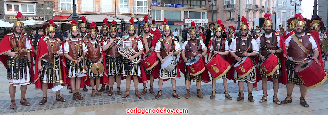 La foto muestra al grupo de música de los Soldados Romanos de la Cofradía California del grupo 'PerCusión Cartagena', que ayer participó en el lavatorio de Pilatos y en la magna procesión nocturna. Este año también son noticia porque una emisora de tierras malagueñas se interesó por el popular 'Perico Pelao' de Cartagena, siendo dos de sus integrantes quienes le remitieron una grabación y explicación el origen.