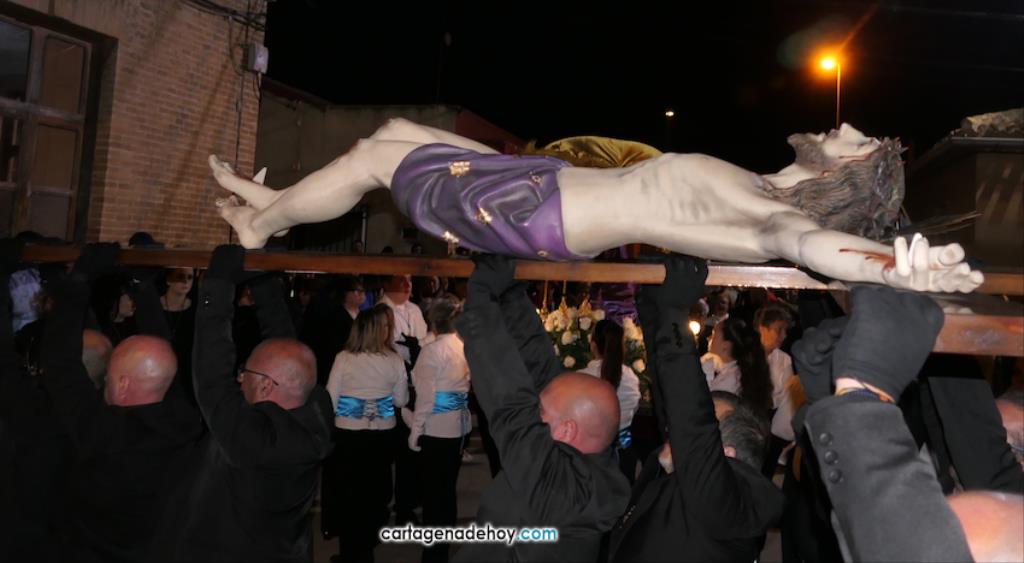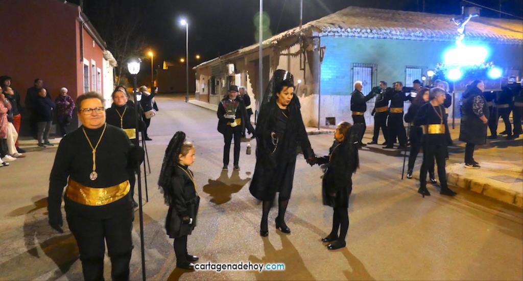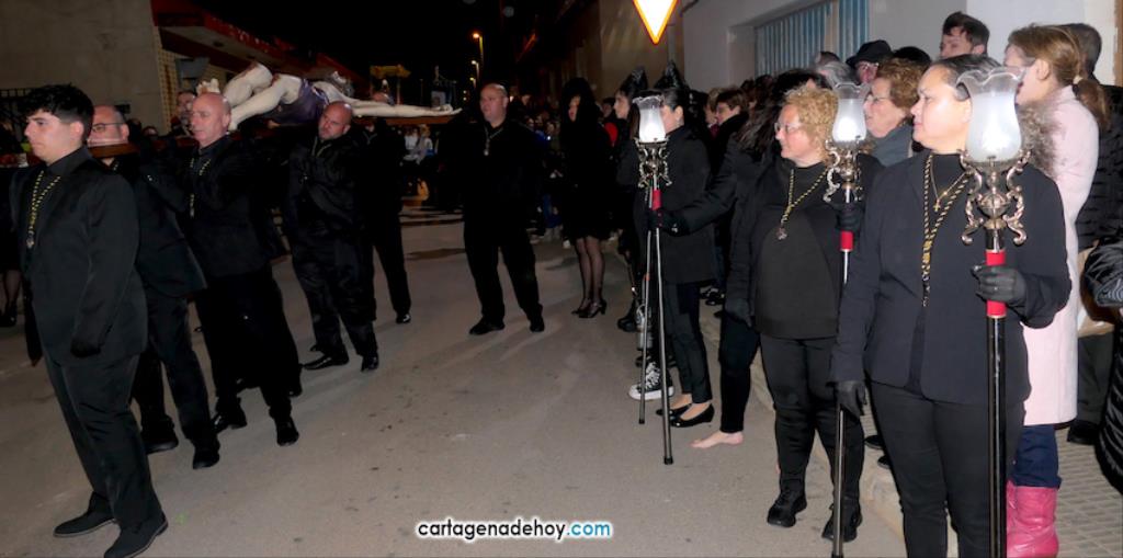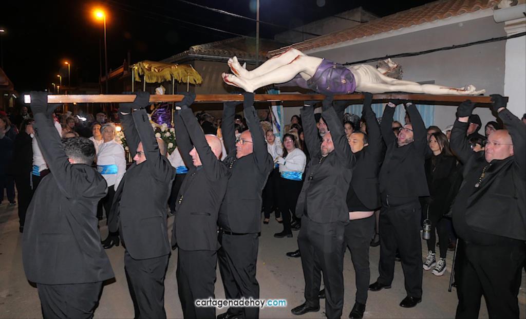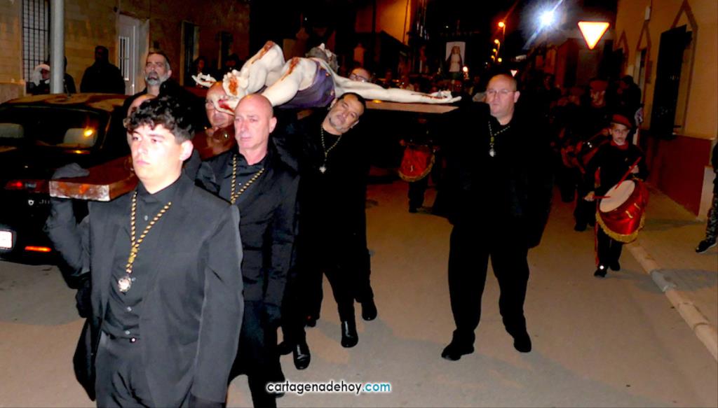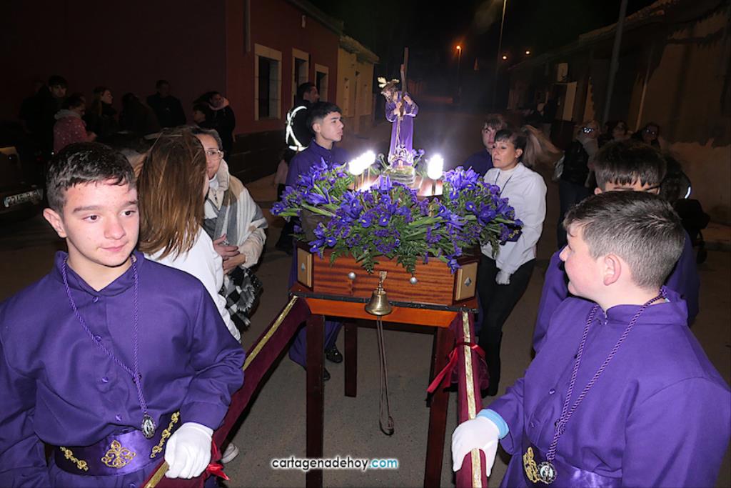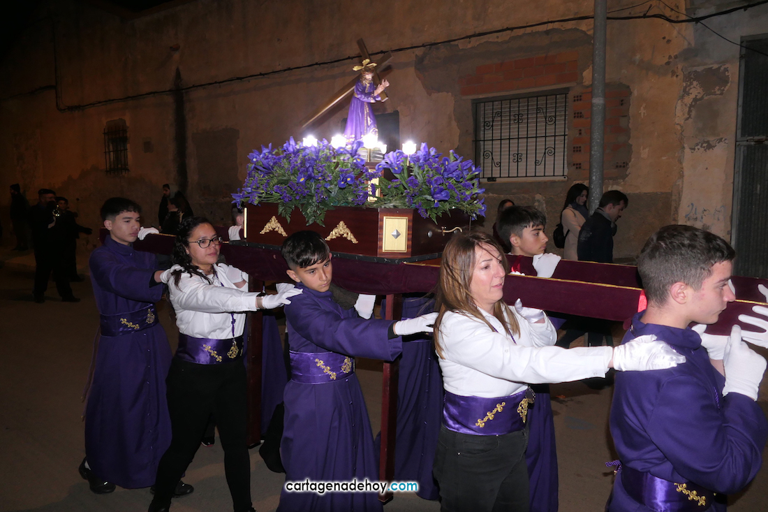 Jesús Nazareno, San Pedro, Cristo de la Misericordia, San Juan, Cristo de la Agonía y la Virgen de la Soledad van a hombros, siendo masculinos los de los crucificados y femeninos los que portan a la Virgen, mientras que ambos sexos confluyen en las otras tres pequeñas peanas. Las tallas son también de reducido tamaño, salvo el Cristo de la Agonía, imagen de la iglesia de El Llano del Beal que se ha incorporado este año y que es llevado por nueve caballeros directamente depositando el madero sobre sus hombros.