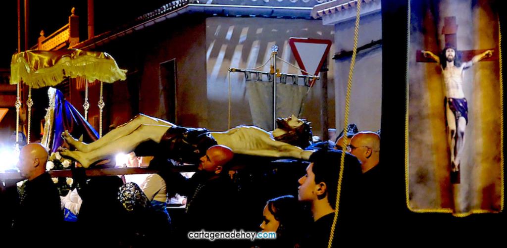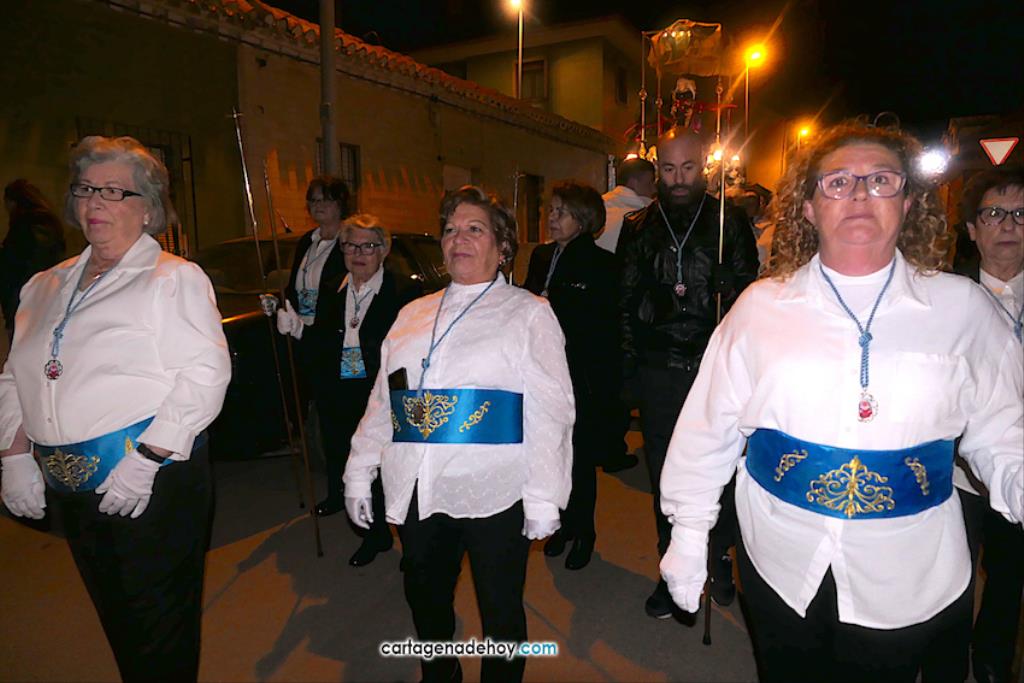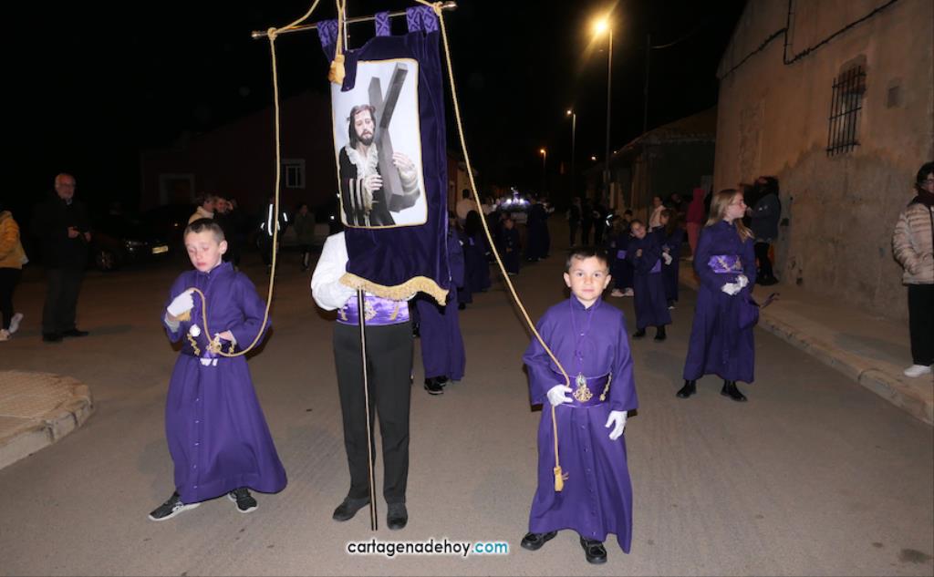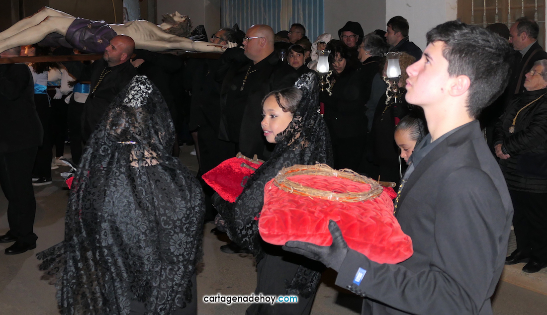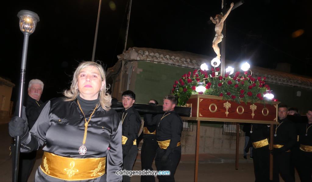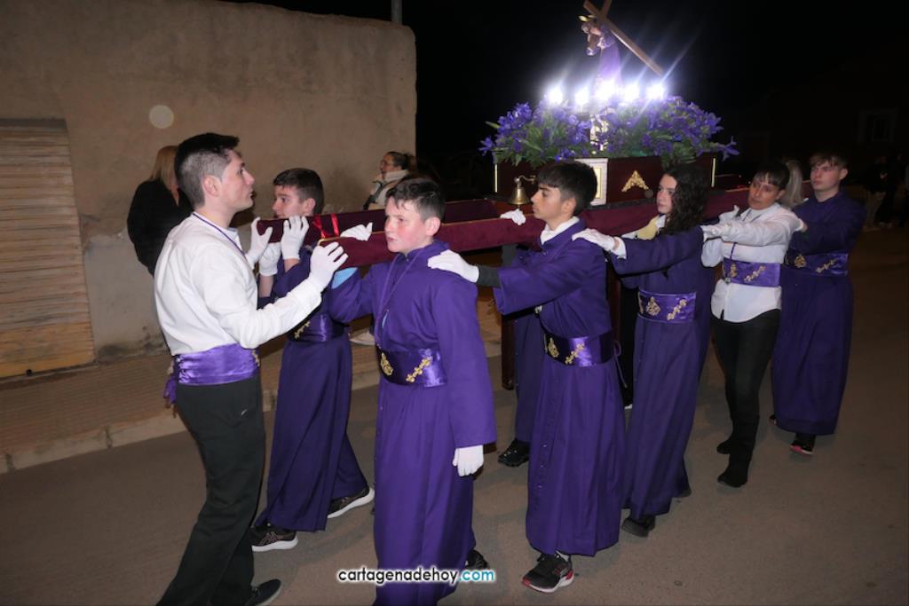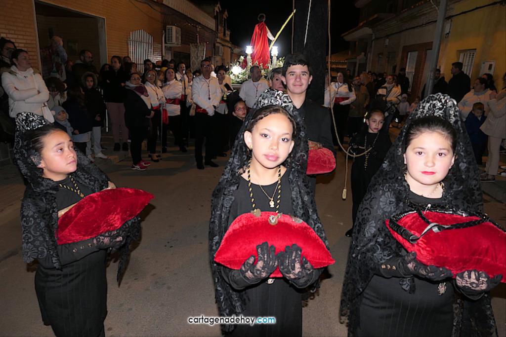 Jesús Nazareno, San Pedro, Cristo de la Misericordia, San Juan, Cristo de la Agonía y la Virgen de la Soledad van a hombros, siendo masculinos los de los crucificados y femeninos los que portan a la Virgen, mientras que ambos sexos confluyen en las otras tres pequeñas peanas. Las tallas son también de reducido tamaño, salvo el Cristo de la Agonía, imagen de la iglesia de El Llano del Beal que se ha incorporado este año y que es llevado por nueve caballeros directamente depositando el madero sobre sus hombros.