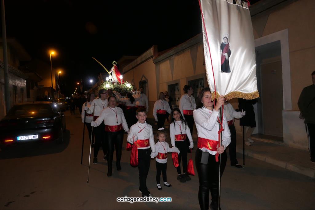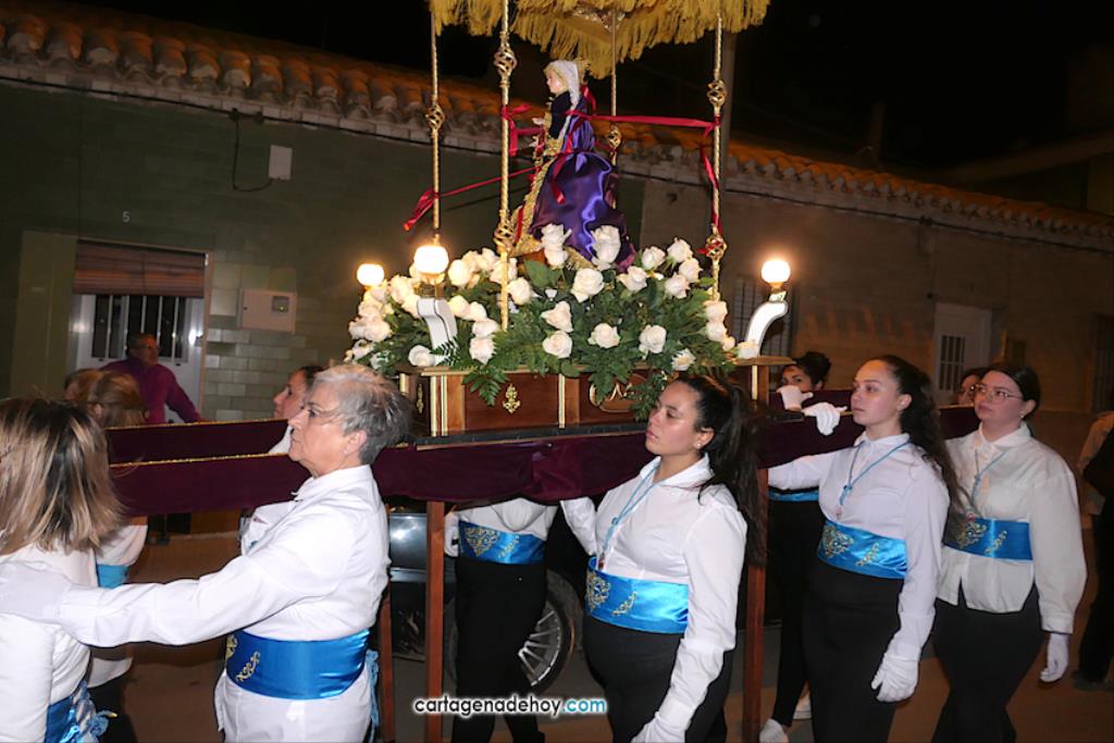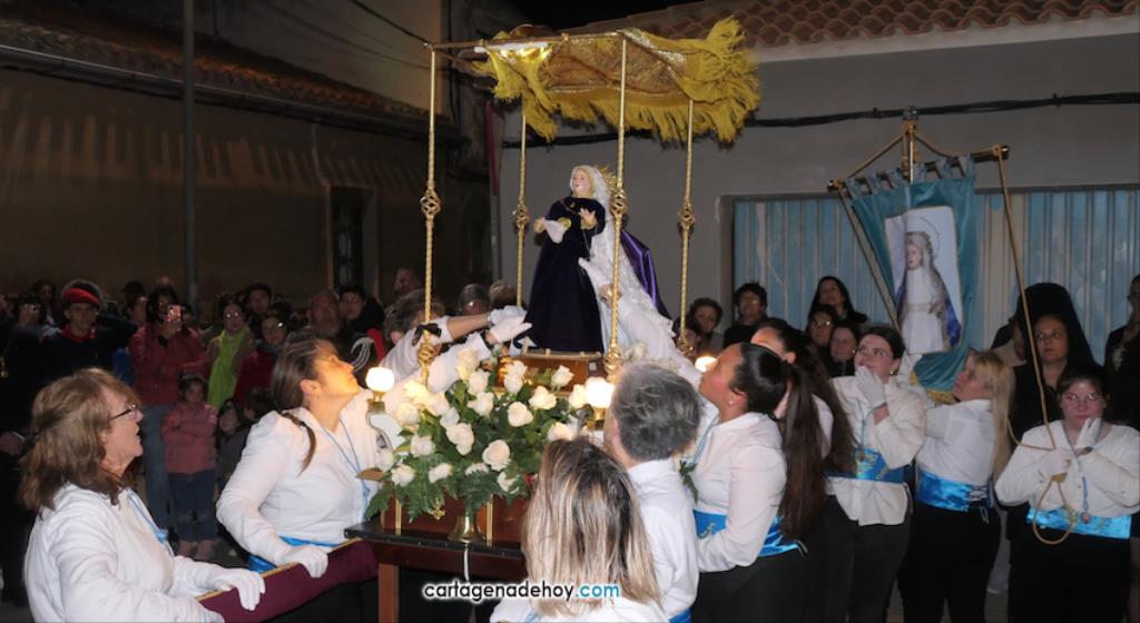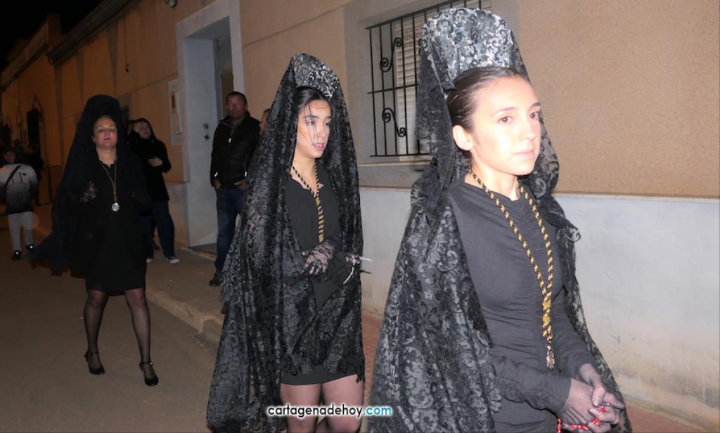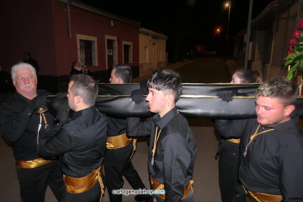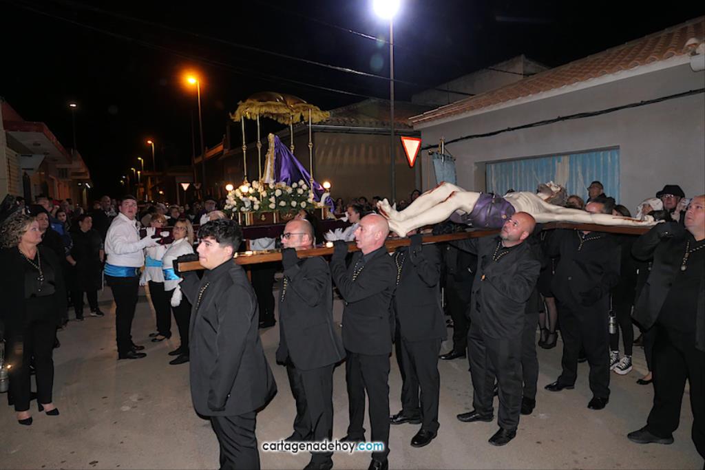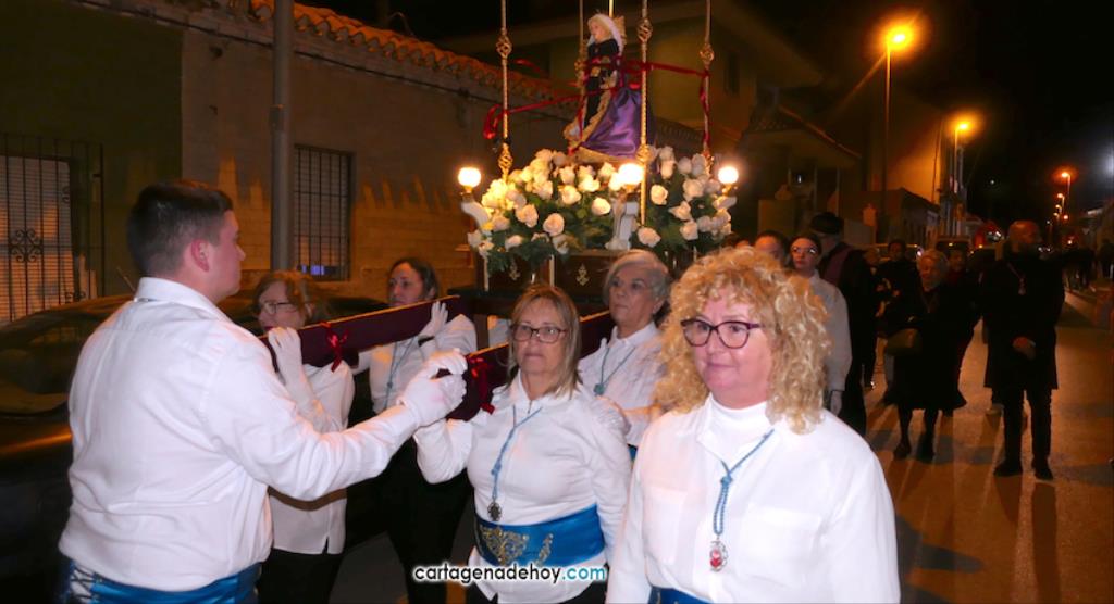 Jesús Nazareno, San Pedro, Cristo de la Misericordia, San Juan, Cristo de la Agonía y la Virgen de la Soledad van a hombros, siendo masculinos los de los crucificados y femeninos los que portan a la Virgen, mientras que ambos sexos confluyen en las otras tres pequeñas peanas. Las tallas son también de reducido tamaño, salvo el Cristo de la Agonía, imagen de la iglesia de El Llano del Beal que se ha incorporado este año y que es llevado por nueve caballeros directamente depositando el madero sobre sus hombros.
