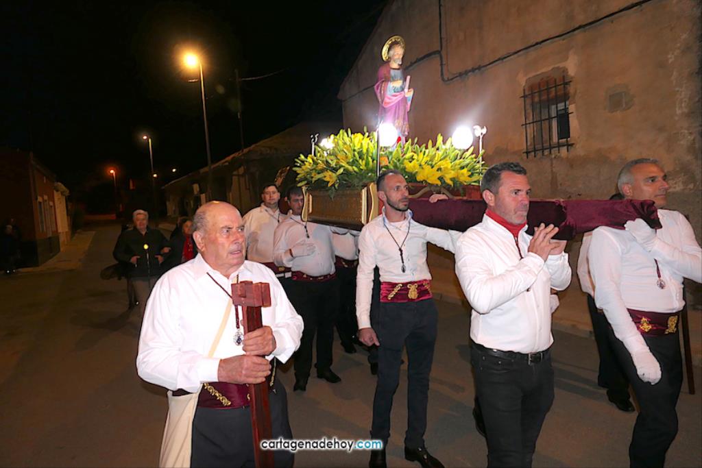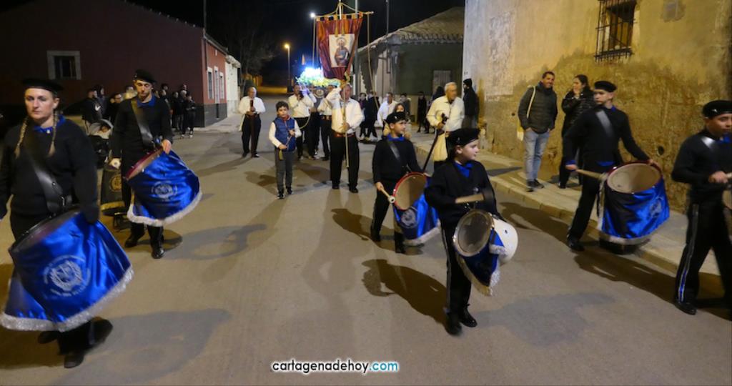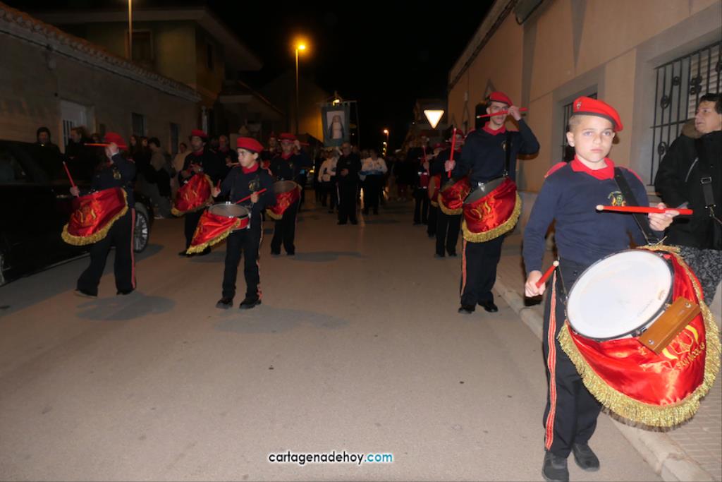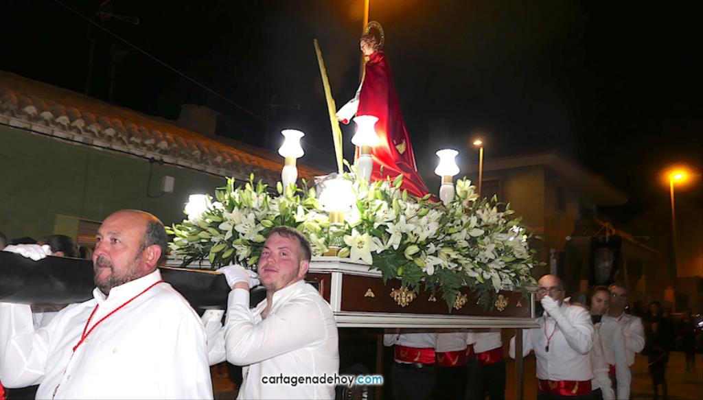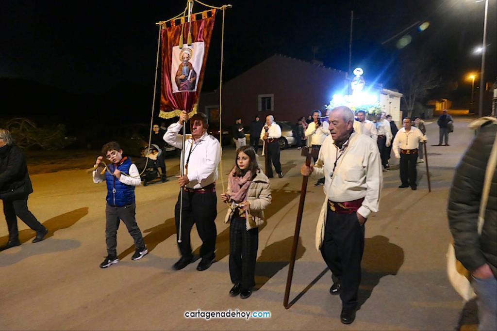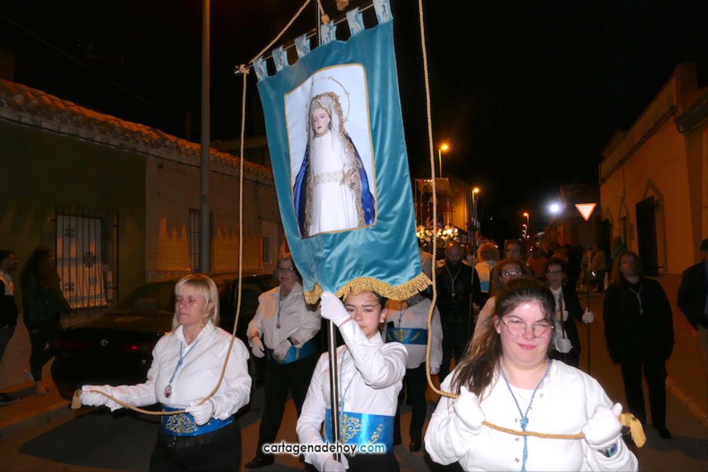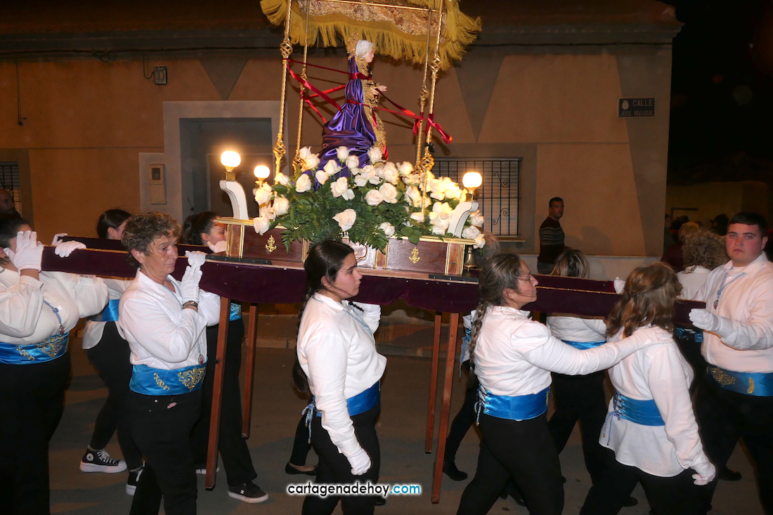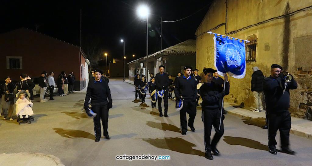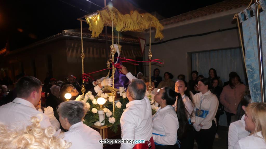 La imagen enriquece un cortejo que ya forman seis imágenes y que anoche volvió a recorrer los pueblos de la diputación de El Beal pese a las fuertes rachas de viento, que provocaron que se partiese la imagen de la Virgen, teniendo que buscarse una solución de emergencia para que continuase en el cortejo.