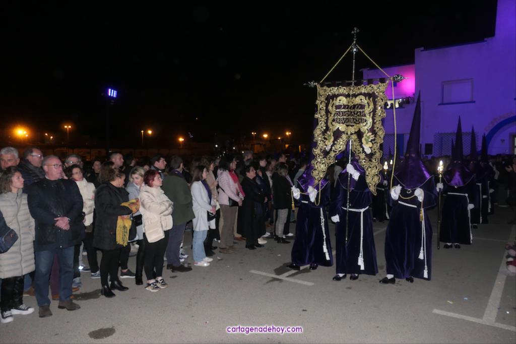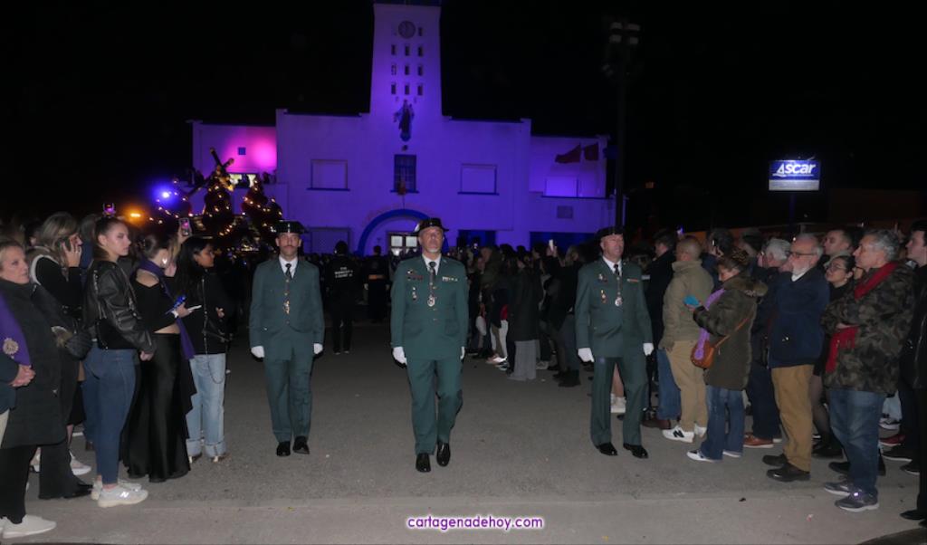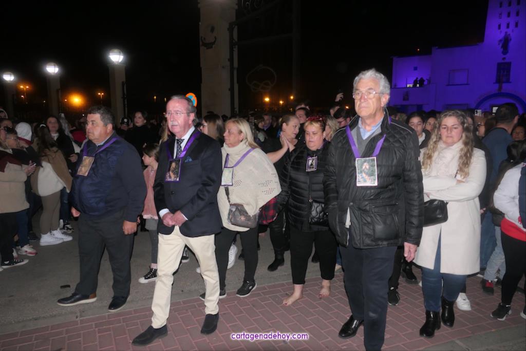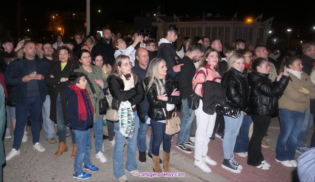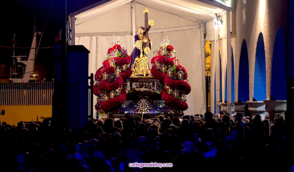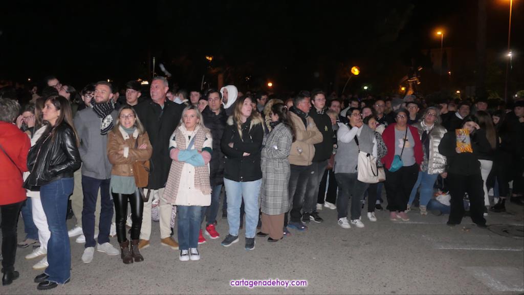 El tiempo respeta y una multitud da la bienvenida al Jesús con su madero, el cual cruza la reja de la Pescadería con el sonido de caracola que hace sonar José María Méndez, quien escasas horas antes ha participado en la procesión de Cabo de Palos.