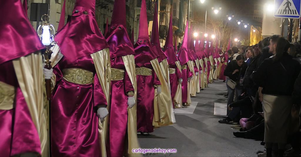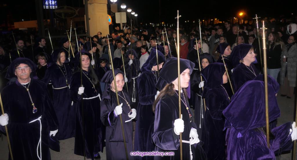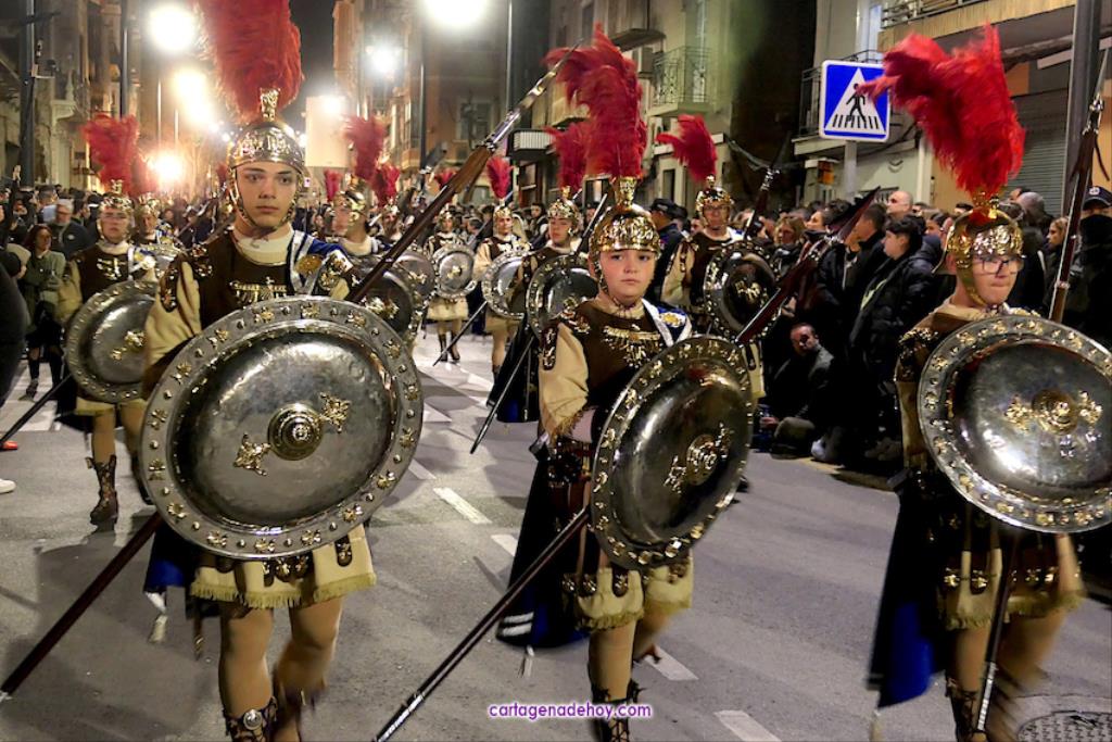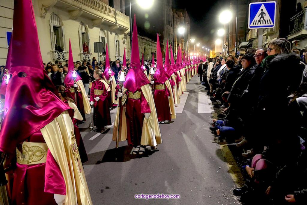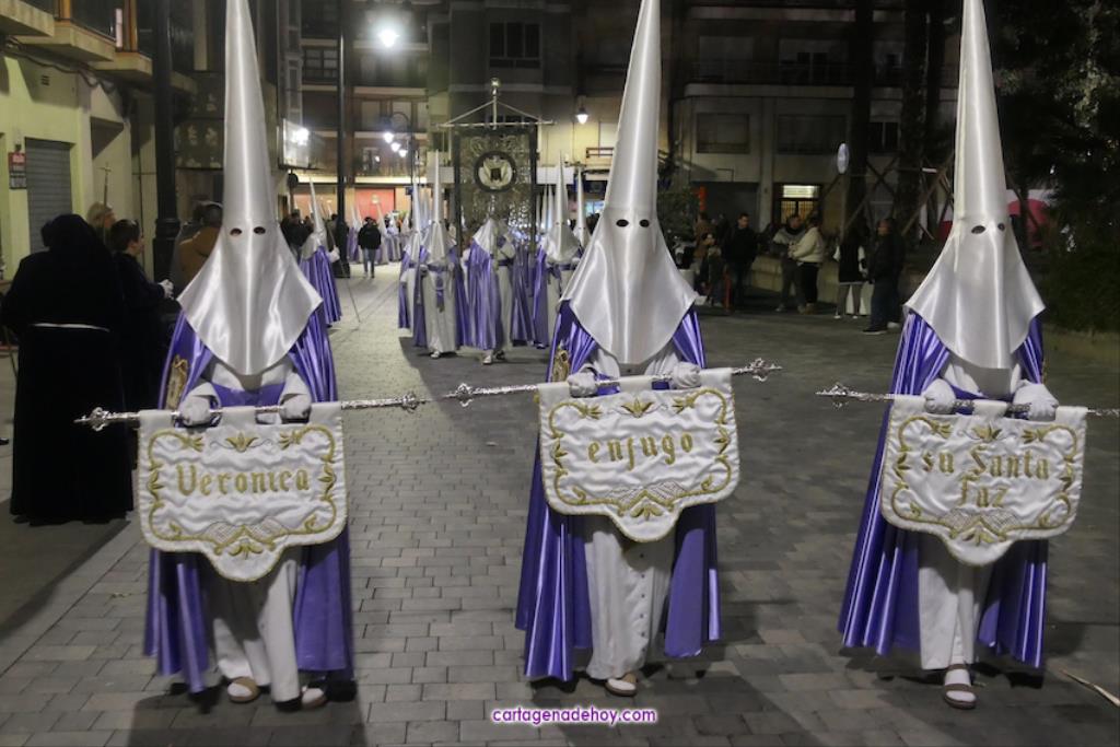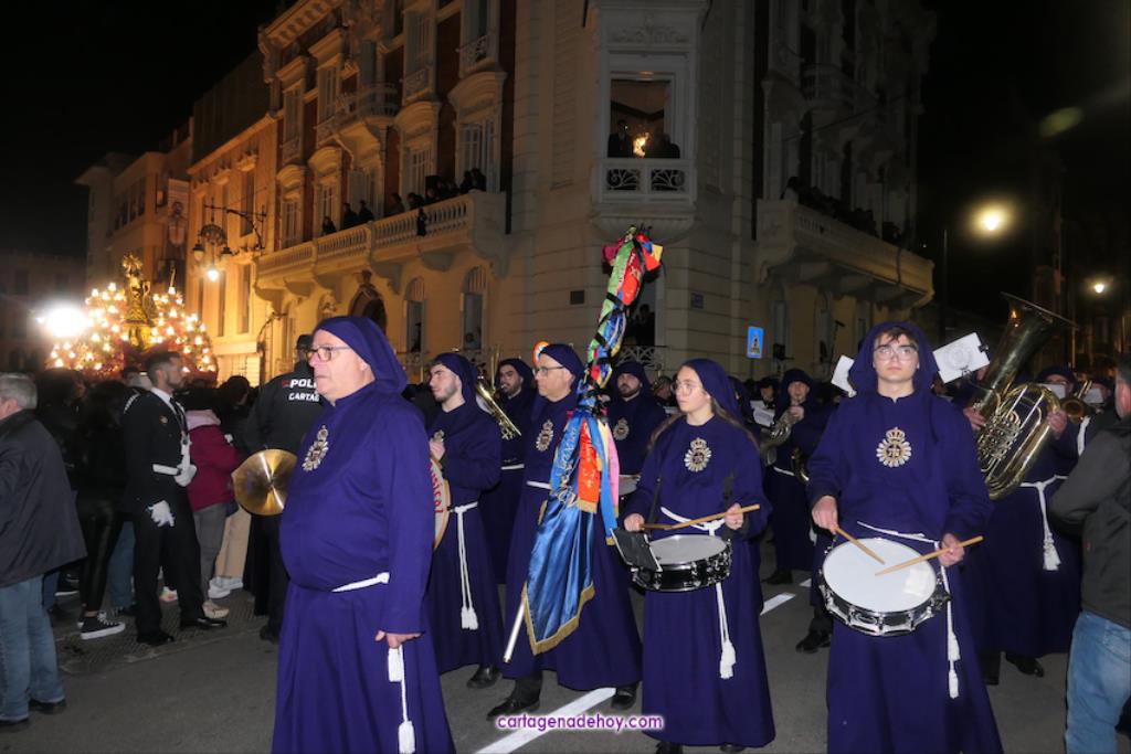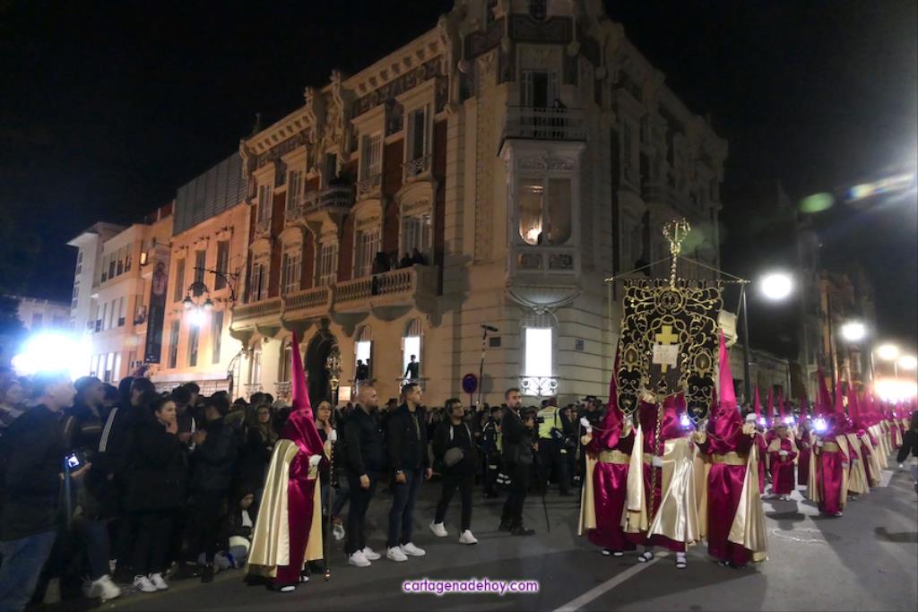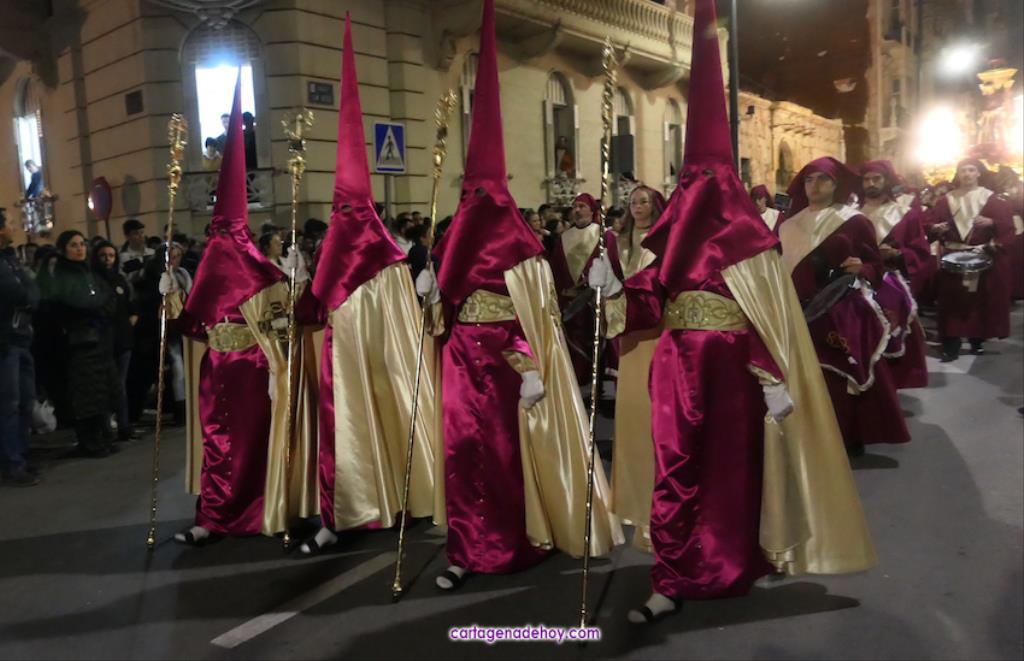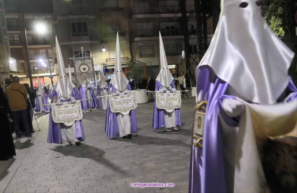 Los tronos ya son los siguientes en la formación. Primero va el Medinaceli, seguido por los primeros que se pusieron en marcha esta madrugada (a las dos desde Santa María): Condena de Jesús y Primera Caída. También lo hizo la Verónica, única agrupación exclusivamente femenina de la Semana Santa de Cartagena, pero en este caso su tercio y trono se detienen junto al desaparecido Cine Central para incorporarse más tarde al cortejo.