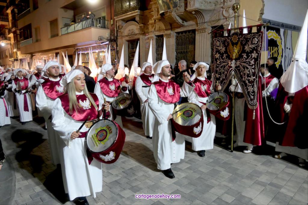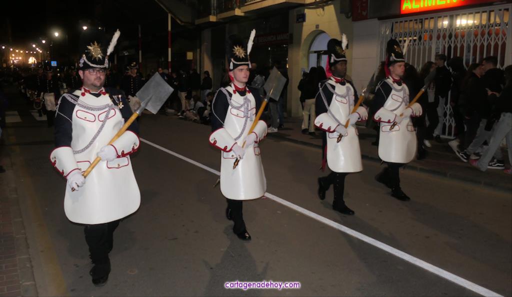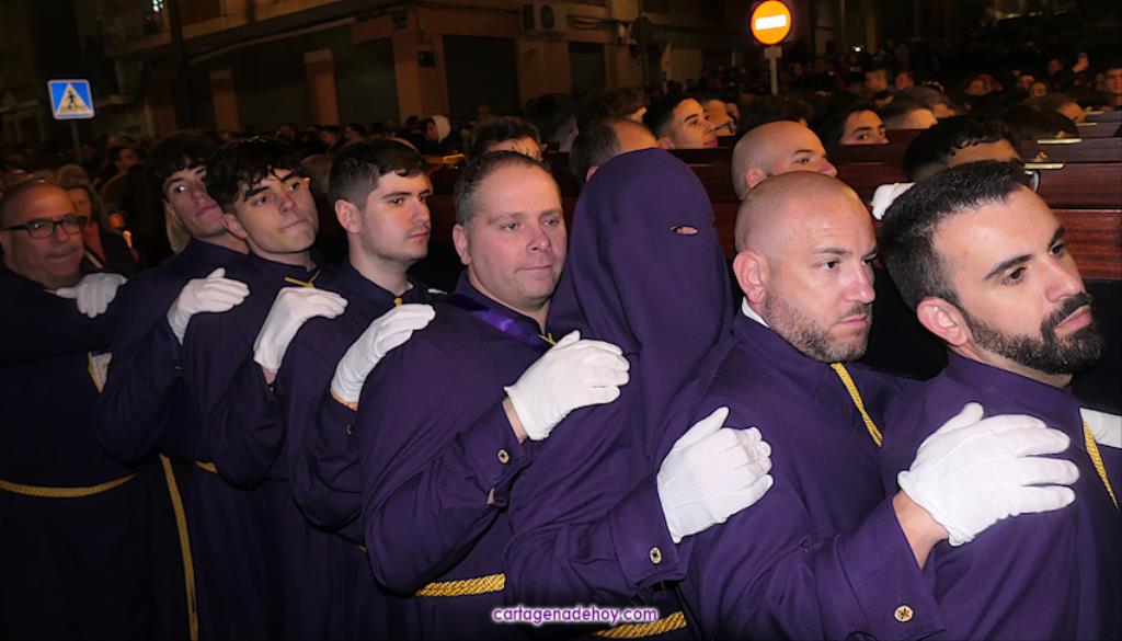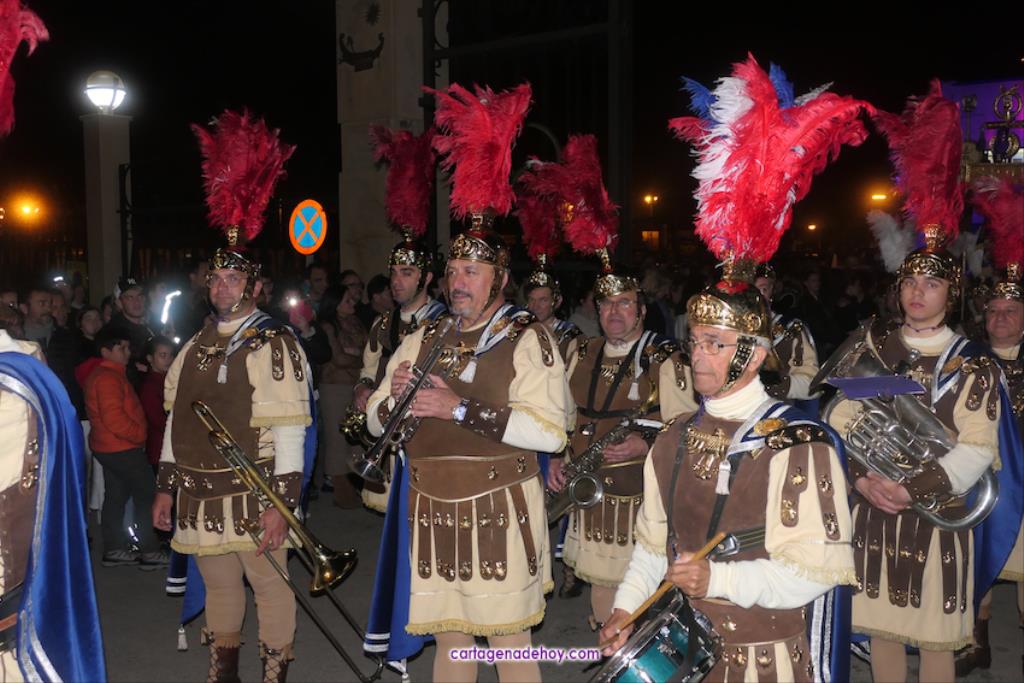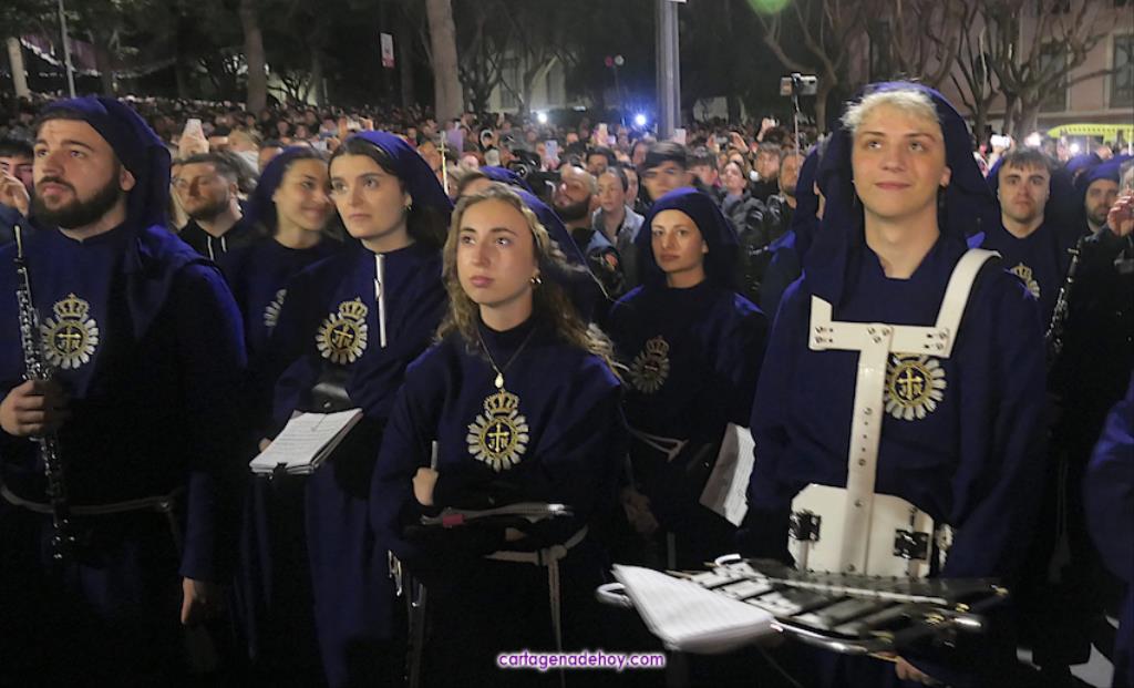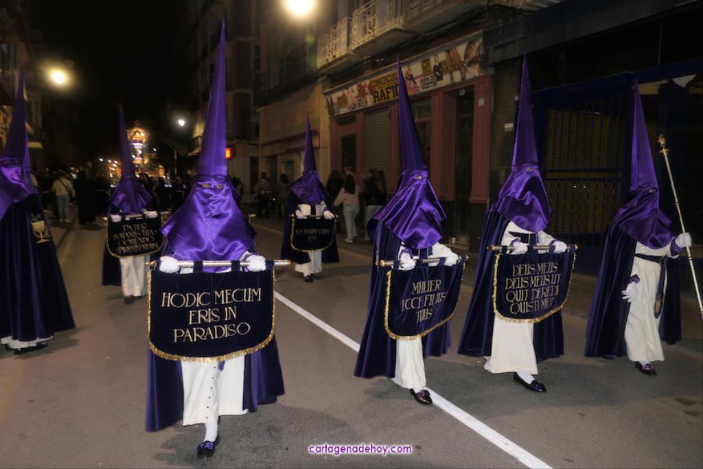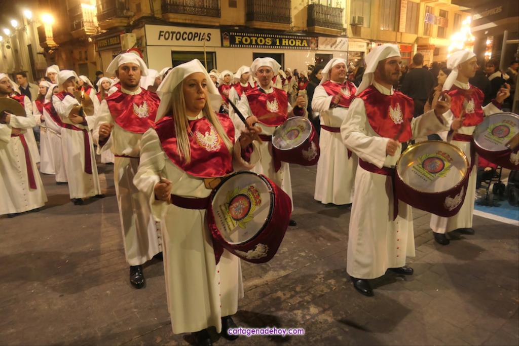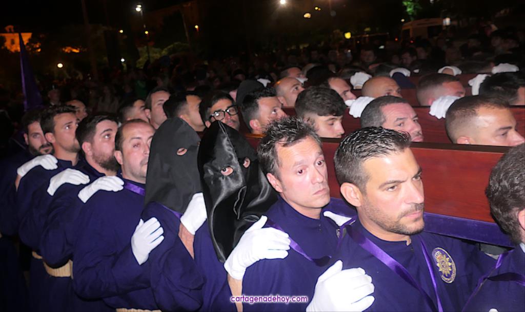 Los tronos ya son los siguientes en la formación. Primero va el Medinaceli, seguido por los primeros que se pusieron en marcha esta madrugada (a las dos desde Santa María): Condena de Jesús y Primera Caída. También lo hizo la Verónica, única agrupación exclusivamente femenina de la Semana Santa de Cartagena, pero en este caso su tercio y trono se detienen junto al desaparecido Cine Central para incorporarse más tarde al cortejo.