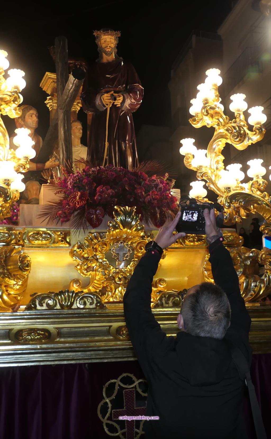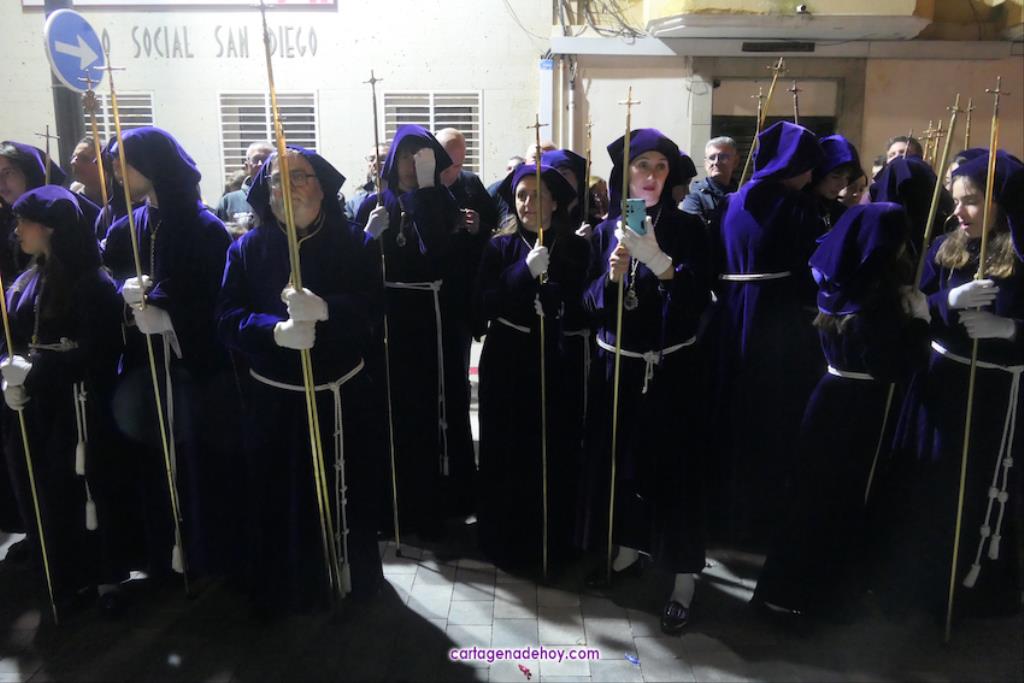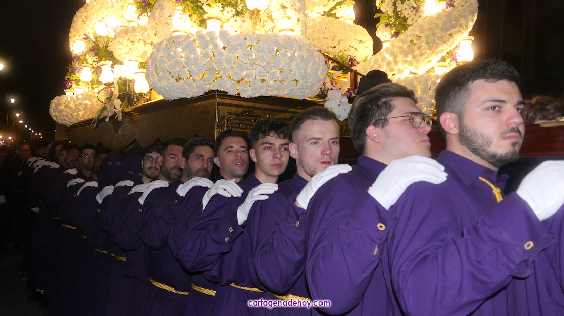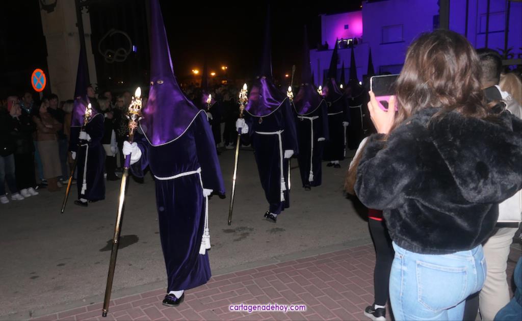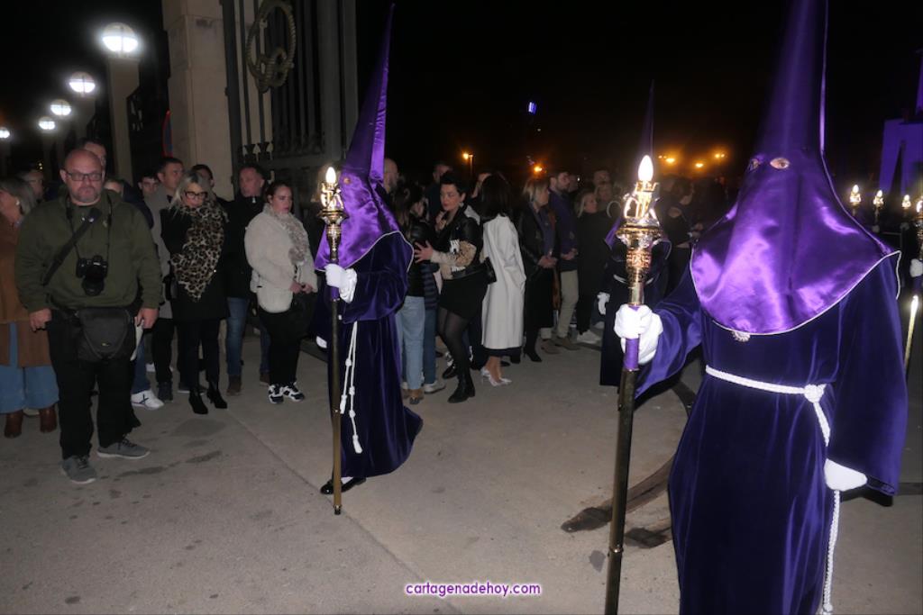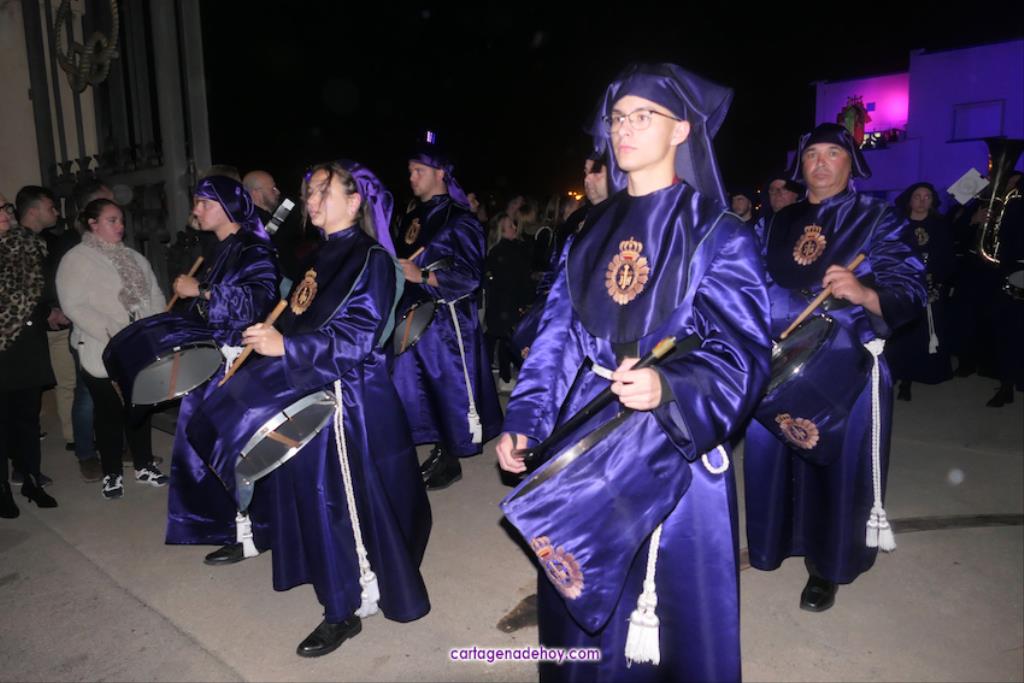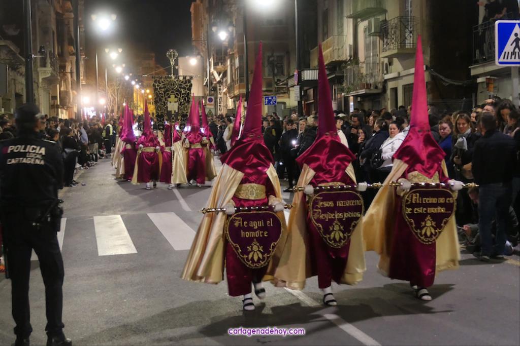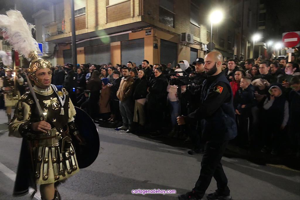 Los tronos ya son los siguientes en la formación. Primero va el Medinaceli, seguido por los primeros que se pusieron en marcha esta madrugada (a las dos desde Santa María): Condena de Jesús y Primera Caída. También lo hizo la Verónica, única agrupación exclusivamente femenina de la Semana Santa de Cartagena, pero en este caso su tercio y trono se detienen junto al desaparecido Cine Central para incorporarse más tarde al cortejo.