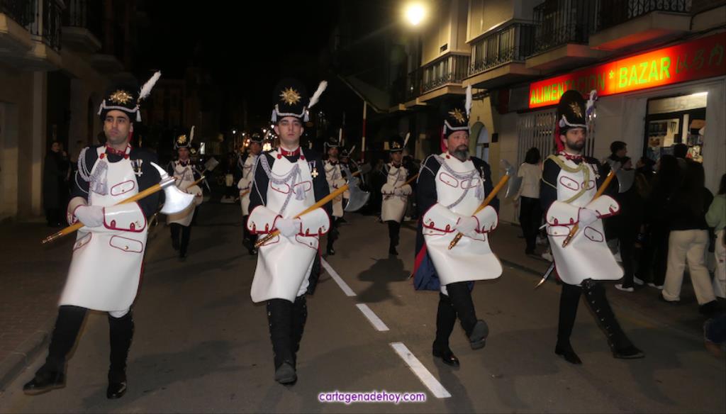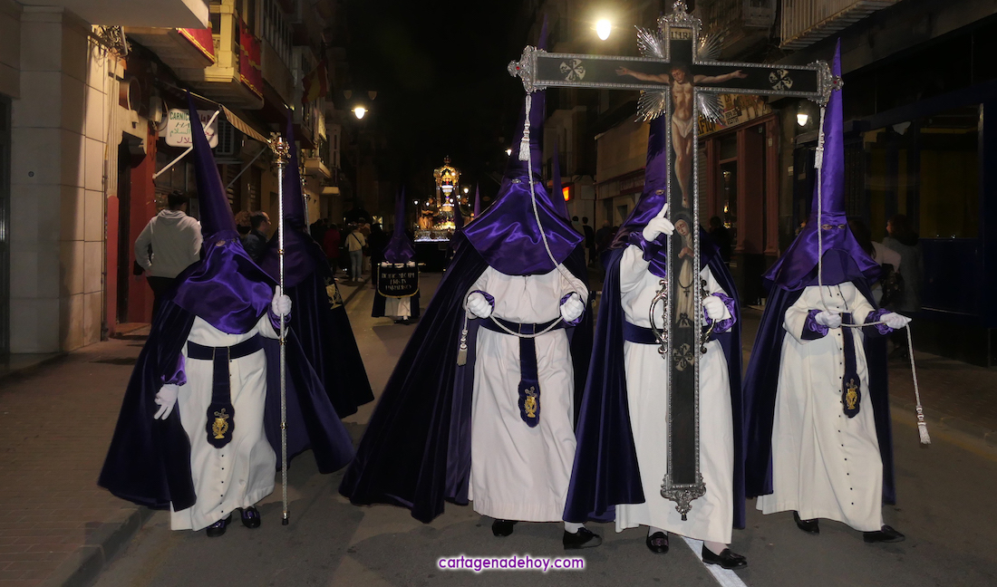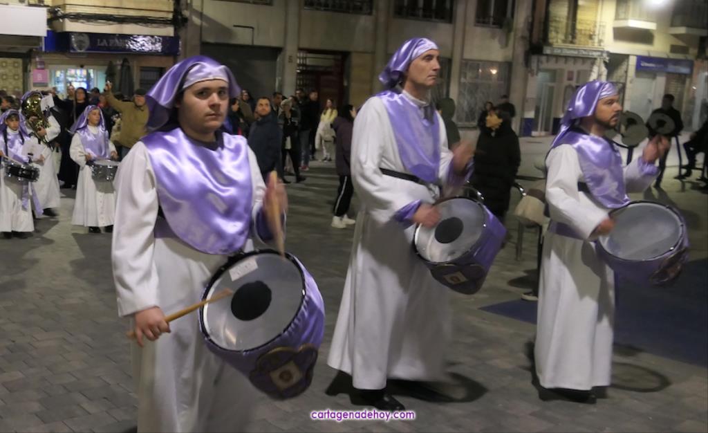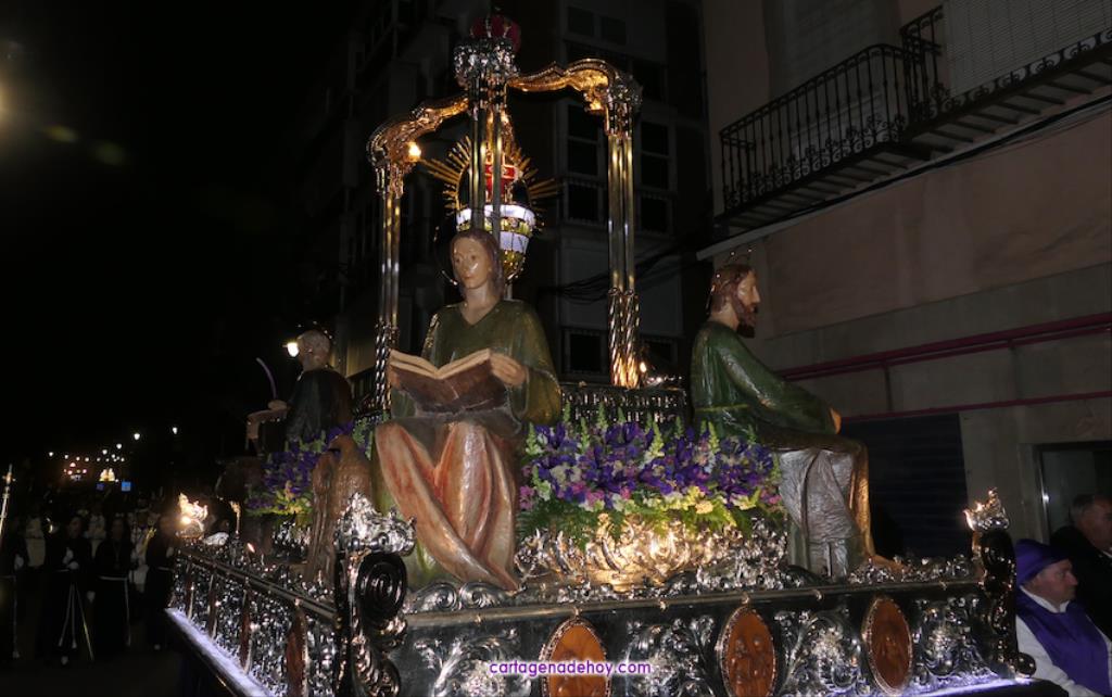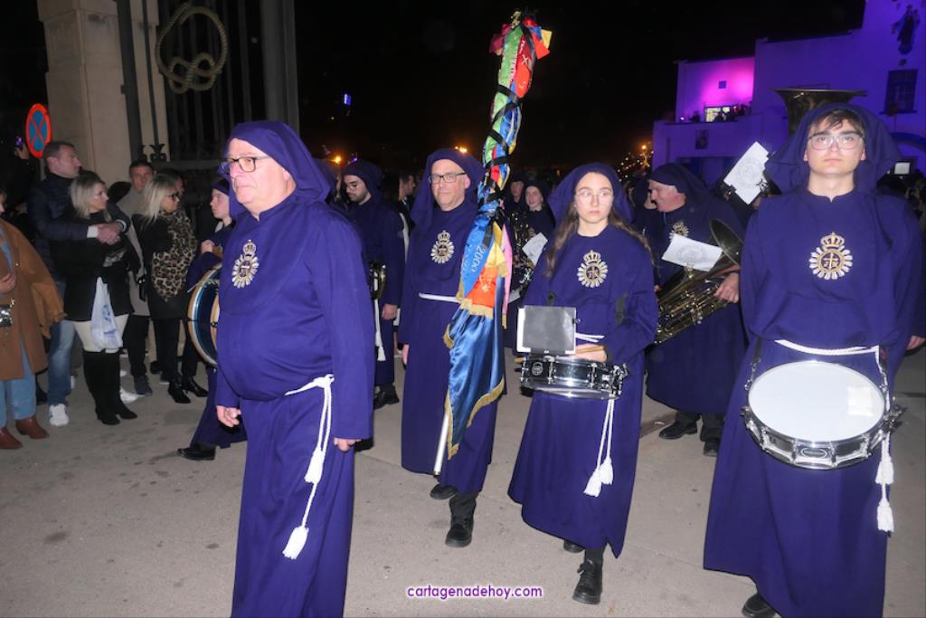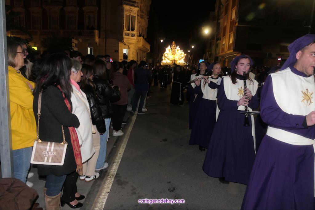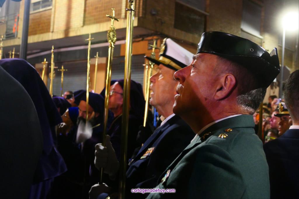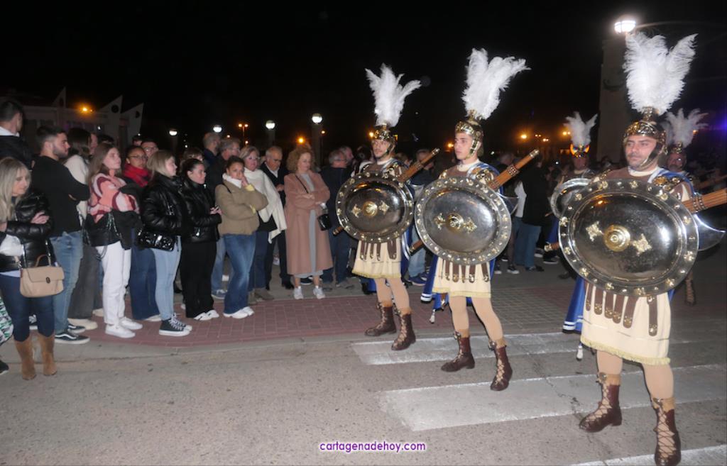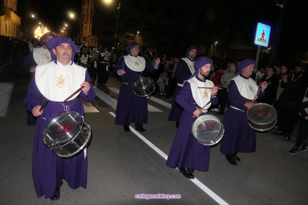 Los tronos ya son los siguientes en la formación. Primero va el Medinaceli, seguido por los primeros que se pusieron en marcha esta madrugada (a las dos desde Santa María): Condena de Jesús y Primera Caída. También lo hizo la Verónica, única agrupación exclusivamente femenina de la Semana Santa de Cartagena, pero en este caso su tercio y trono se detienen junto al desaparecido Cine Central para incorporarse más tarde al cortejo.