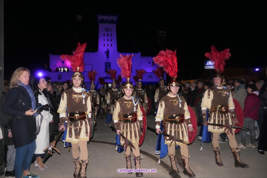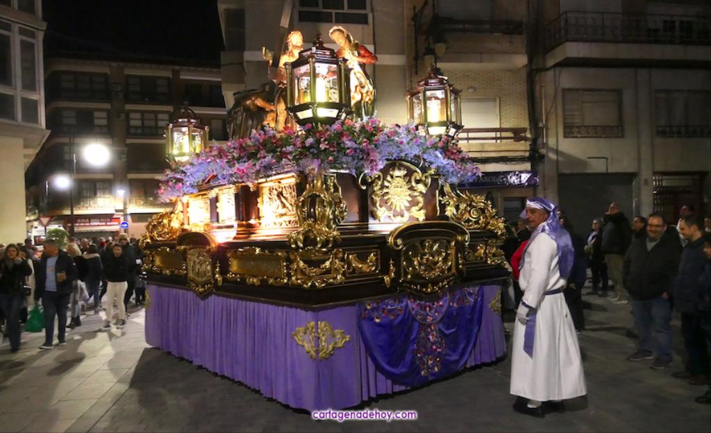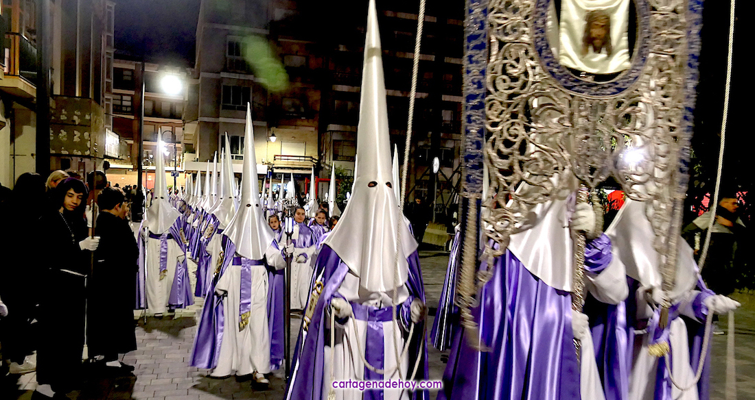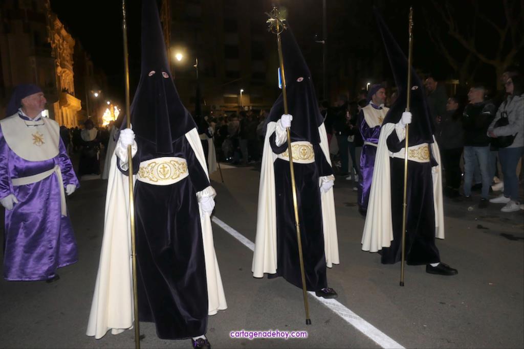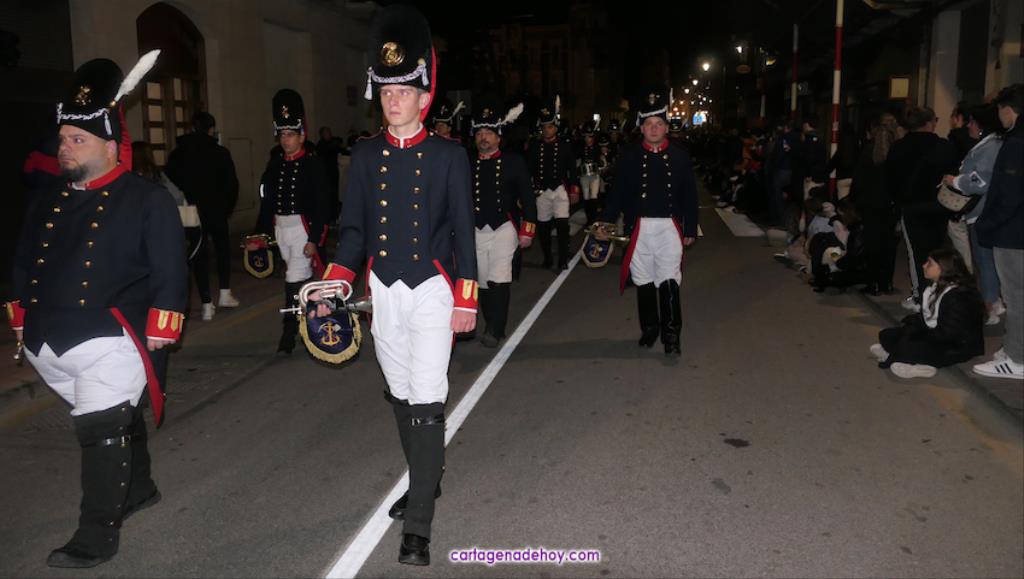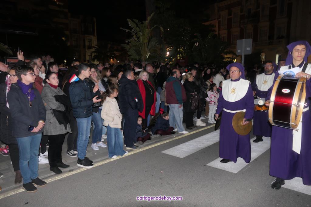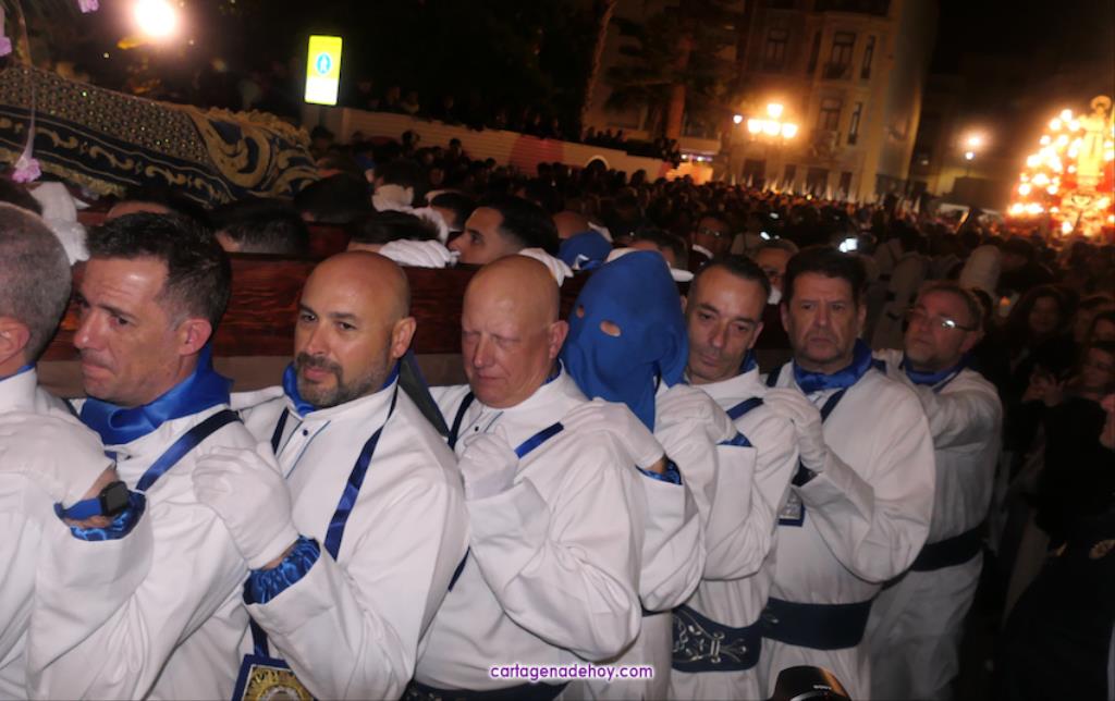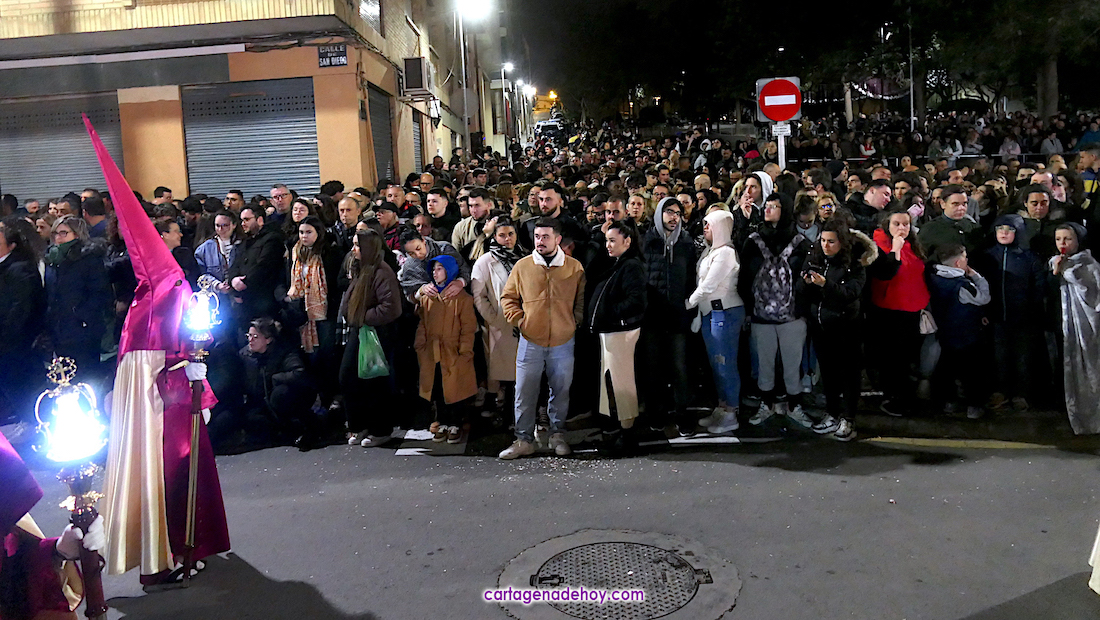 Los tronos ya son los siguientes en la formación. Primero va el Medinaceli, seguido por los primeros que se pusieron en marcha esta madrugada (a las dos desde Santa María): Condena de Jesús y Primera Caída. También lo hizo la Verónica, única agrupación exclusivamente femenina de la Semana Santa de Cartagena, pero en este caso su tercio y trono se detienen junto al desaparecido Cine Central para incorporarse más tarde al cortejo.