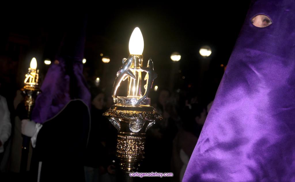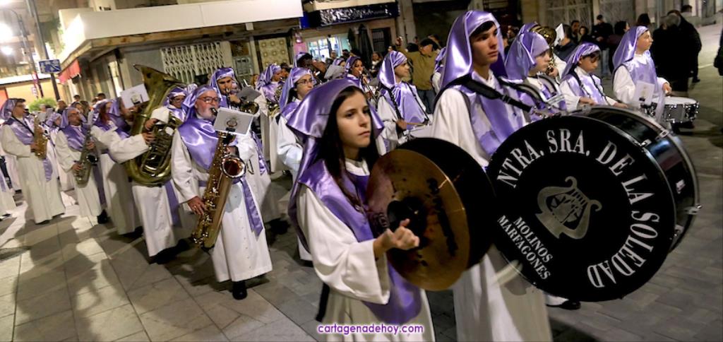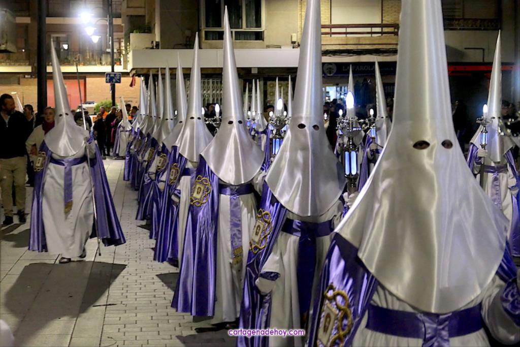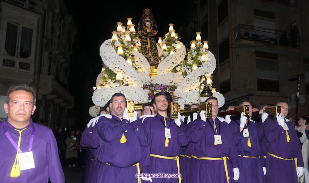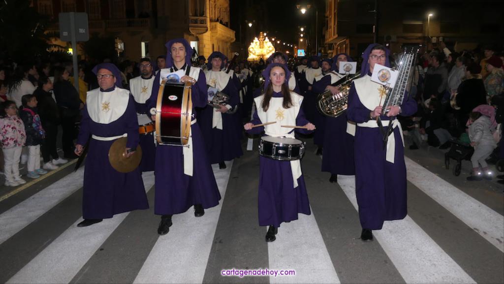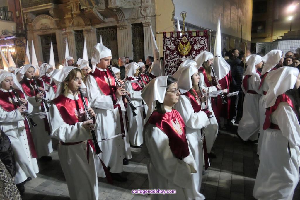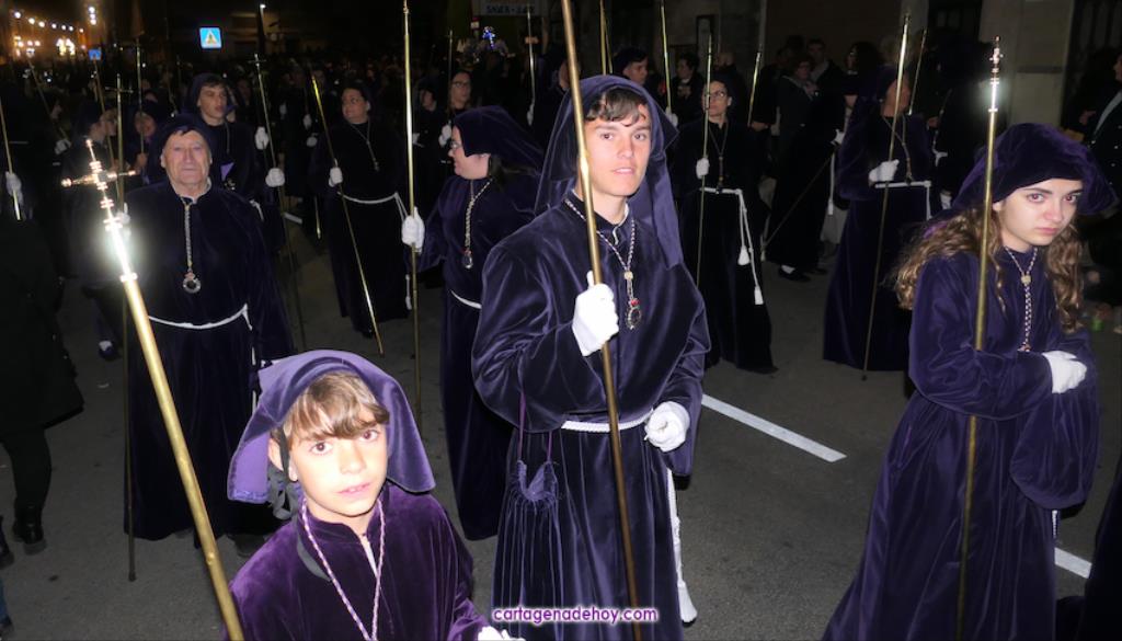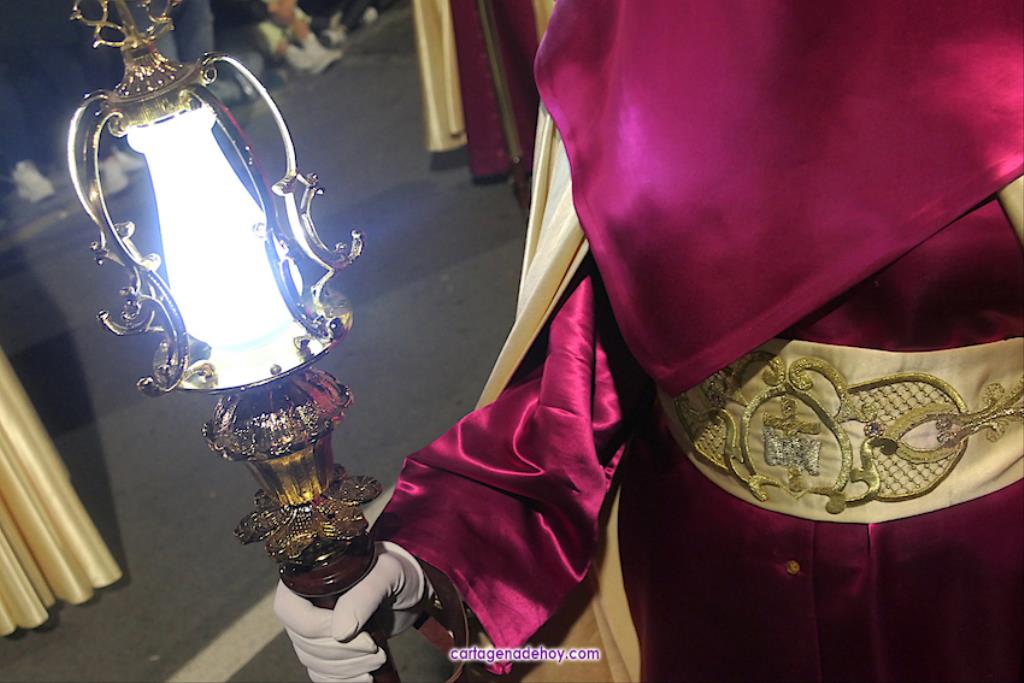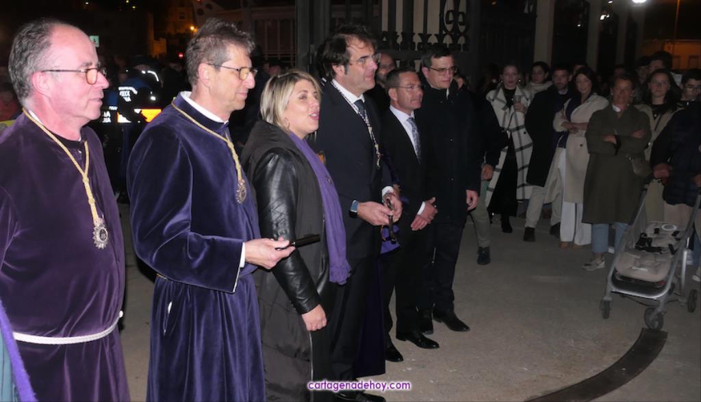Los tronos ya son los siguientes en la formación. Primero va el Medinaceli, seguido por los primeros que se pusieron en marcha esta madrugada (a las dos desde Santa María): Condena de Jesús y Primera Caída. También lo hizo la Verónica, única agrupación exclusivamente femenina de la Semana Santa de Cartagena, pero en este caso su tercio y trono se detienen junto al desaparecido Cine Central para incorporarse más tarde al cortejo.