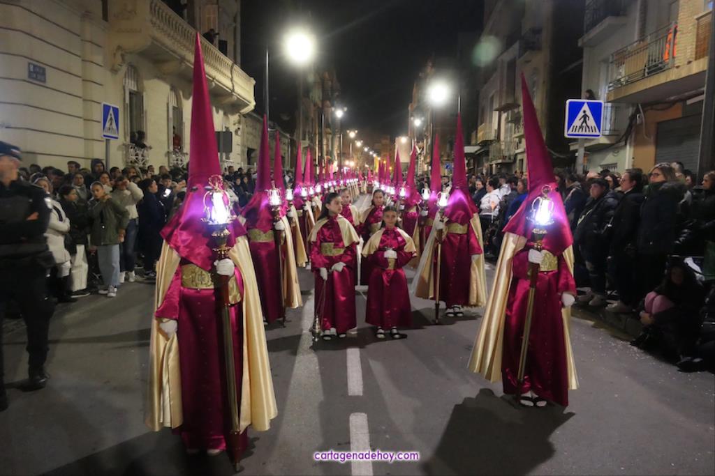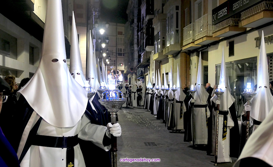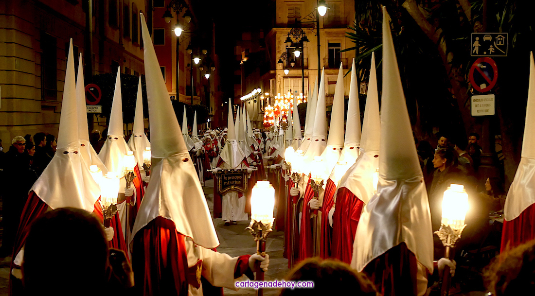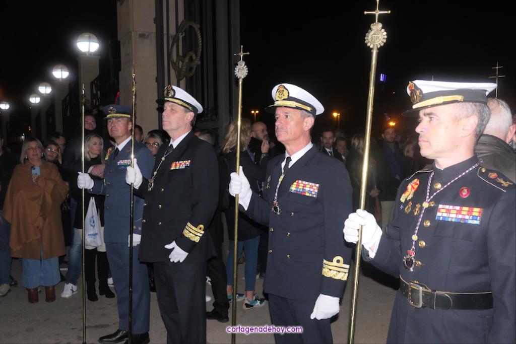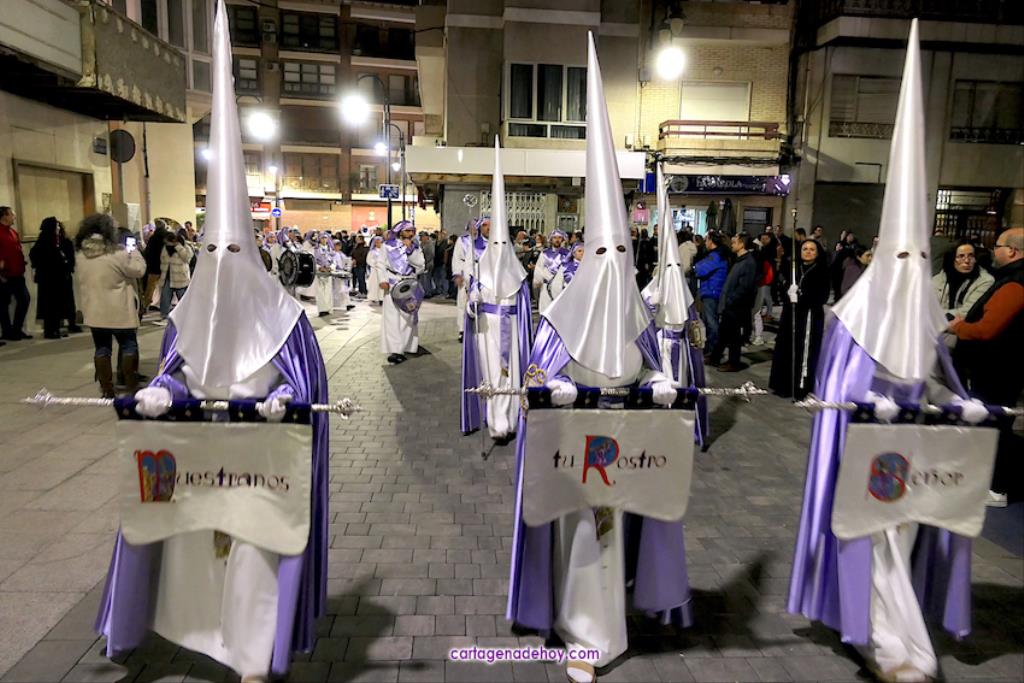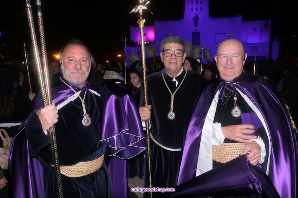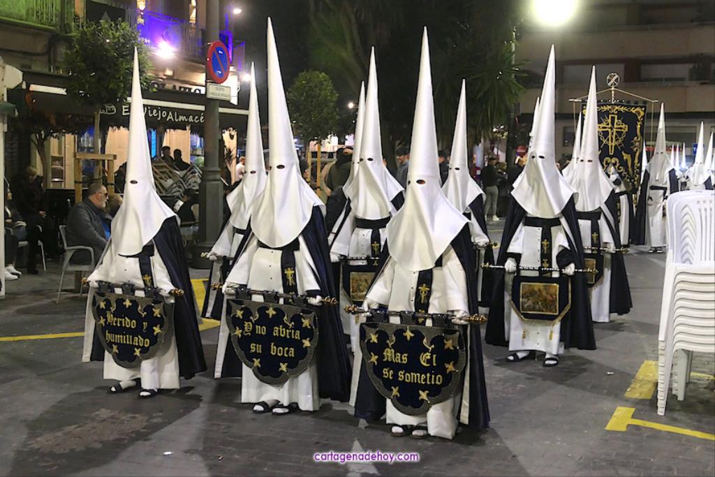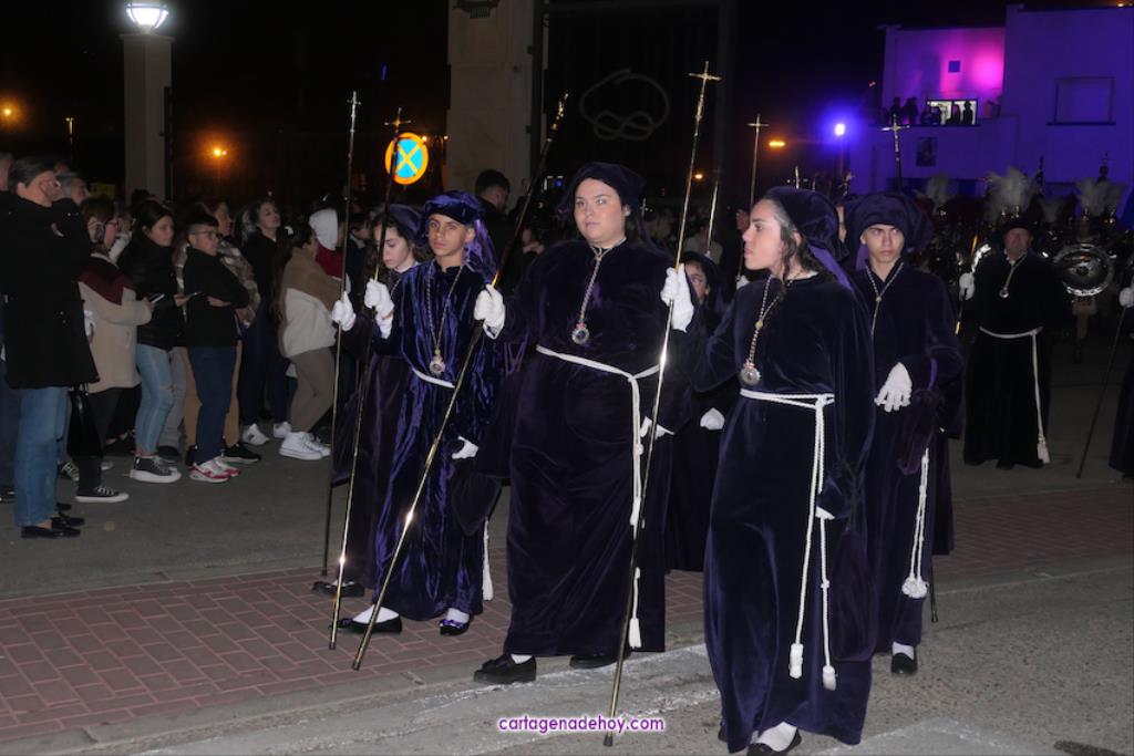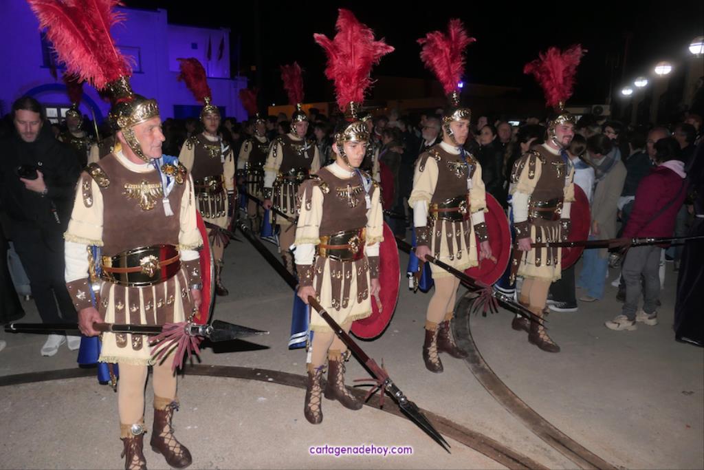 Los tronos ya son los siguientes en la formación. Primero va el Medinaceli, seguido por los primeros que se pusieron en marcha esta madrugada (a las dos desde Santa María): Condena de Jesús y Primera Caída. También lo hizo la Verónica, única agrupación exclusivamente femenina de la Semana Santa de Cartagena, pero en este caso su tercio y trono se detienen junto al desaparecido Cine Central para incorporarse más tarde al cortejo.