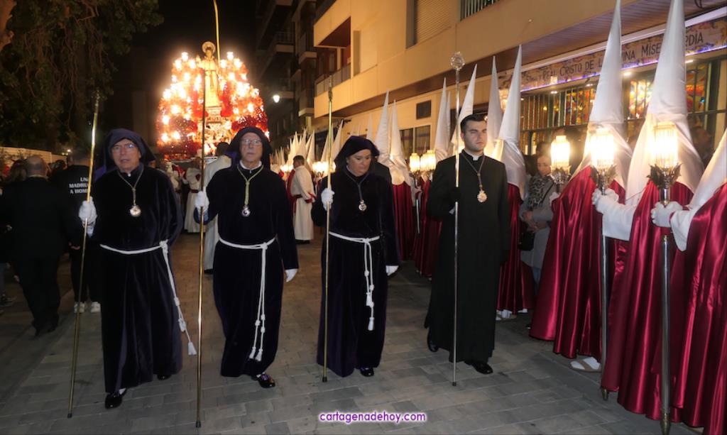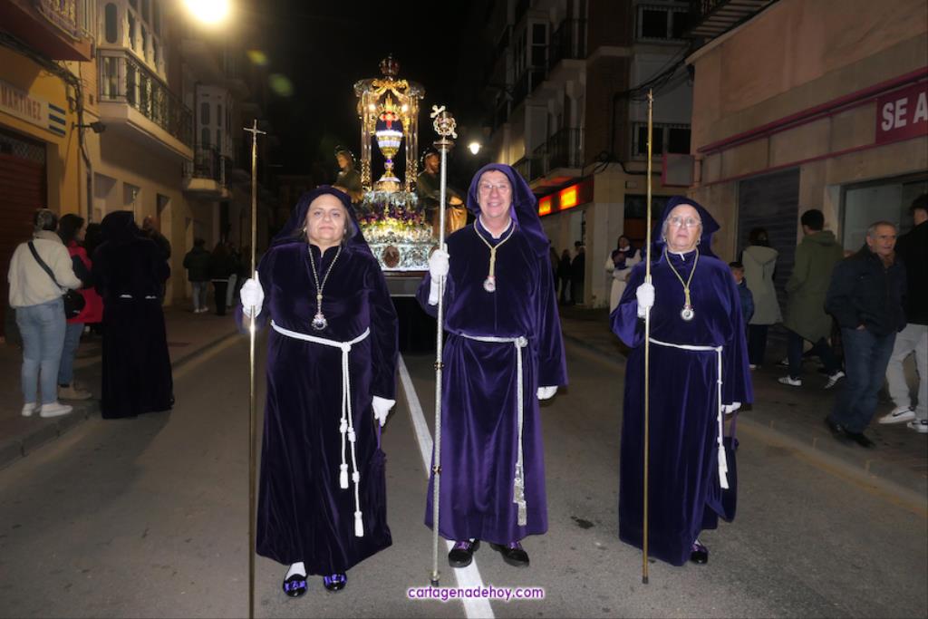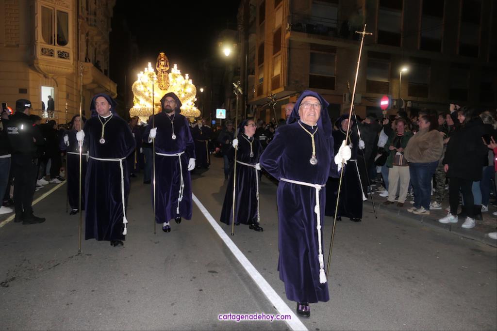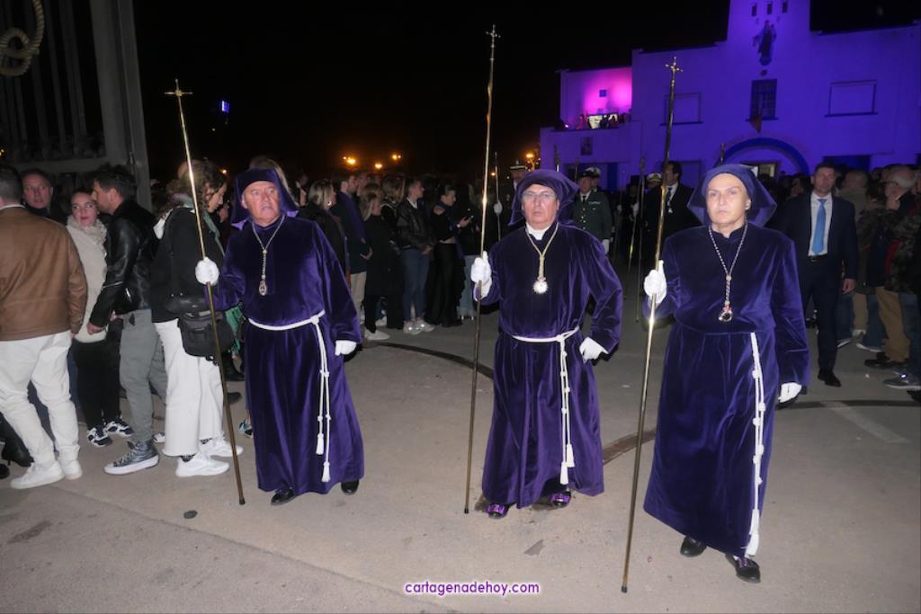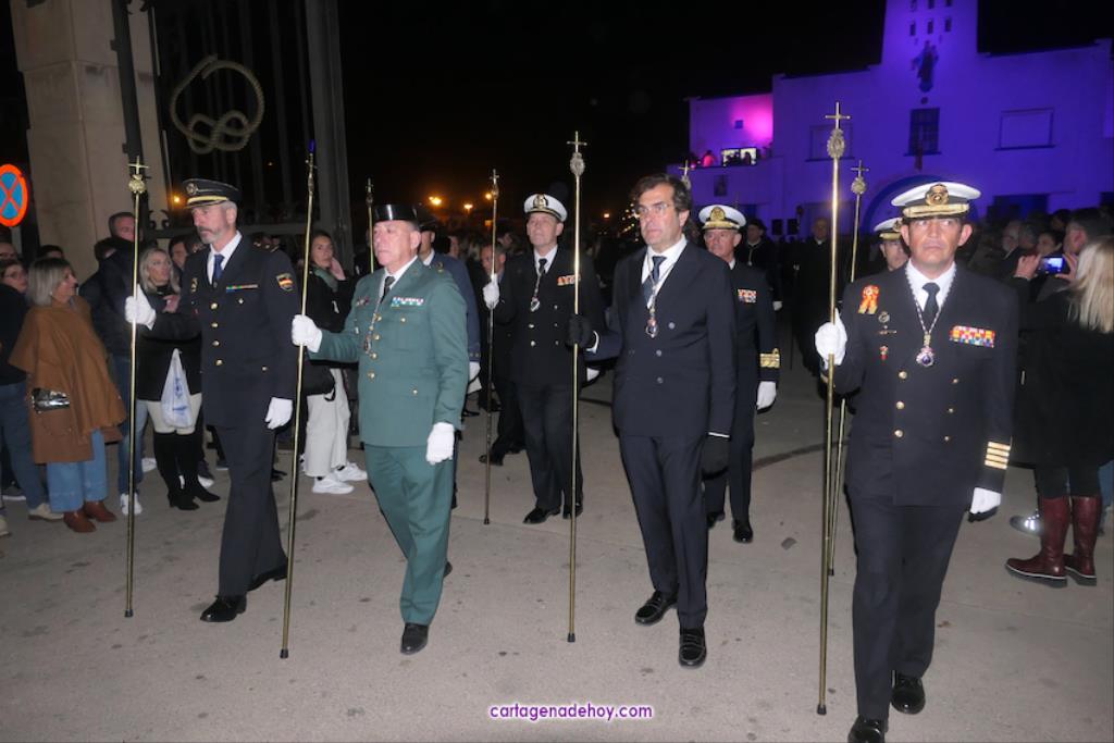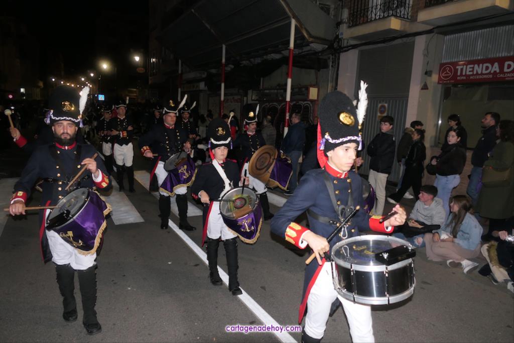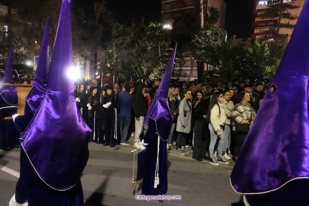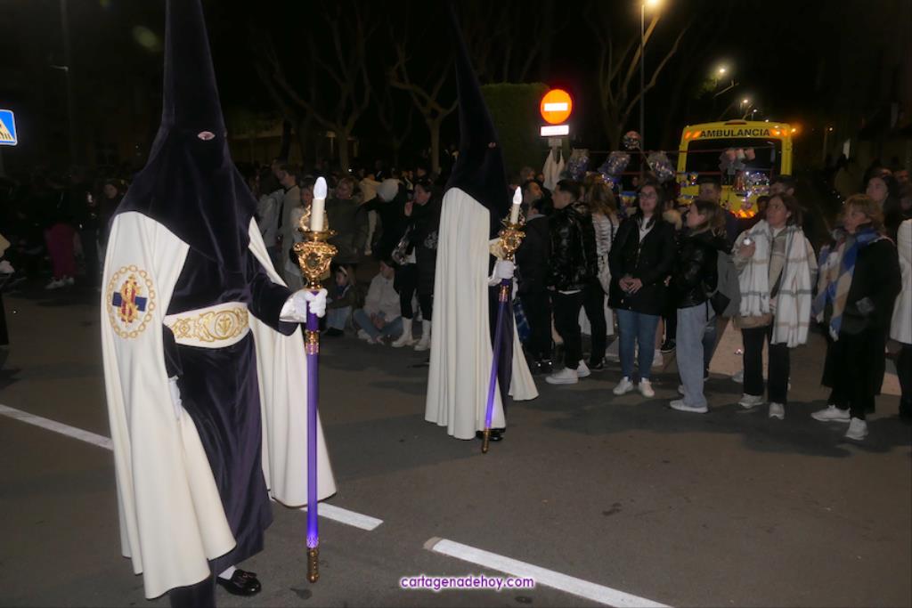 Los tronos ya son los siguientes en la formación. Primero va el Medinaceli, seguido por los primeros que se pusieron en marcha esta madrugada (a las dos desde Santa María): Condena de Jesús y Primera Caída. También lo hizo la Verónica, única agrupación exclusivamente femenina de la Semana Santa de Cartagena, pero en este caso su tercio y trono se detienen junto al desaparecido Cine Central para incorporarse más tarde al cortejo.