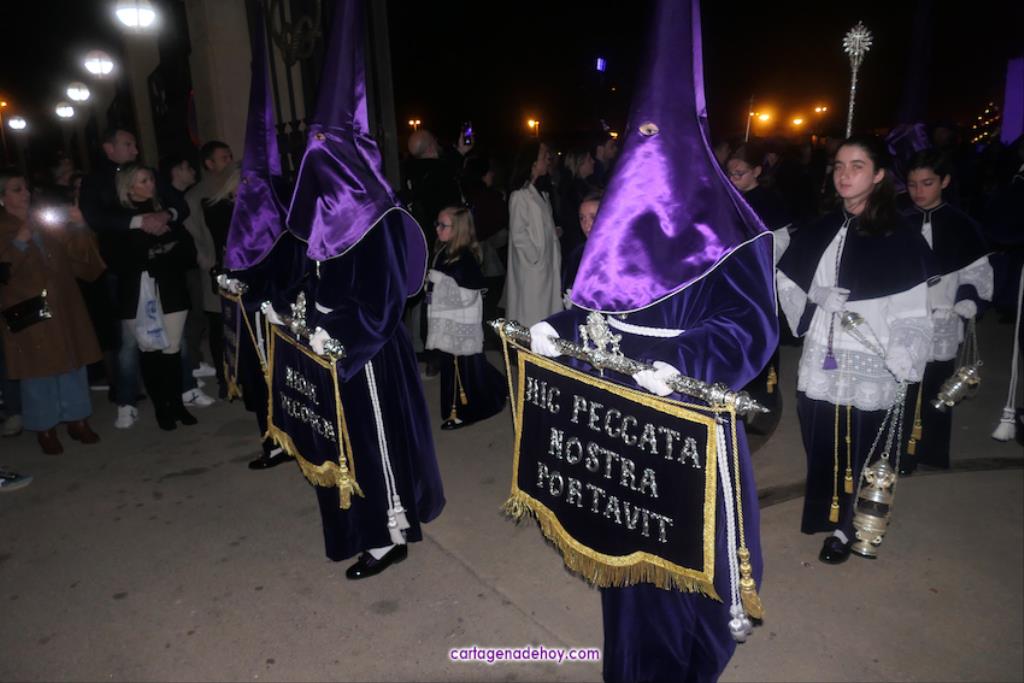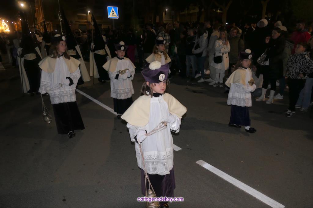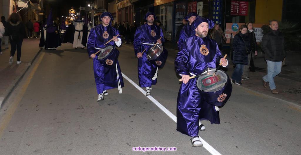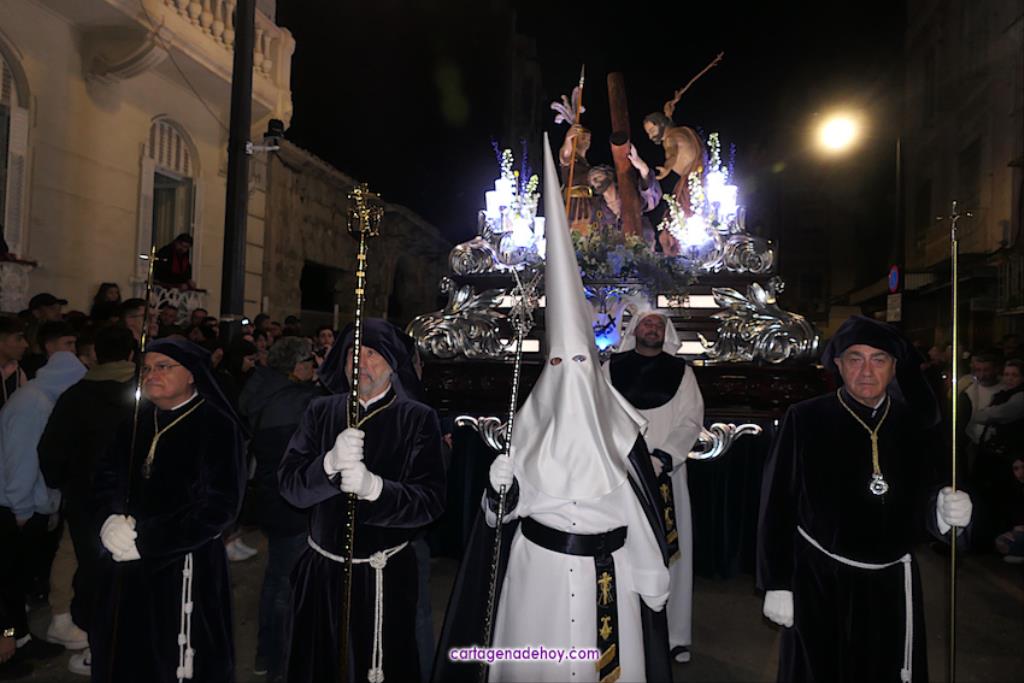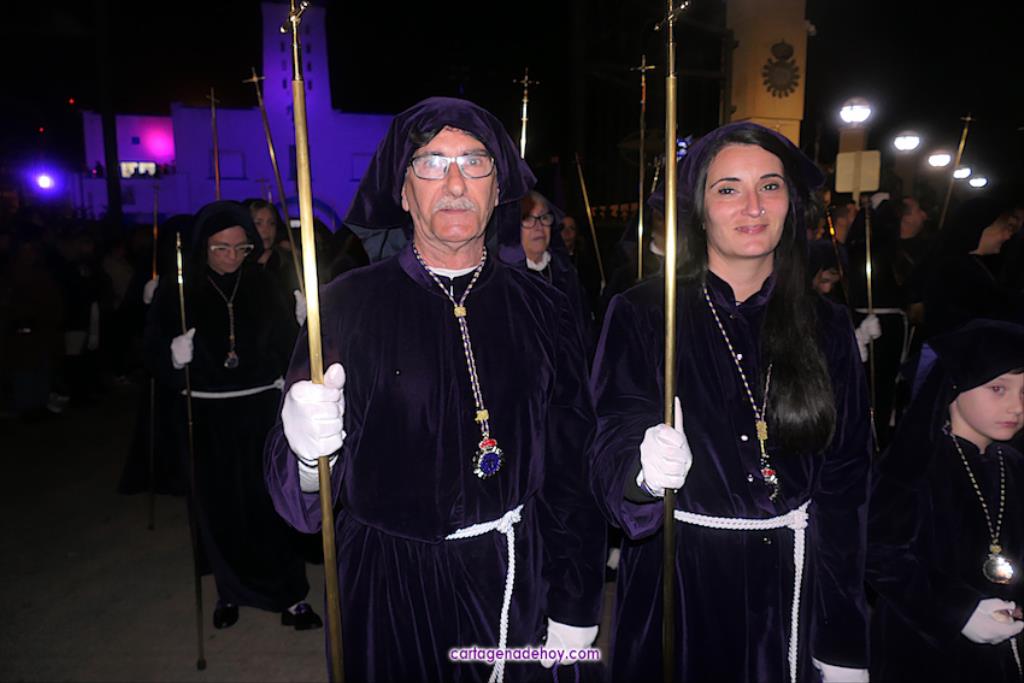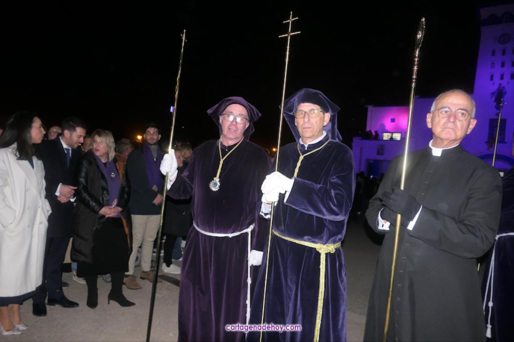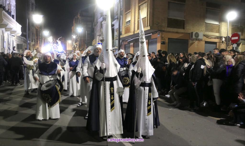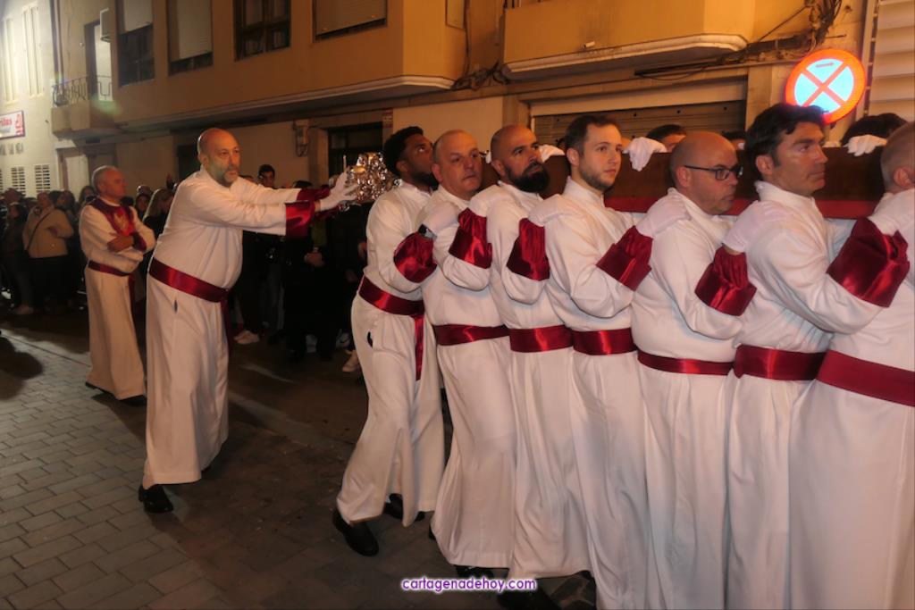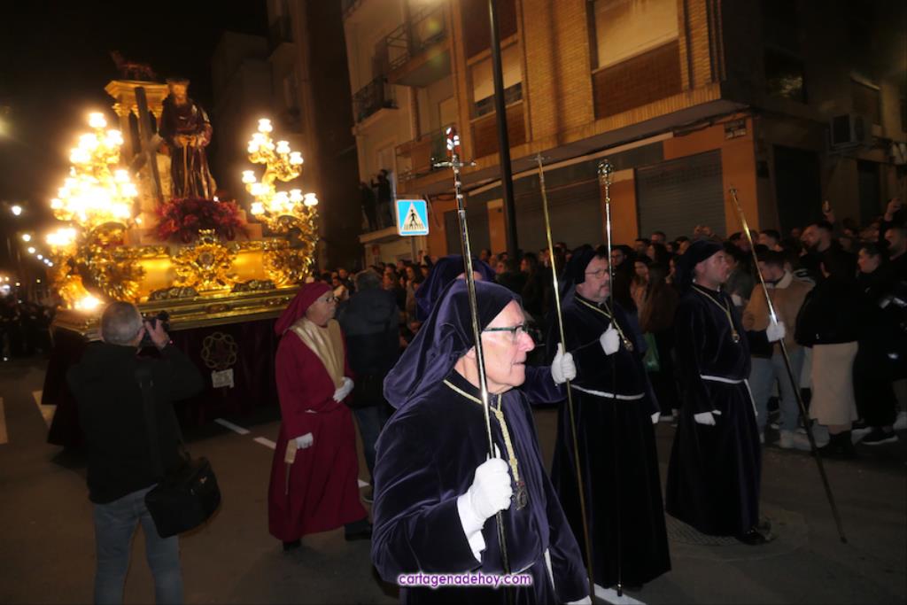 Los tronos ya son los siguientes en la formación. Primero va el Medinaceli, seguido por los primeros que se pusieron en marcha esta madrugada (a las dos desde Santa María): Condena de Jesús y Primera Caída. También lo hizo la Verónica, única agrupación exclusivamente femenina de la Semana Santa de Cartagena, pero en este caso su tercio y trono se detienen junto al desaparecido Cine Central para incorporarse más tarde al cortejo.