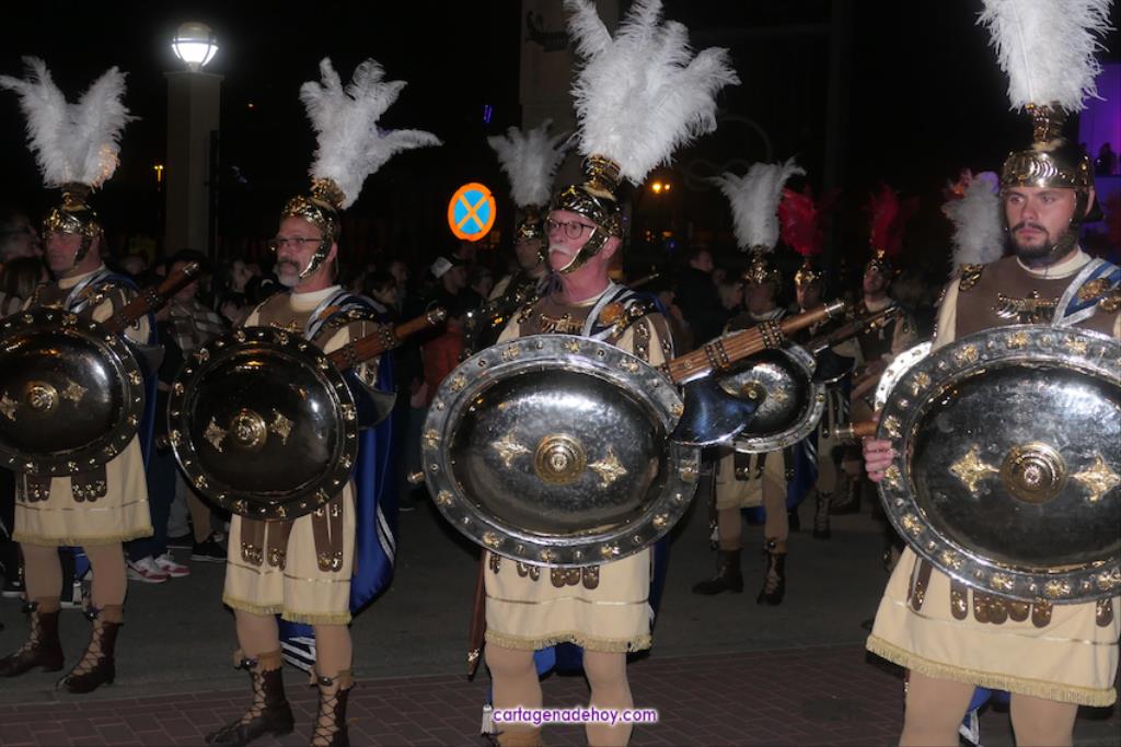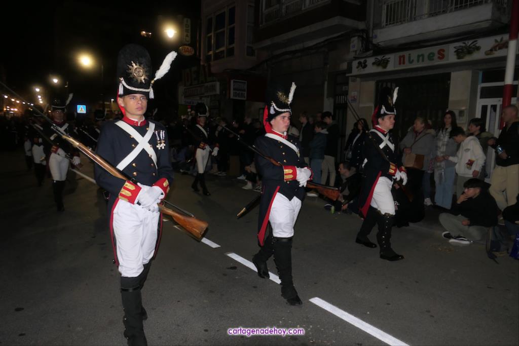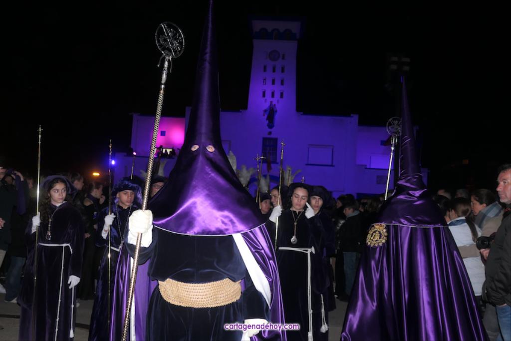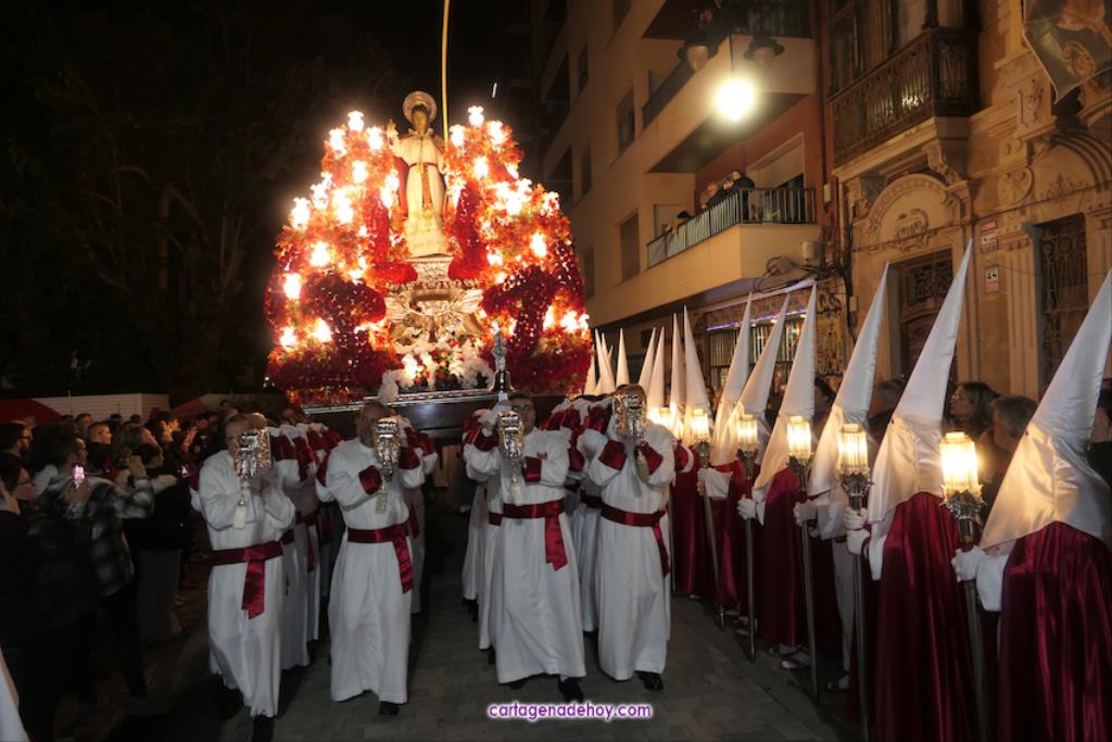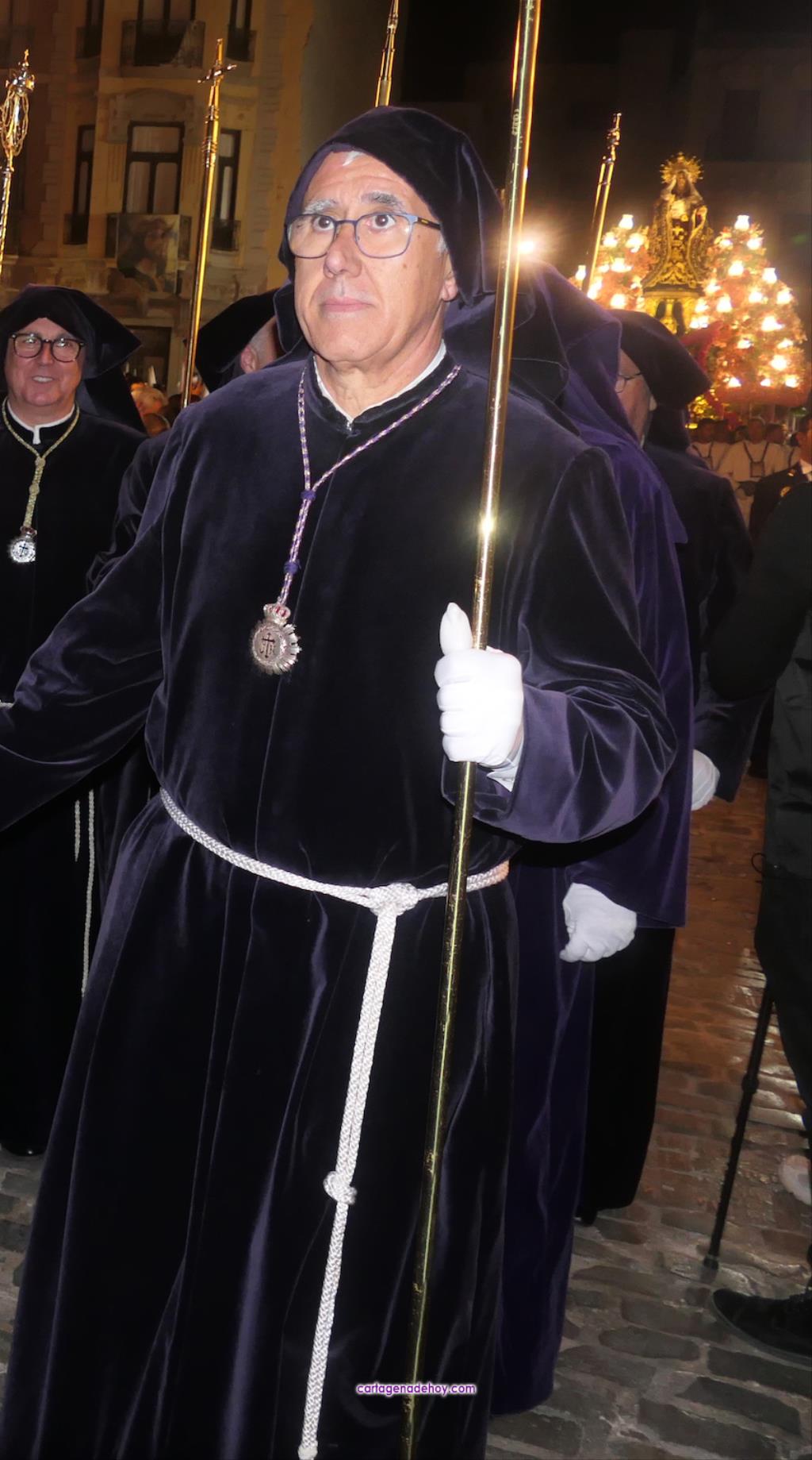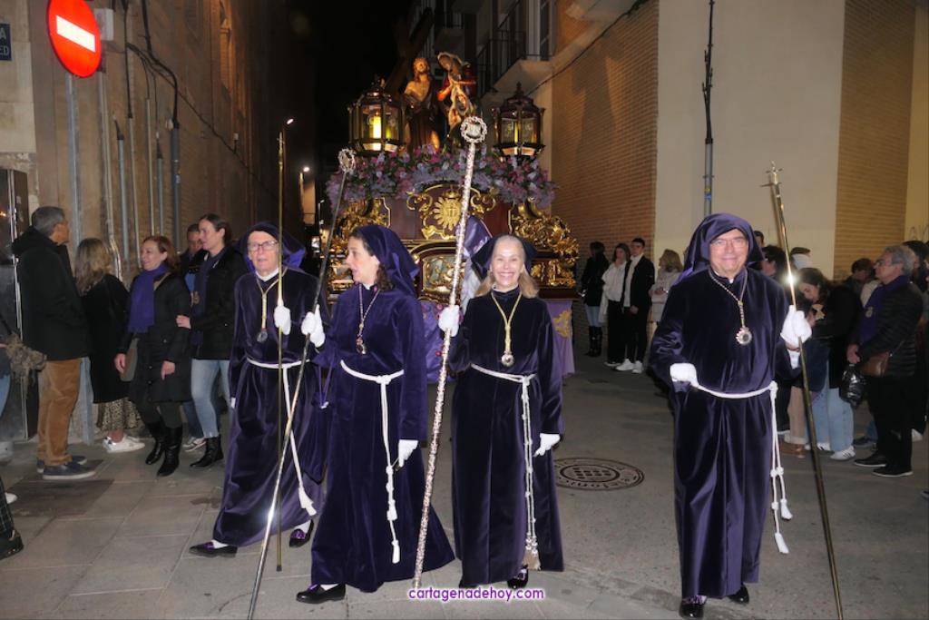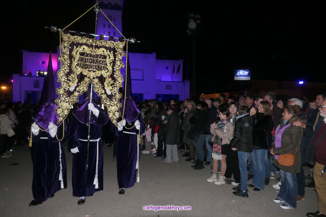 Los tronos ya son los siguientes en la formación. Primero va el Medinaceli, seguido por los primeros que se pusieron en marcha esta madrugada (a las dos desde Santa María): Condena de Jesús y Primera Caída. También lo hizo la Verónica, única agrupación exclusivamente femenina de la Semana Santa de Cartagena, pero en este caso su tercio y trono se detienen junto al desaparecido Cine Central para incorporarse más tarde al cortejo.
