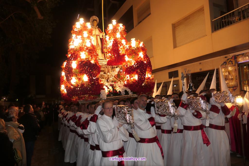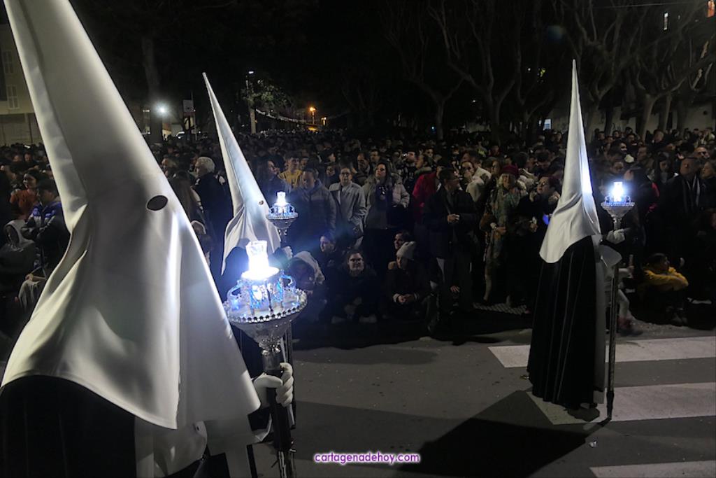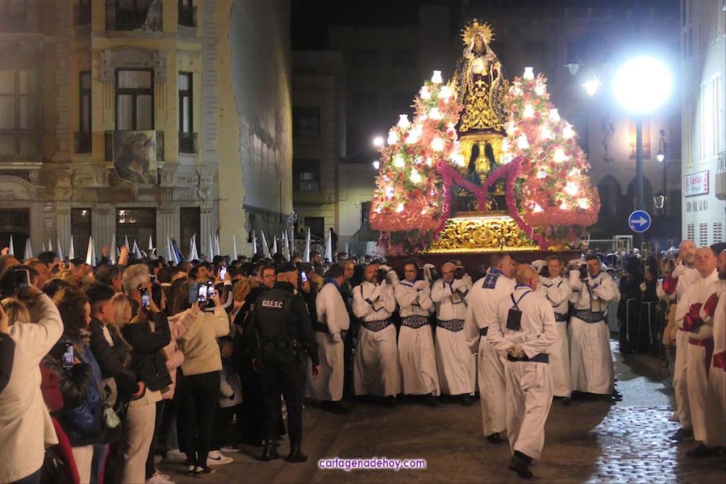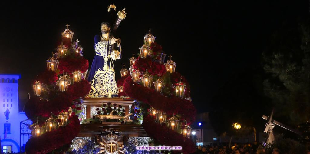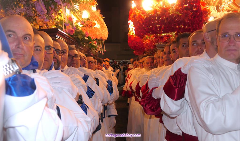 El tiempo respetó y volvió a ser ‘la madrugada de cada año en la que Cartagena no duerme’ con miles de personas de trasiego por la ciudad para ver salir a las diferentes procesiones, siendo el culmen cuando el Nazareno se encuentro con su madre, ‘La Pequeñica’. En la imagen, salida del Jesús desde la Pescadería con el sonido de la caracola.