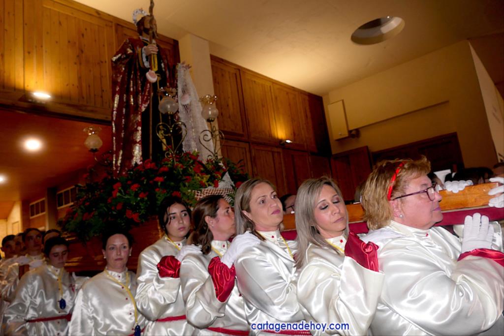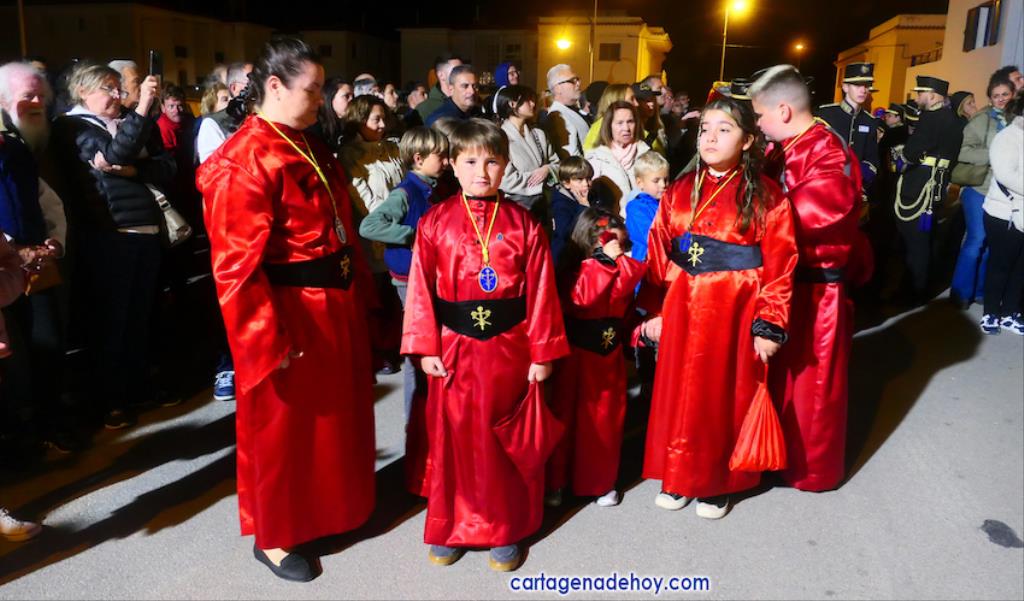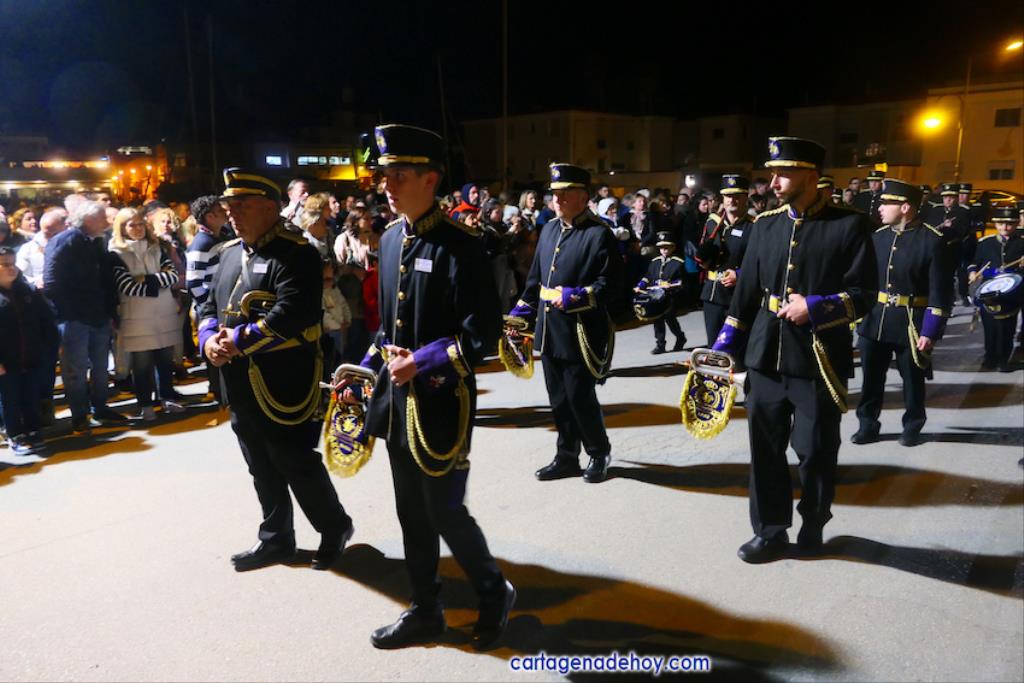 Es la noche de la muerte de Jesucristo, en este caso como Cristo de los Pescadores, quien cruza el pórtico de la iglesia a continuación, situándose por delante el protocolo con el hermano mayor, Pedro Solano; el pregonero de este año, Gonzalo Wandosell; la rectora de la UPCT, Beatriz Miguel; los ediles Cristina Mora y López Pretel, el consejero antes aludido y representantes militares de Marina.
