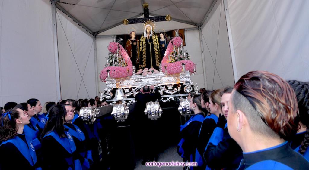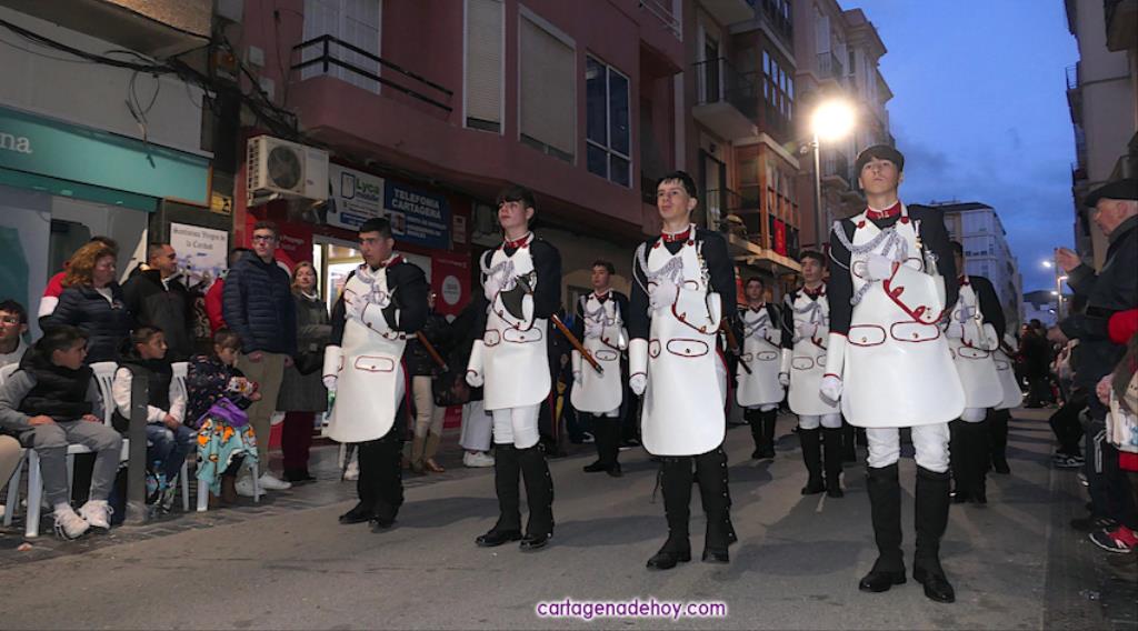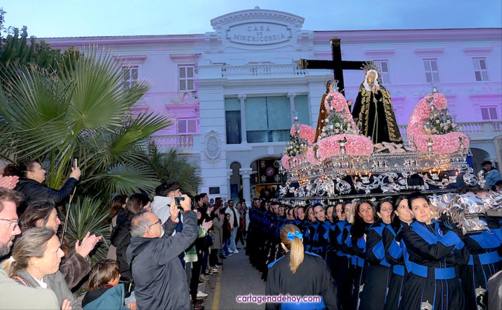 El trono que lleva el único grupo de 140 damas portapasos de la Cofradía Marraja, creado en 2002, cruzar la histórica puerta y bajar por la calle del Duque, incorporándose en la calle de la Caridad a la procesión, que diez minutos antes ha iniciado su marcha desde la iglesia de Santa María, con el grupo de la cofradía en cabeza, yendo detrás los cadetes de los granaderos y el Santo Cáliz (omnipresente en todos los desfiles marrajos) con el antiguo ‘carro bocina’ de la hermandad.
