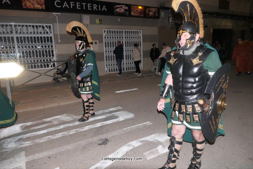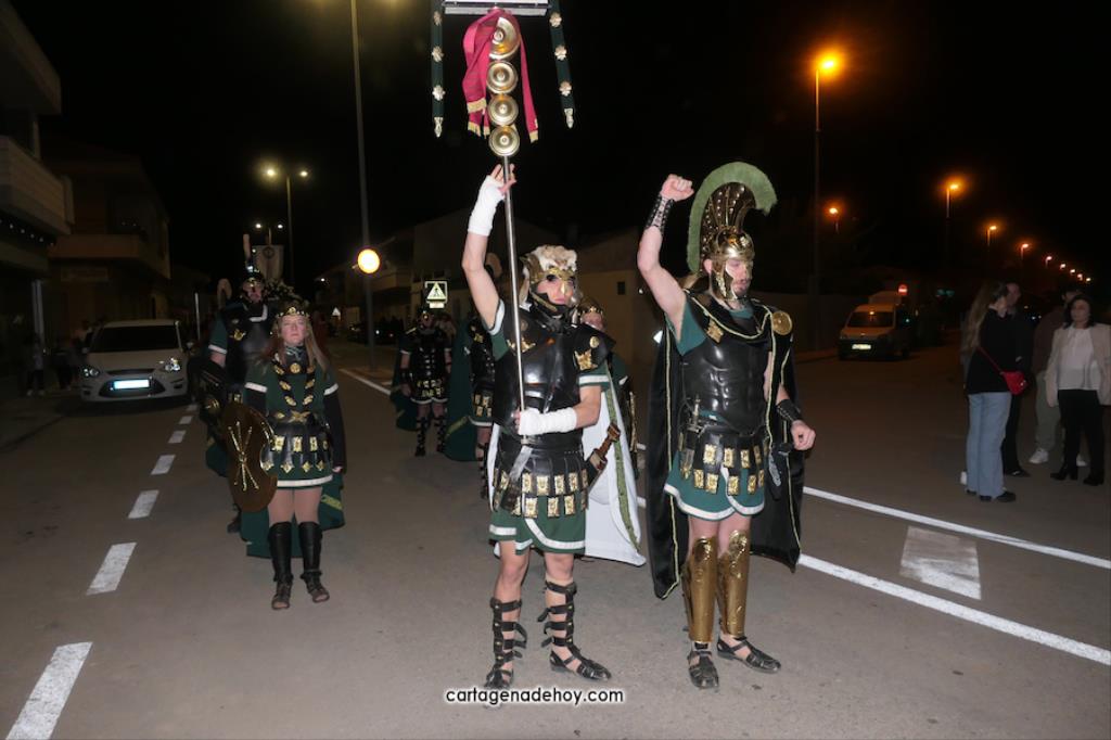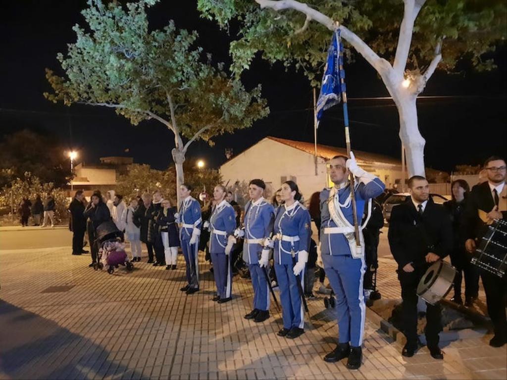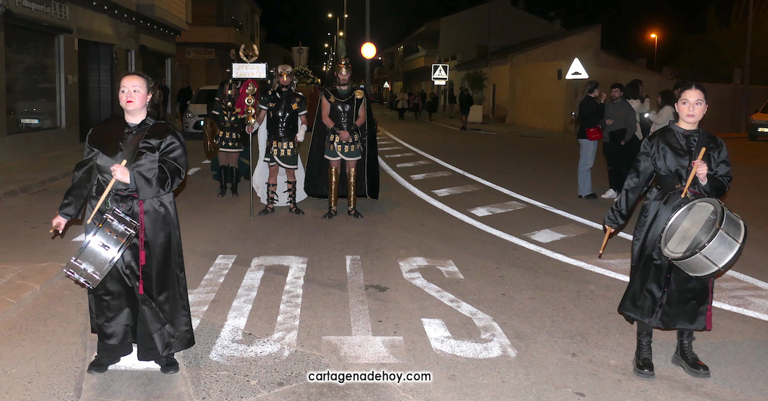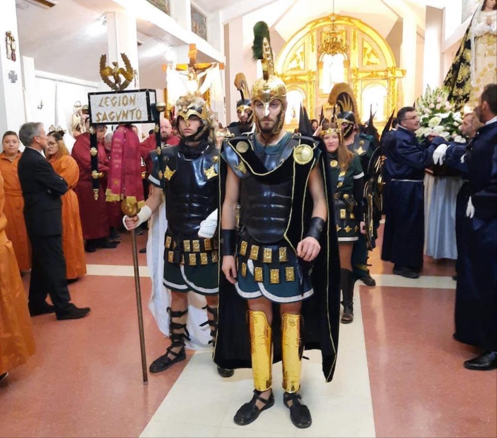 En el cortejo pasionario, que abren dos chicas a golpe de tambor, hay una escuadra de la Legión de Sagunto de Carthagineses y Romanos representando a los 'judíos' de la época y también desde 2017, un quinteto de la Escolta y Honores de la Cofradía de Jesús Resucitado abriendo paso a la Virgen. Este año ha sido novedad la presencia de tres integrantes de la Cofradía de las Ánimas de La Palma, con la que se están estableciendo vínculos (el pasado año procesionistas poblenses estuvieron en la procesión del cementerio palmesano) por parte de la Cofradía del Cristo de la Agonía.