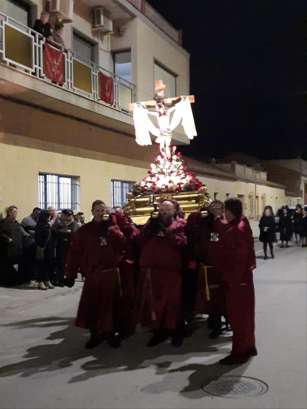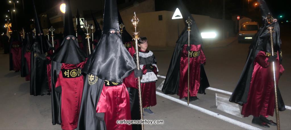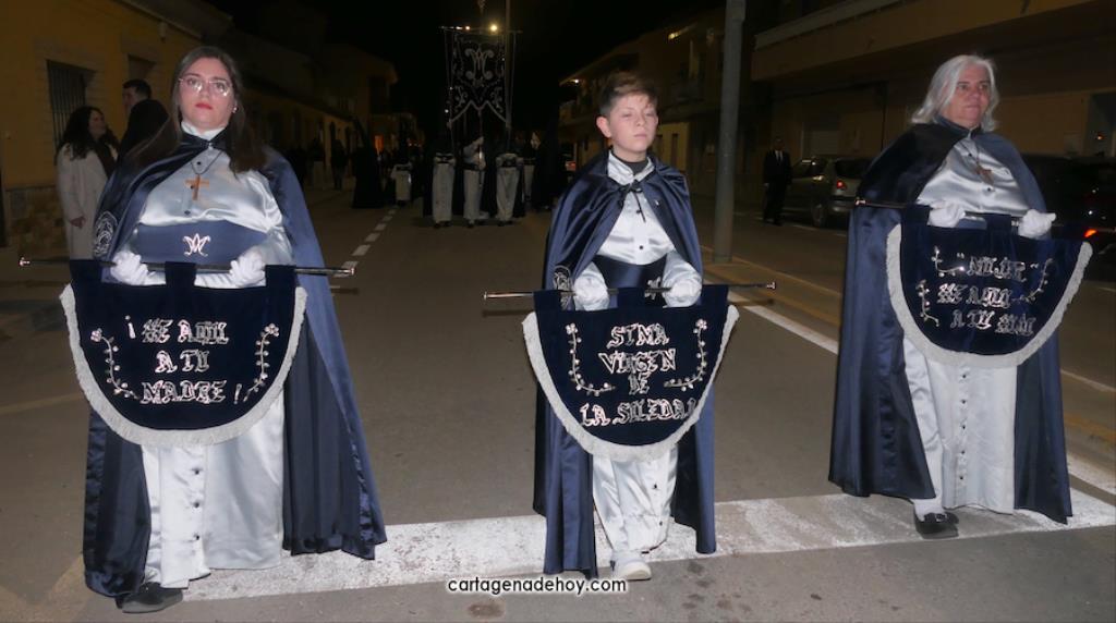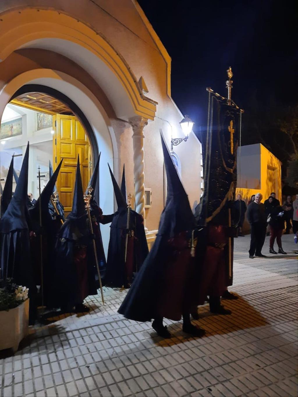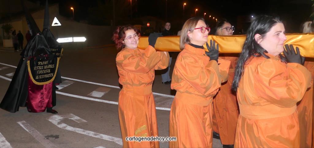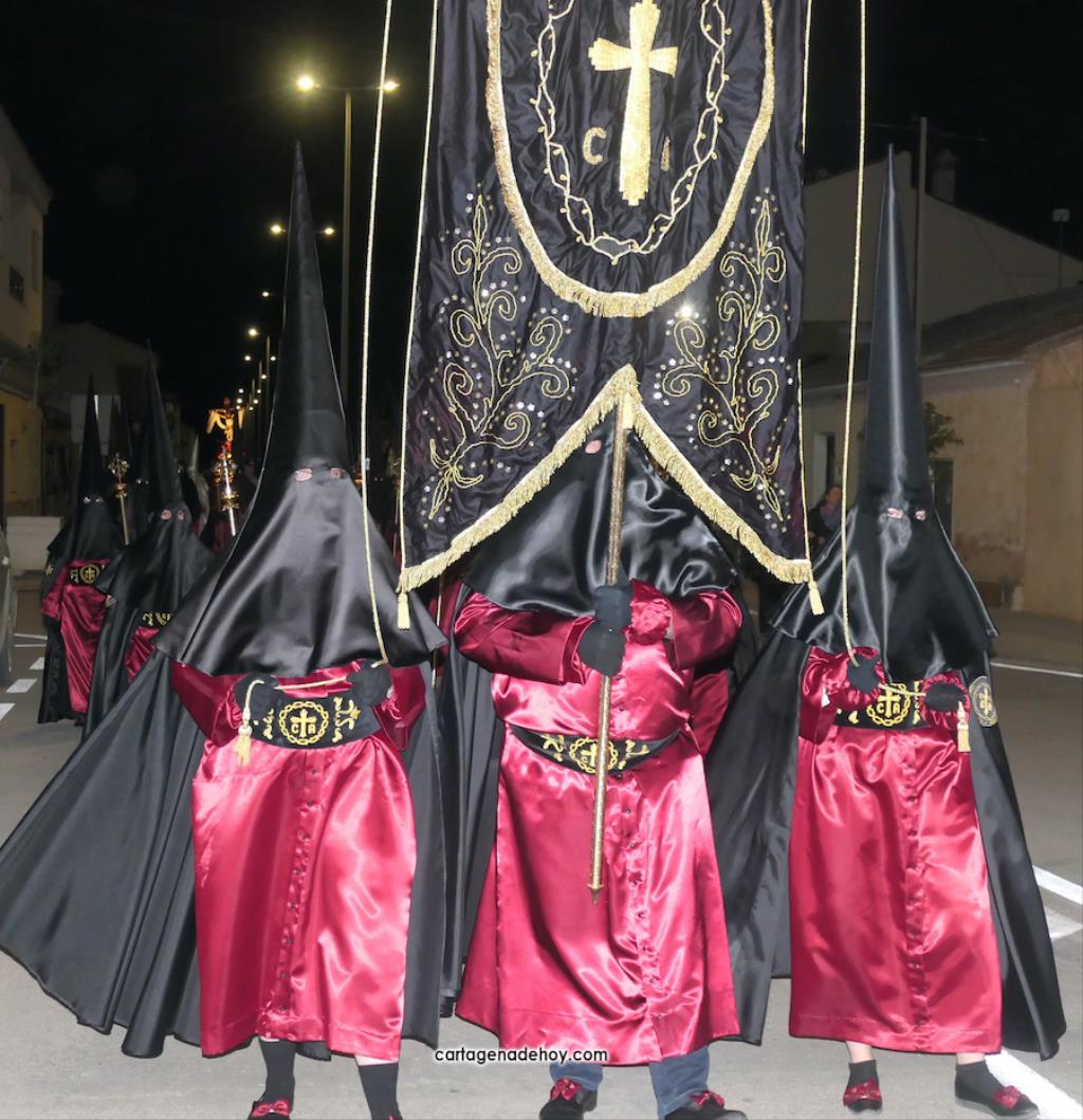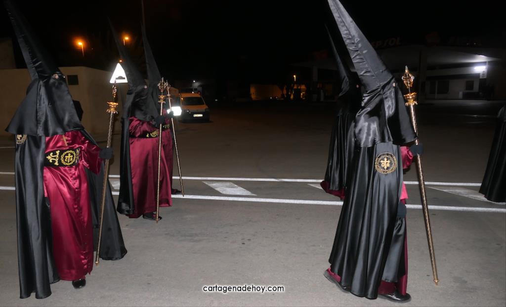 Mujeres portan el primer trono, la Cruz Vacía, insignia de la cofradía. Detrás avanza el tercio del Cristo de la Agonía (talla del siglo XVIII), cerrando el cortejo de los penitentes, imagen y portapasos de la Virgen. Las tres peanas van a hombros, siendo llevados los dos últimos por varones.