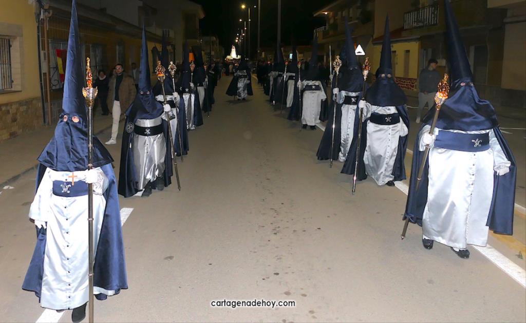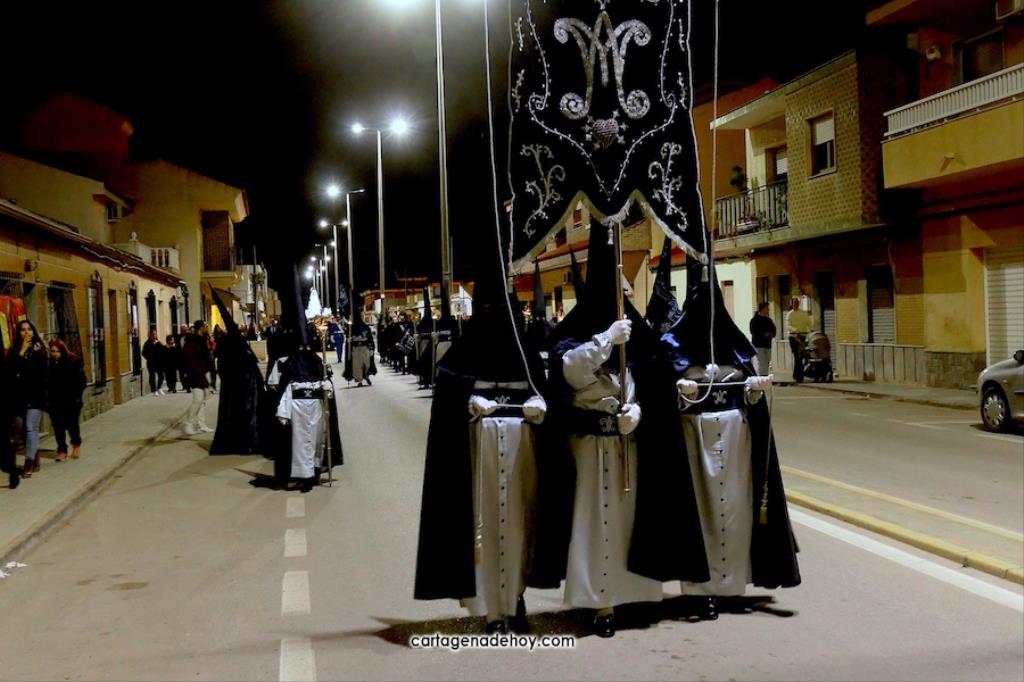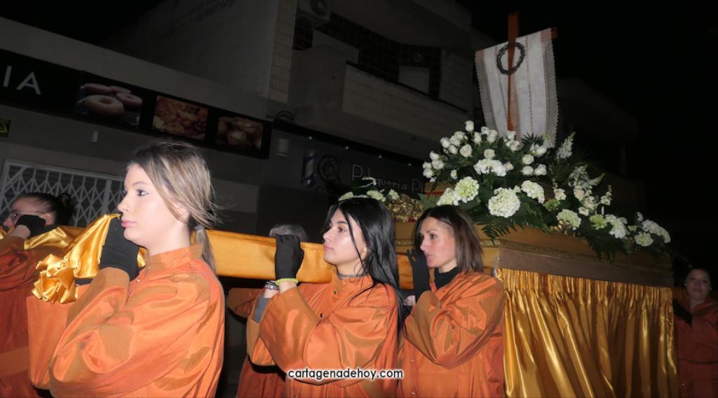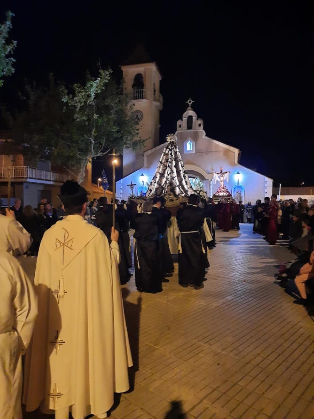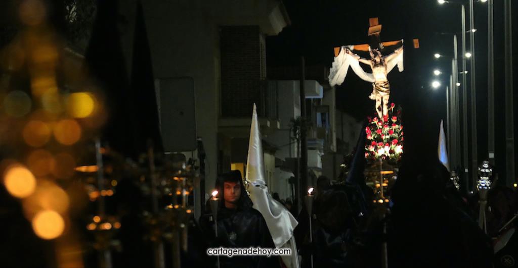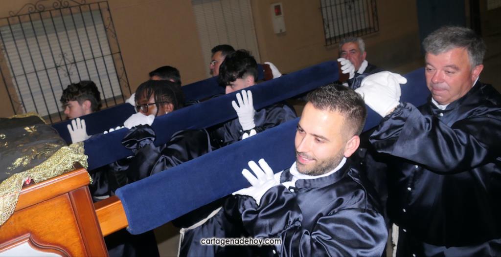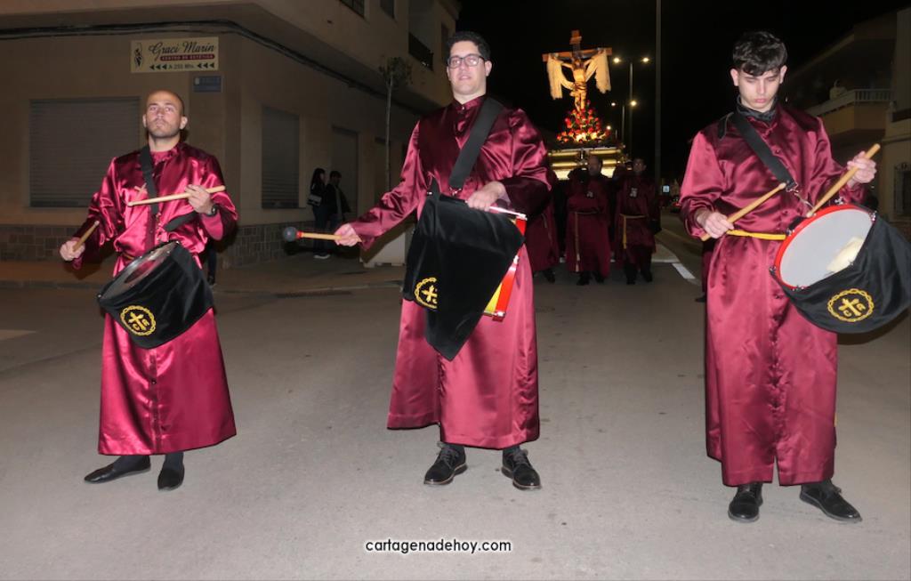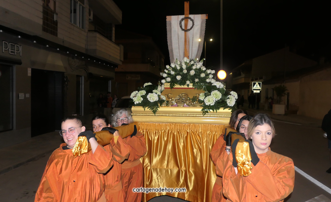 Mujeres portan el primer trono, la Cruz Vacía, insignia de la cofradía. Detrás avanza el tercio del Cristo de la Agonía (talla del siglo XVIII), cerrando el cortejo de los penitentes, imagen y portapasos de la Virgen. Las tres peanas van a hombros, siendo llevados los dos últimos por varones.