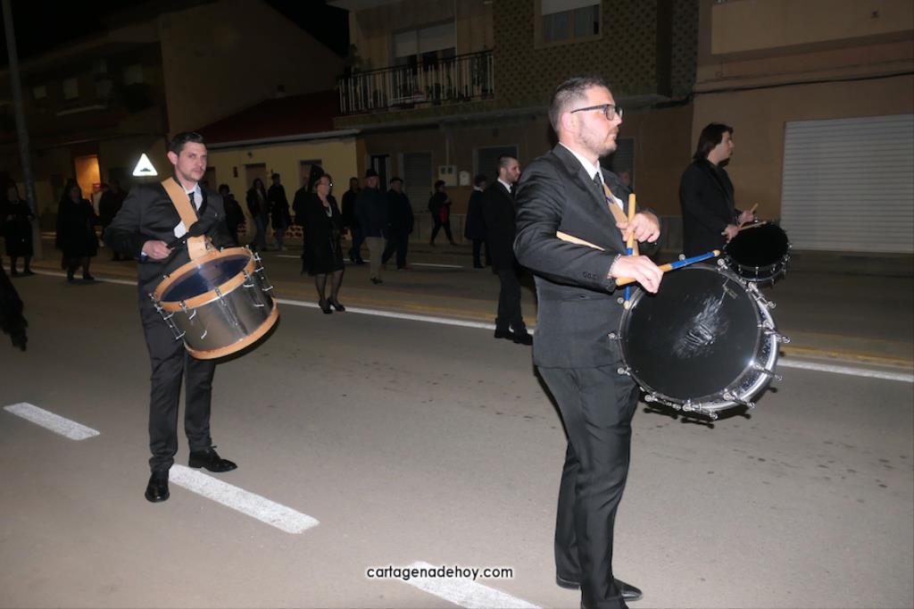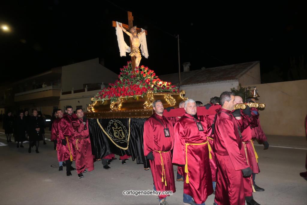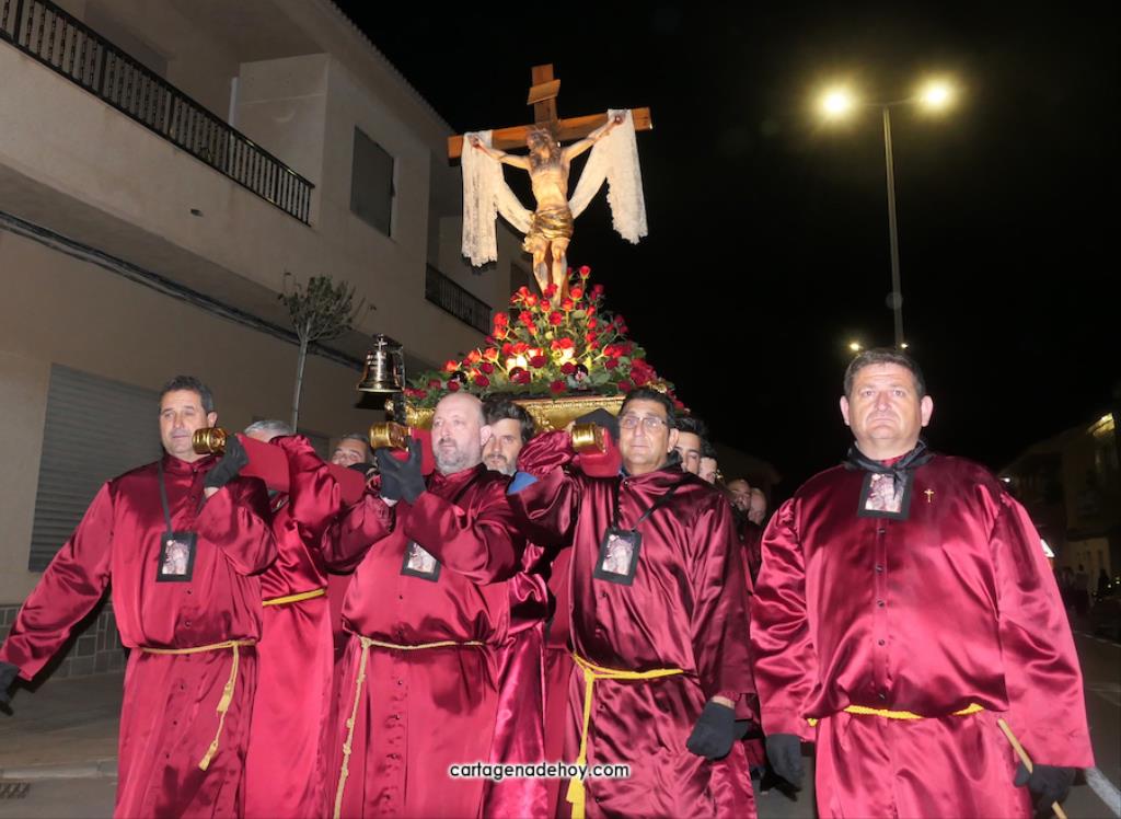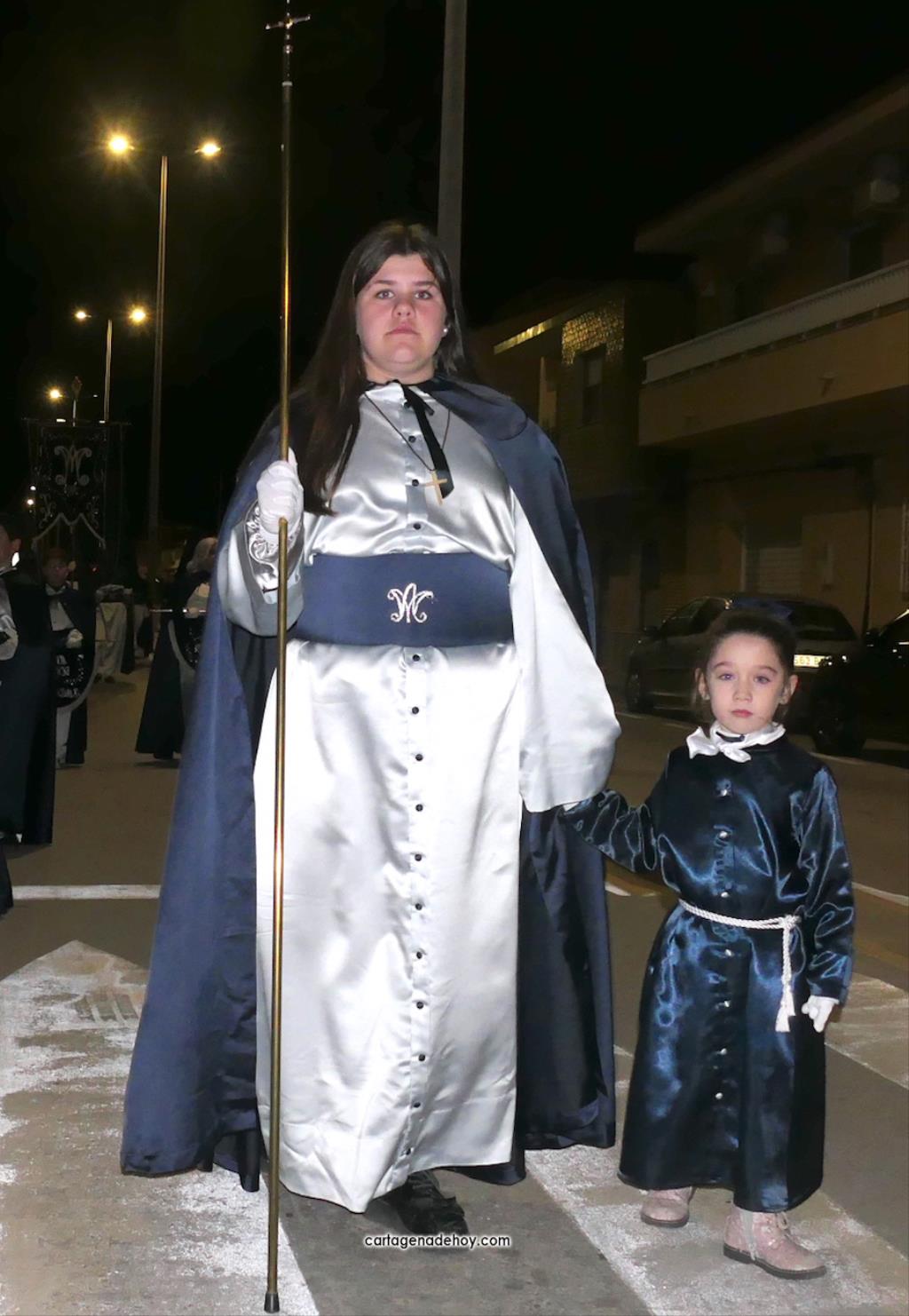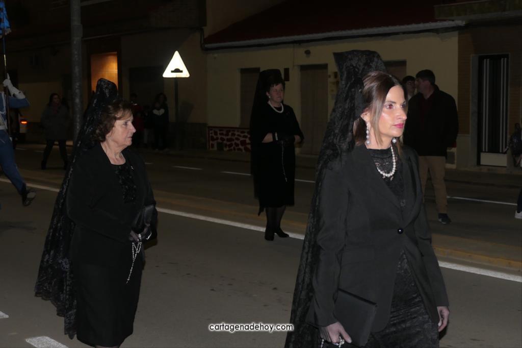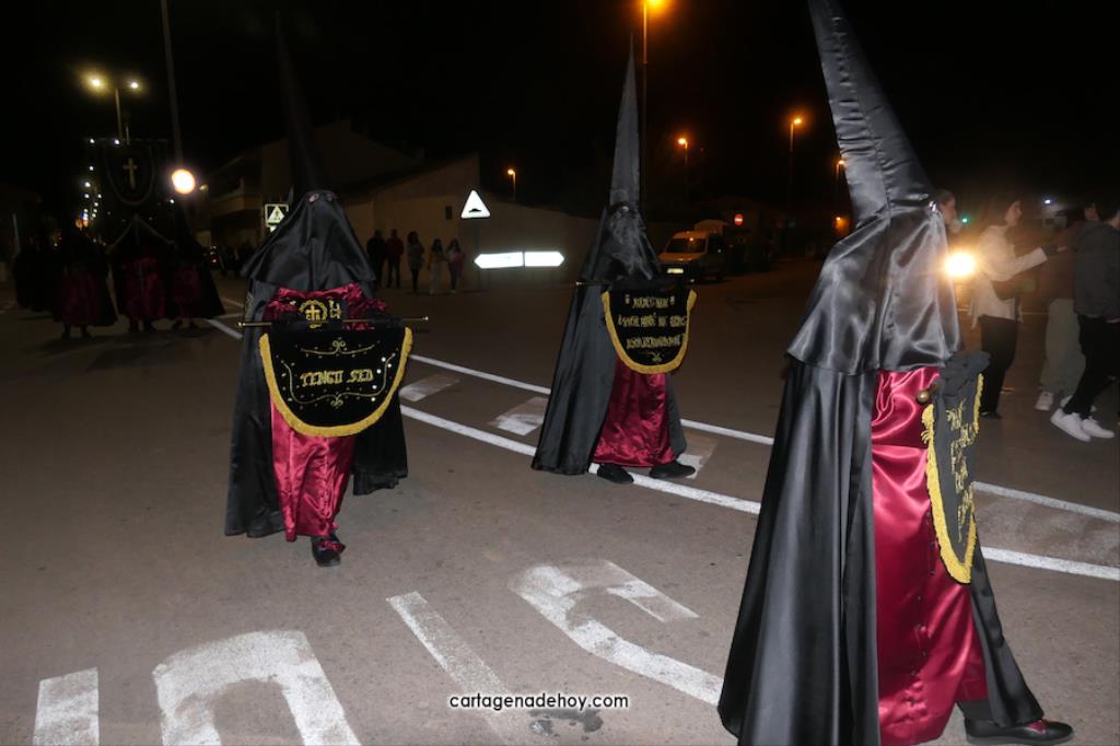 Mujeres portan el primer trono, la Cruz Vacía, insignia de la cofradía. Detrás avanza el tercio del Cristo de la Agonía (talla del siglo XVIII), cerrando el cortejo de los penitentes, imagen y portapasos de la Virgen. Las tres peanas van a hombros, siendo llevados los dos últimos por varones.