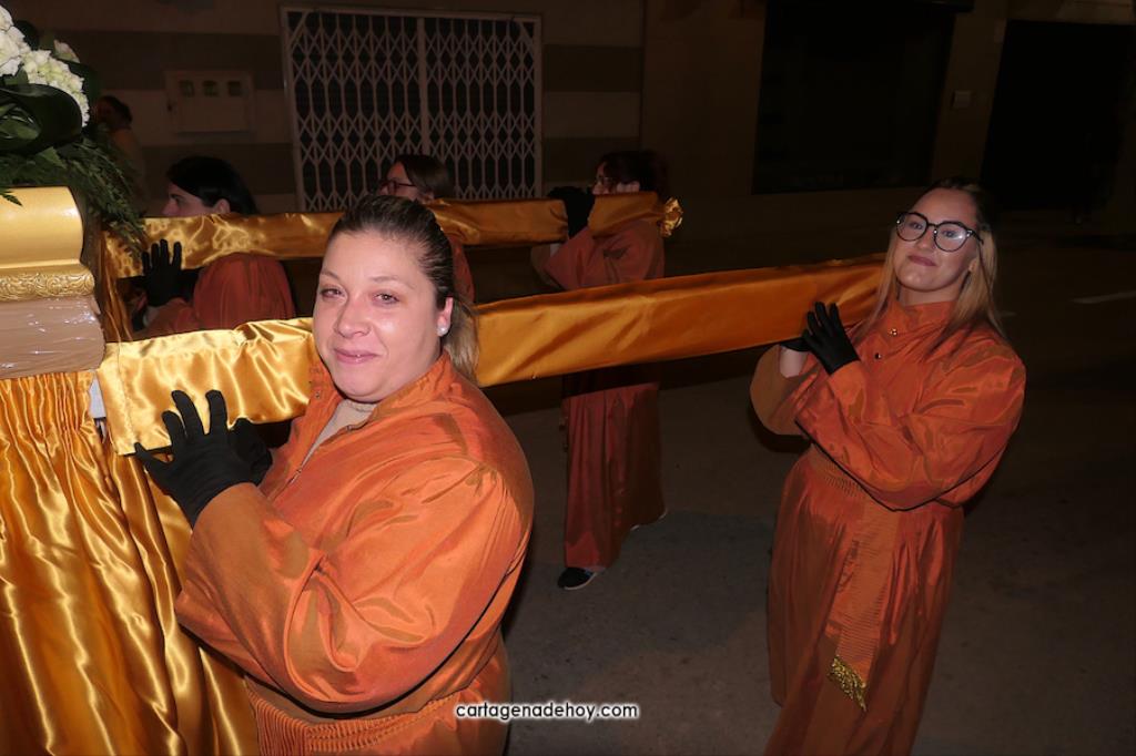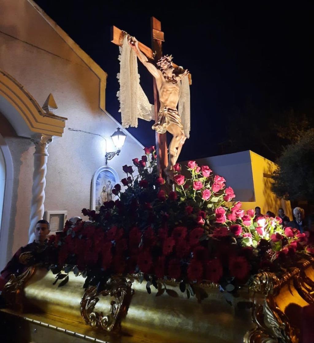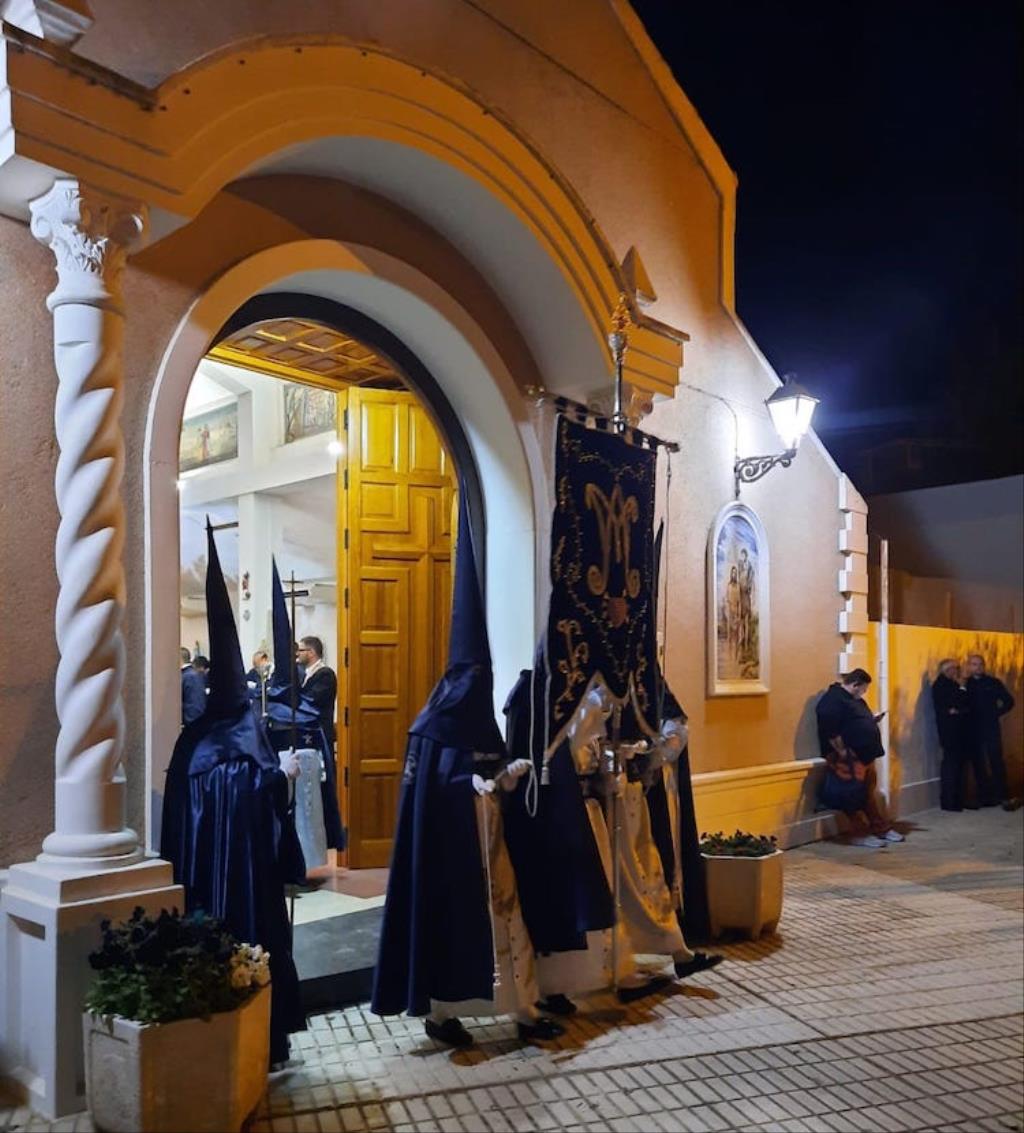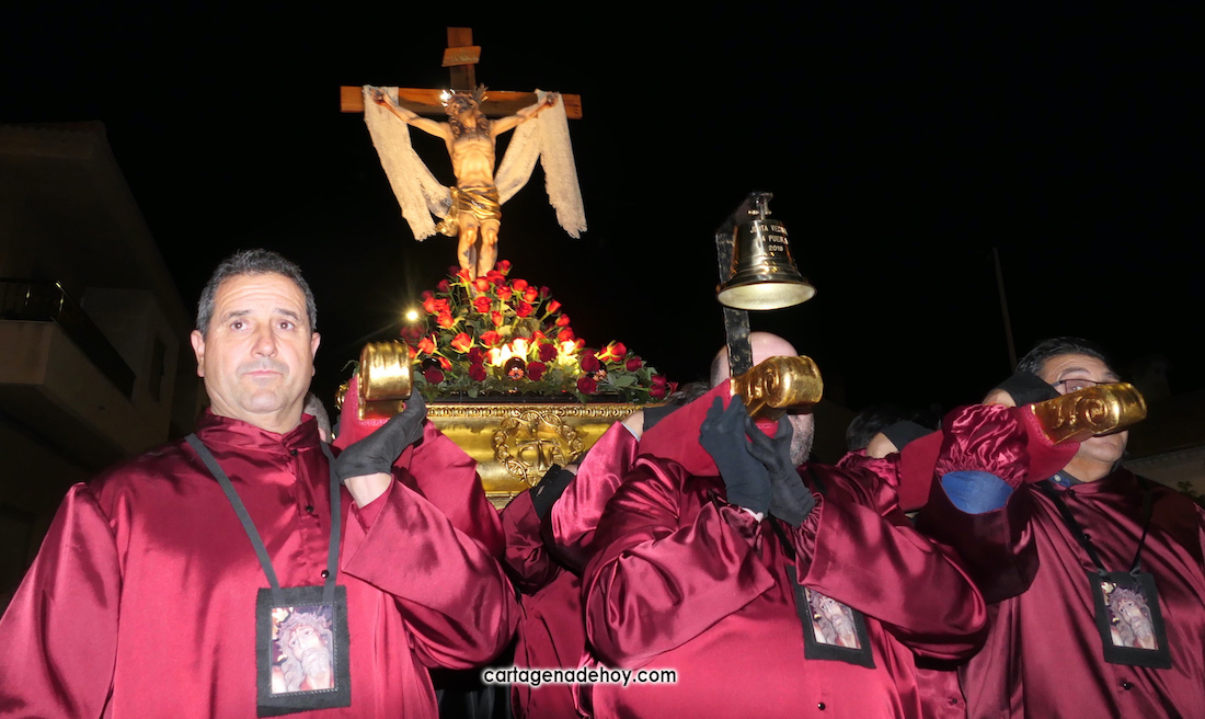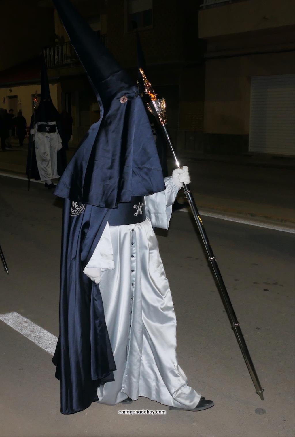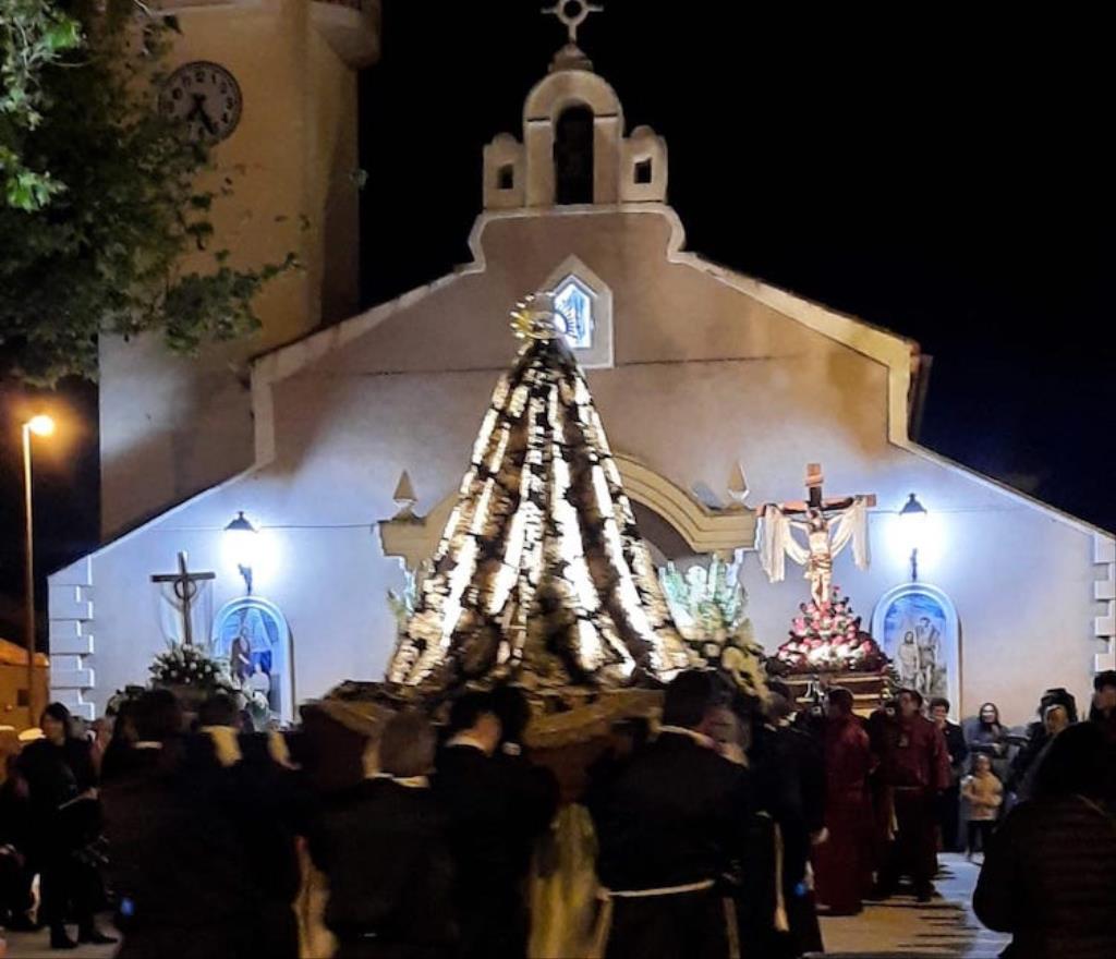 Mujeres portan el primer trono, la Cruz Vacía, insignia de la cofradía. Detrás avanza el tercio del Cristo de la Agonía (talla del siglo XVIII), cerrando el cortejo de los penitentes, imagen y portapasos de la Virgen. Las tres peanas van a hombros, siendo llevados los dos últimos por varones.