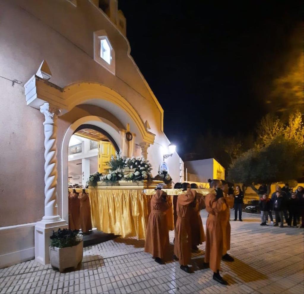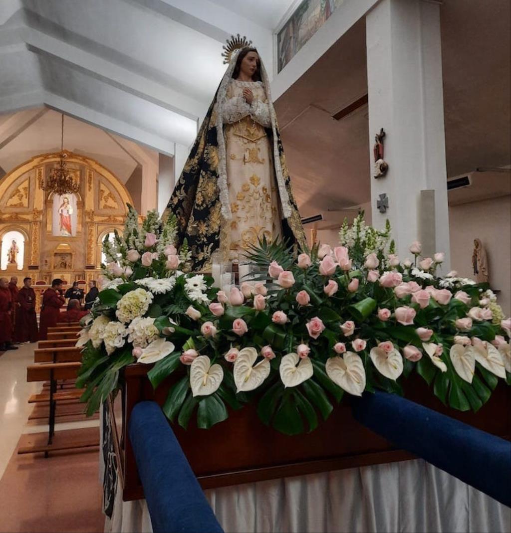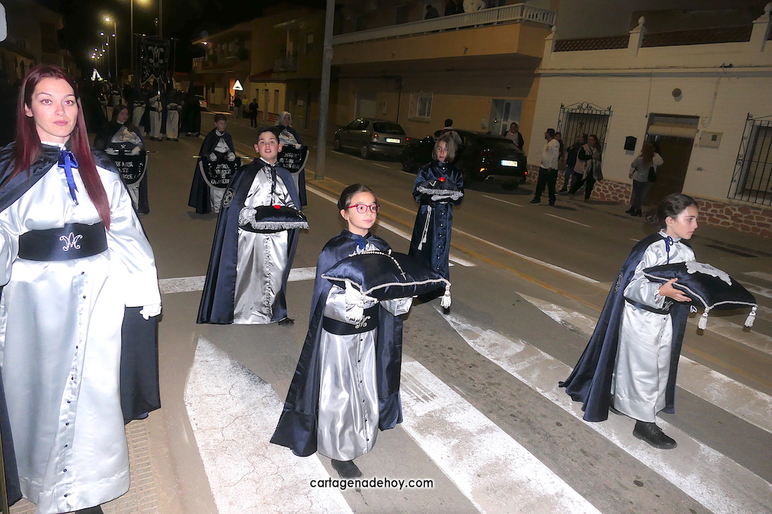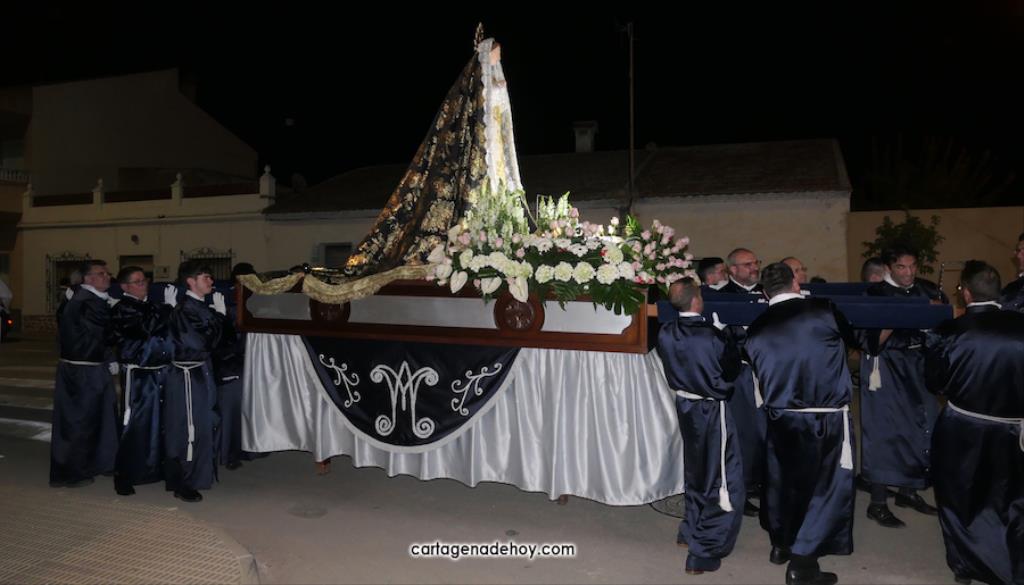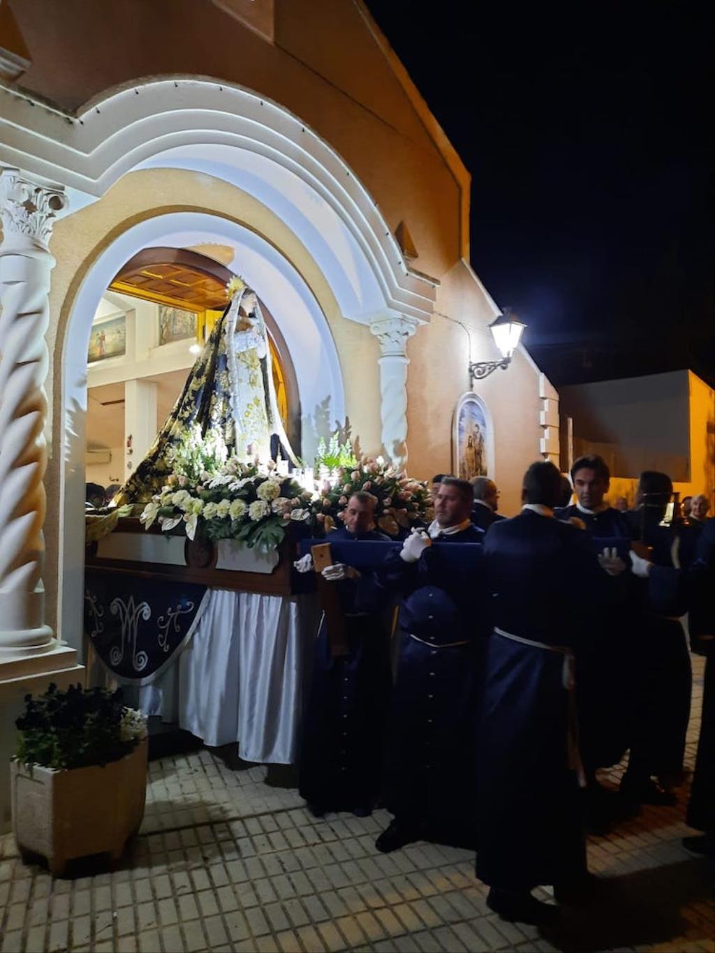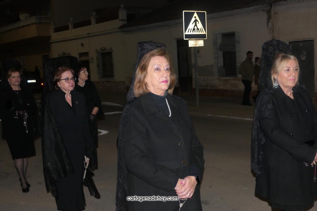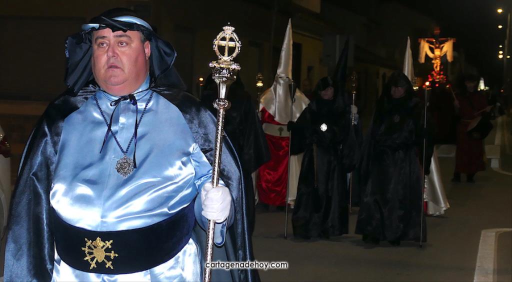 Mujeres portan el primer trono, la Cruz Vacía, insignia de la cofradía. Detrás avanza el tercio del Cristo de la Agonía (talla del siglo XVIII), cerrando el cortejo de los penitentes, imagen y portapasos de la Virgen. Las tres peanas van a hombros, siendo llevados los dos últimos por varones.