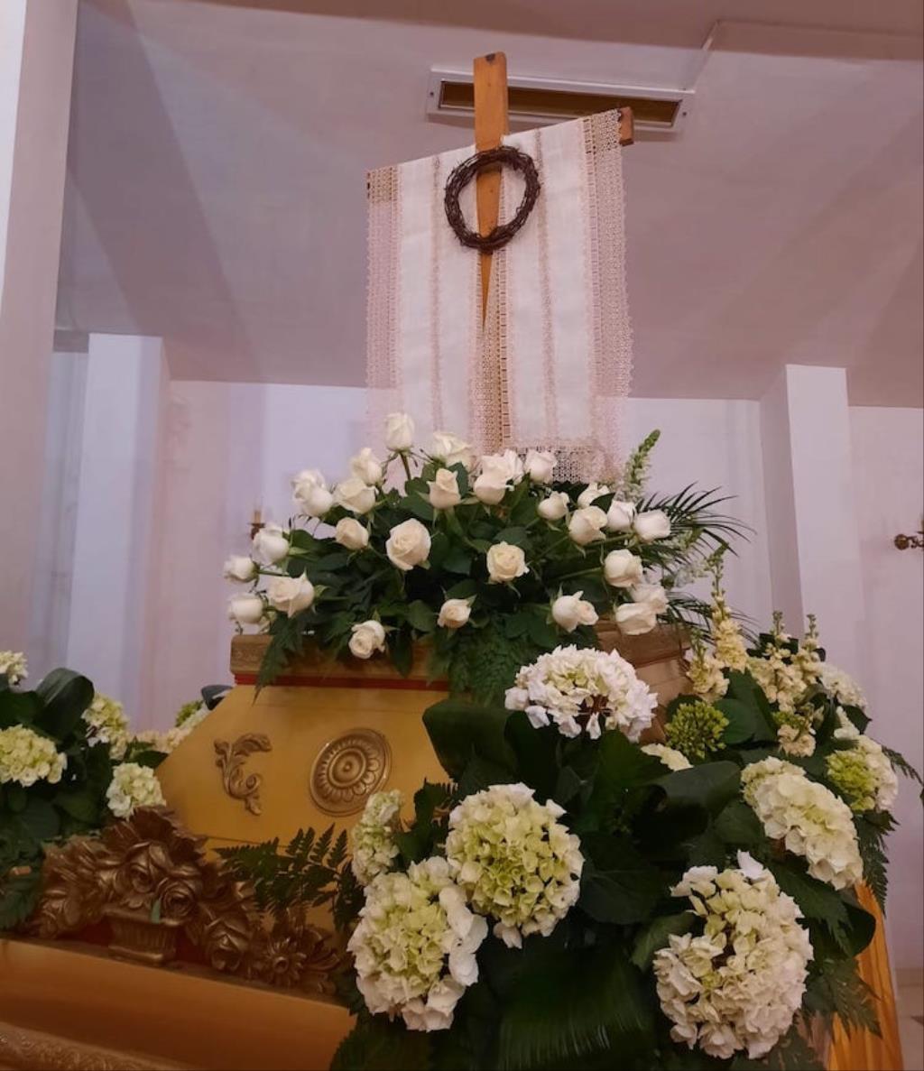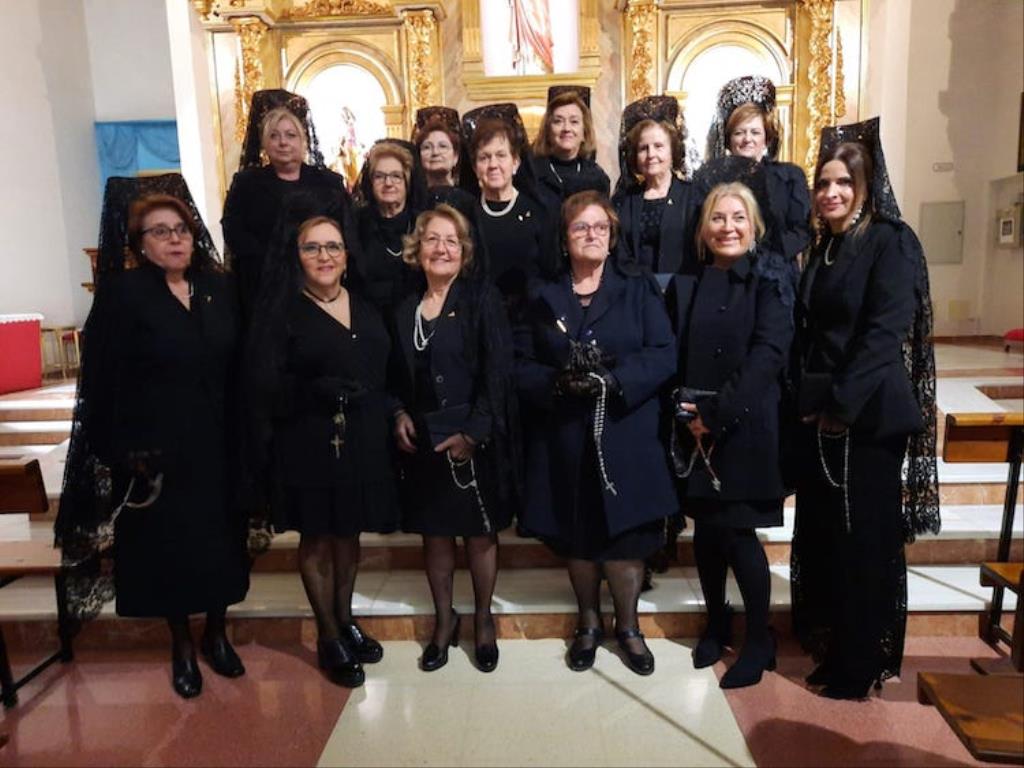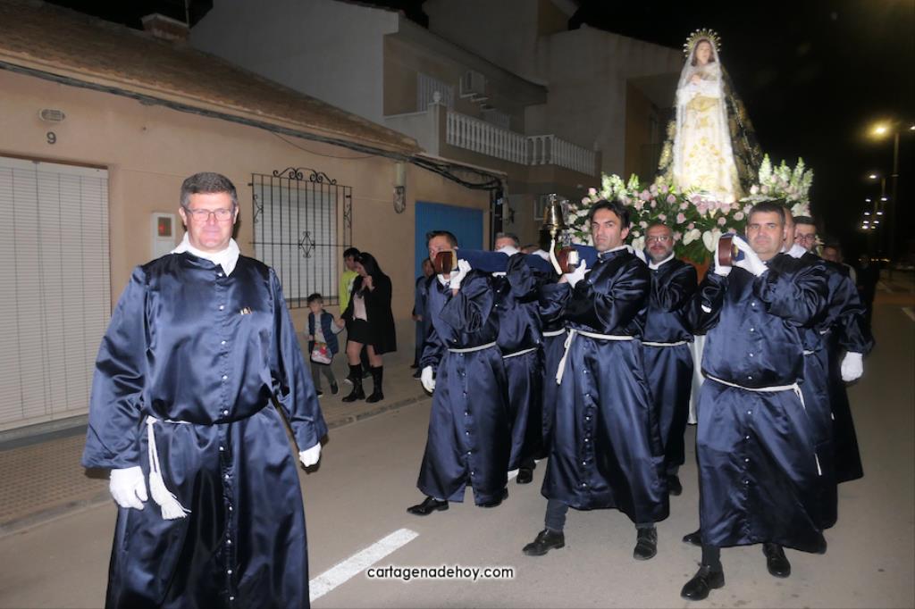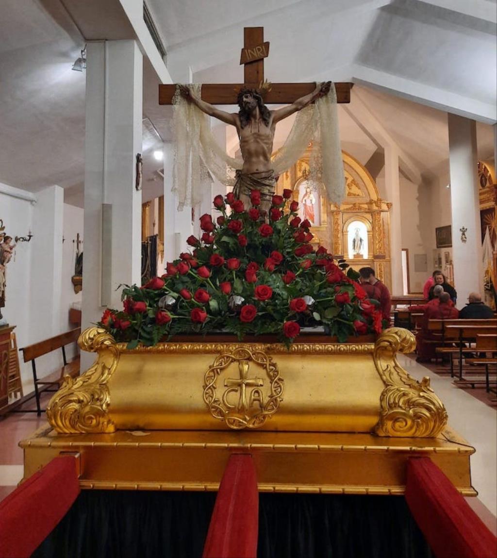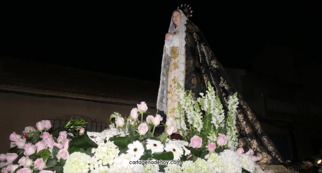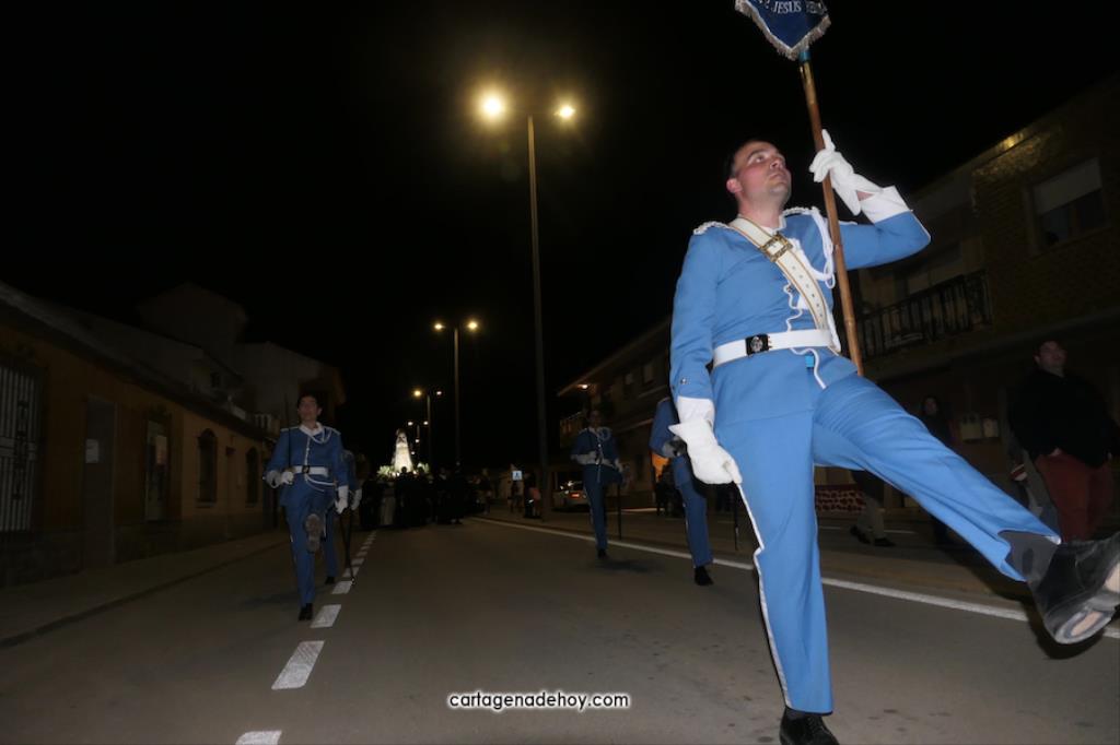 Mujeres portan el primer trono, la Cruz Vacía, insignia de la cofradía. Detrás avanza el tercio del Cristo de la Agonía (talla del siglo XVIII), cerrando el cortejo de los penitentes, imagen y portapasos de la Virgen. Las tres peanas van a hombros, siendo llevados los dos últimos por varones.