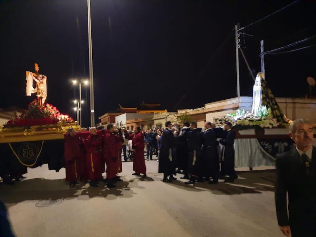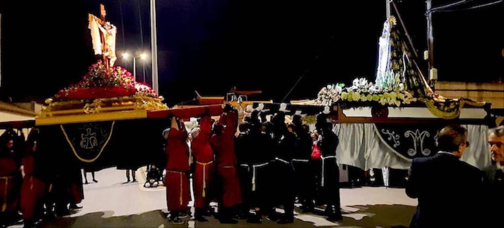 El momento más esperado es el 'Encuentro'. La Virgen que talló en 1998 el escultor Juan José Quirós se separa del cortejo principal, para después salir al paso frente a su hijo crucificado, alzando los portapasos ambos tronos mientras aplauden los espectadores y se canta la Salve Popular. Tras las saetas, el desfile se reanuda con dirección a la iglesia, donde la recogida ofrece nuevas escenas cargadas de sentimiento y júbilo.