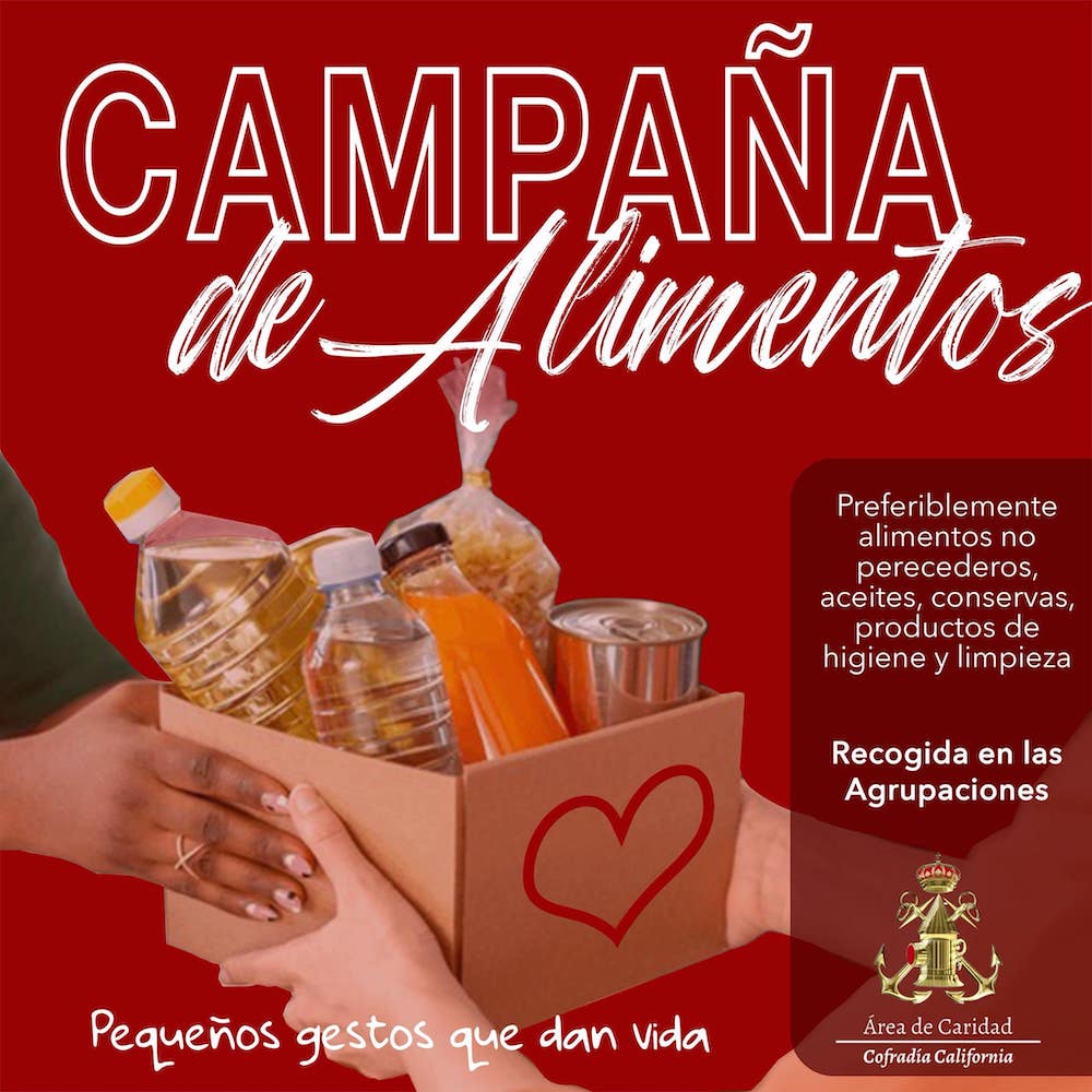 Por otro lado, indicar que comienza la tradicional 'Campaña de recogida de alimentos' que lleva a cabo el área de Caridad de la Cofradía California en colaboración con las agrupaciones. Preferiblemente, se demandan alimentos no perecederos; tales como el aceite, conserva, productos de higiene y limpieza. Todas las donaciones se depositarán en las agrupaciones. Posteriormente, en coordinación con el área de Caridad de la cofradía, se seleccionarán y categorizarán los alimentos para su posterior entrega a entidades sociales de Cartagena.