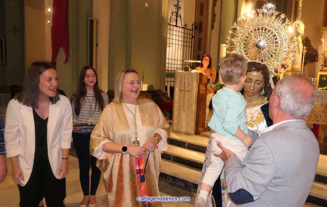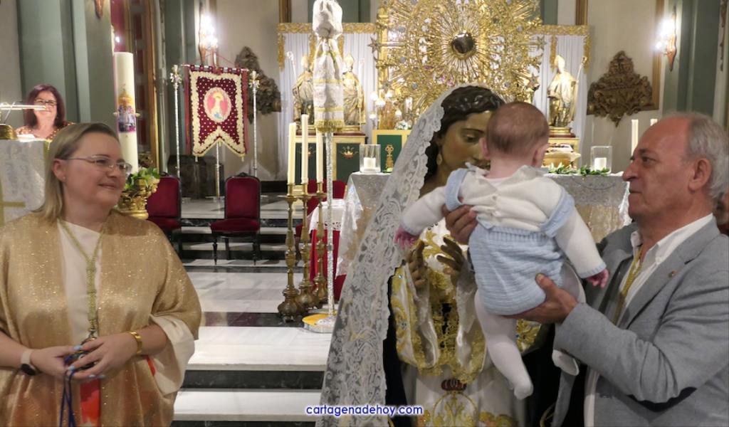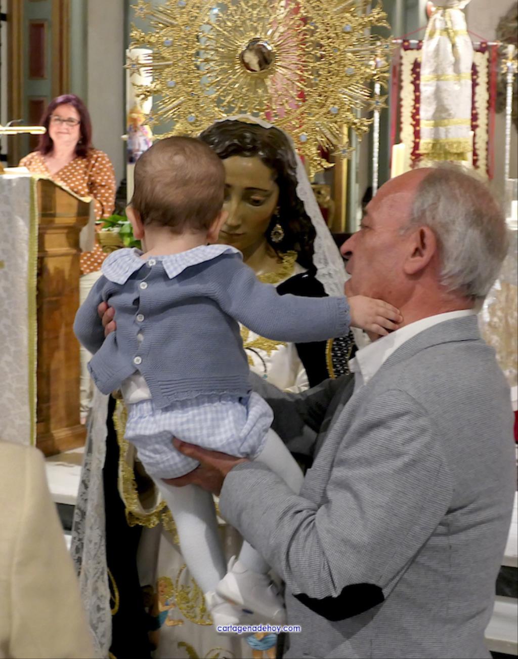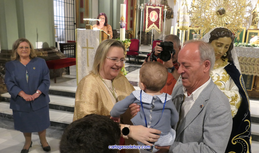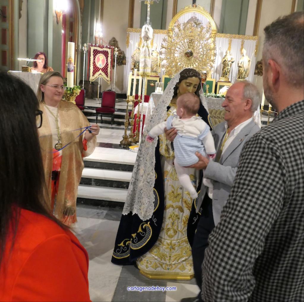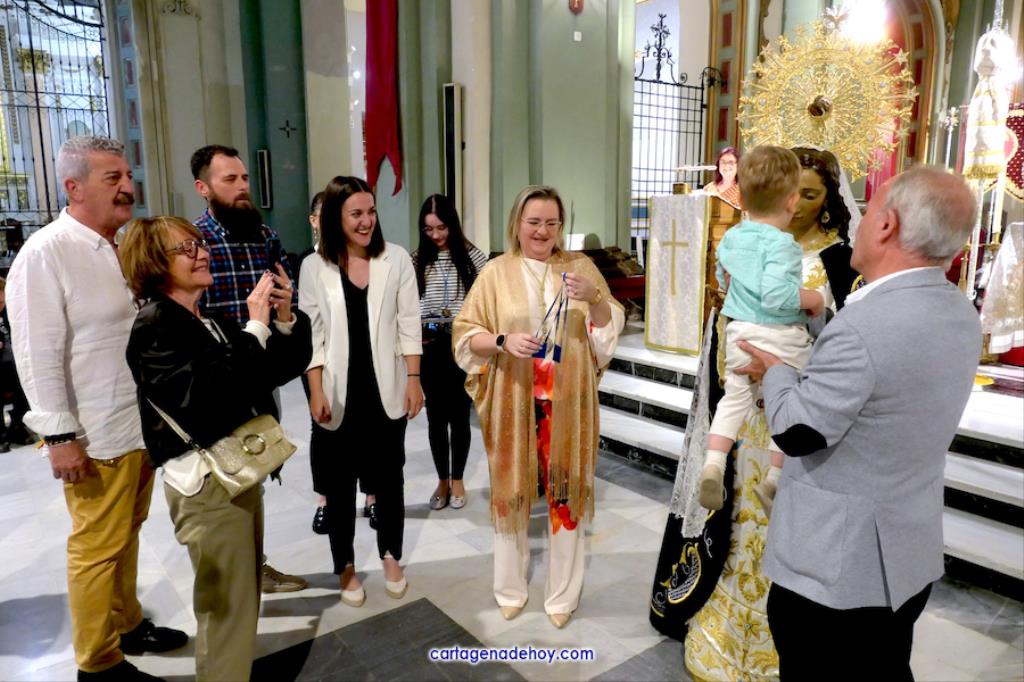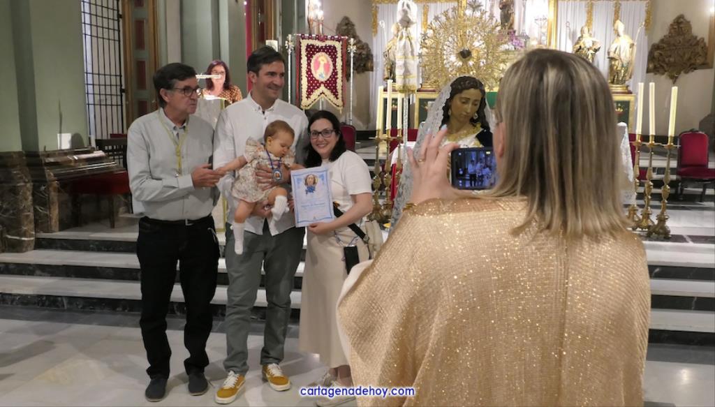 A continuación, las familias, especialmente los padres, fueron llevando a sus pequeños ante la talla, siendo el presidente de la agrupación, Emilio Ros, quien los cogía y se los mostraba a la Virgen, acercándolos para que la pudieran tocar. Después, la hermana mayor de la hermandad, Marén García Boj, les imponía a cada uno el escapulario bendecido y le entregaba la patente de hermano. Dulce Sánchez González, como secretaria de la agrupación, era quien, desde el altar, iba nombrando a cada niño.