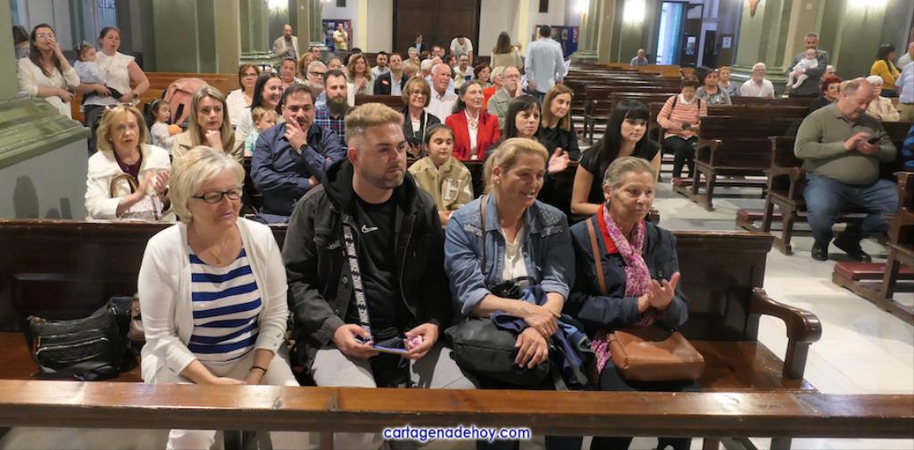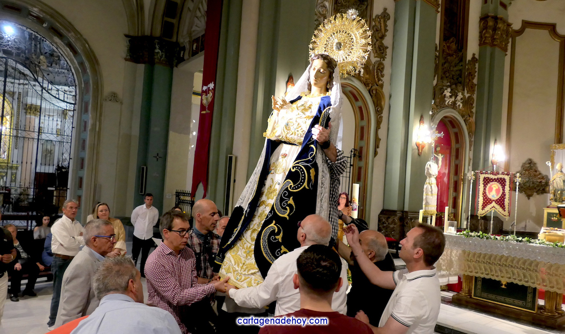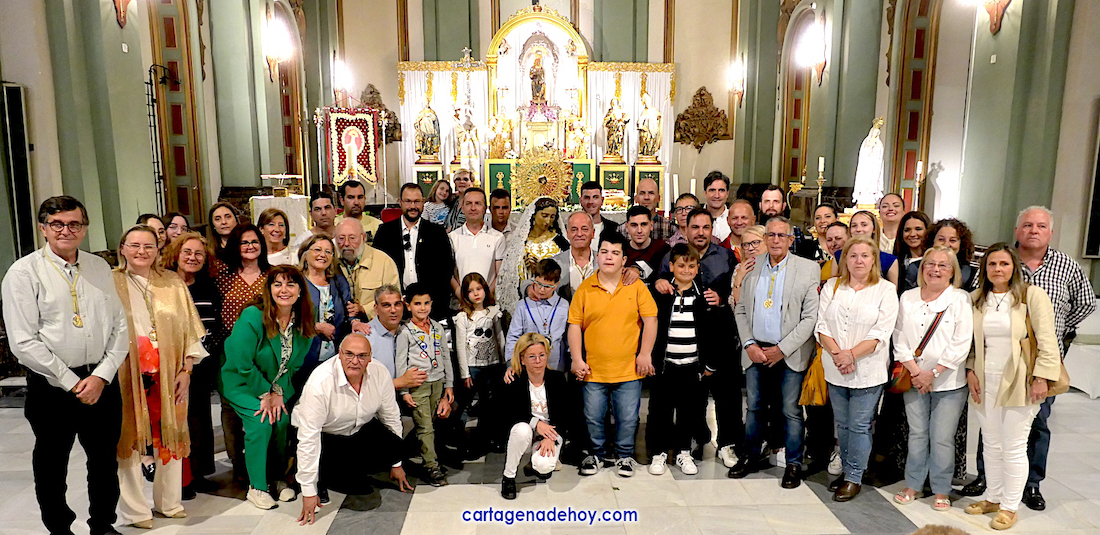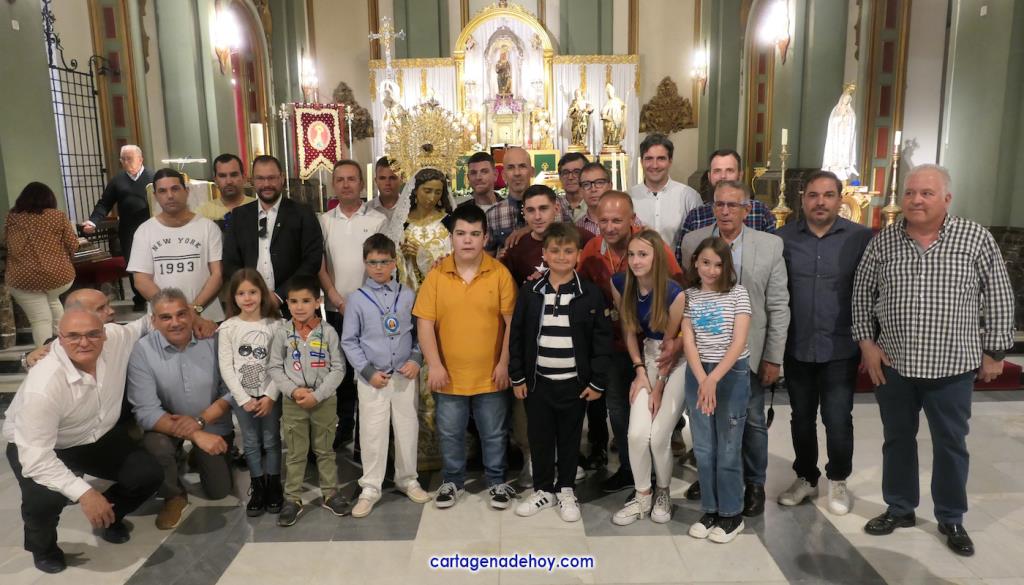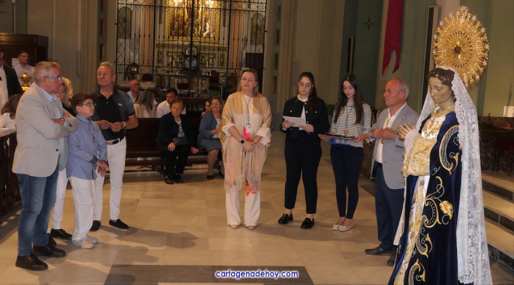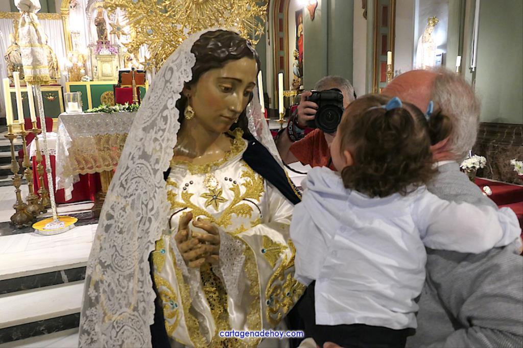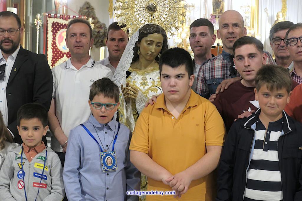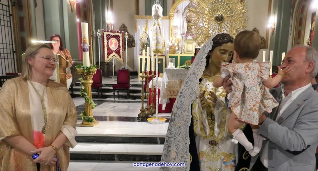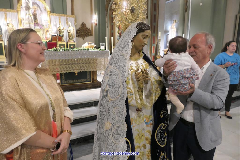 A continuación, las familias, especialmente los padres, fueron llevando a sus pequeños ante la talla, siendo el presidente de la agrupación, Emilio Ros, quien los cogía y se los mostraba a la Virgen, acercándolos para que la pudieran tocar. Después, la hermana mayor de la hermandad, Marén García Boj, les imponía a cada uno el escapulario bendecido y le entregaba la patente de hermano. Dulce Sánchez González, como secretaria de la agrupación, era quien, desde el altar, iba nombrando a cada niño.
