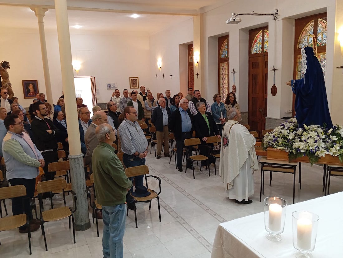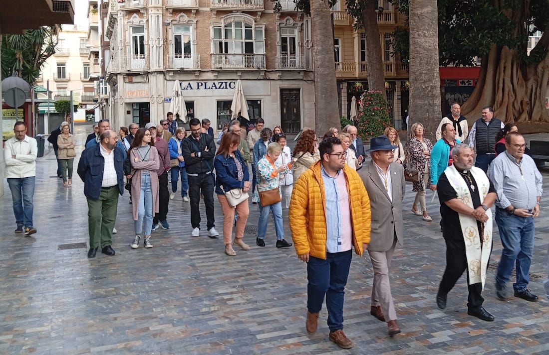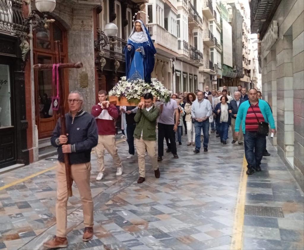 Desde allí, han ido rezando los misterios gozosos por las calles del Casco Histórico de Cartagena hasta llegar a la Capilla del Colegio del Patronato del Sagrado Corazón de Jesús donde D. Lázaro Gomáriz López, capellán de la cofradía, ha oficiado una Eucaristía.